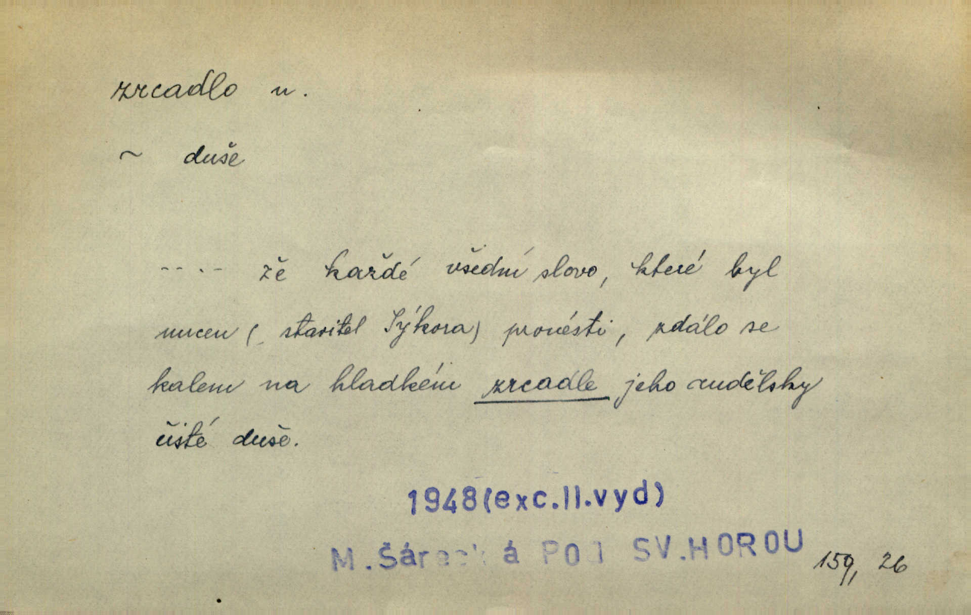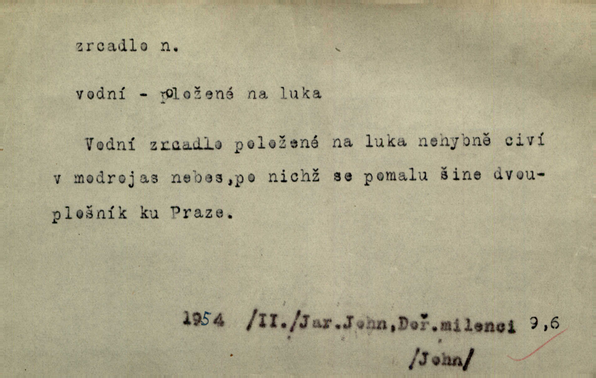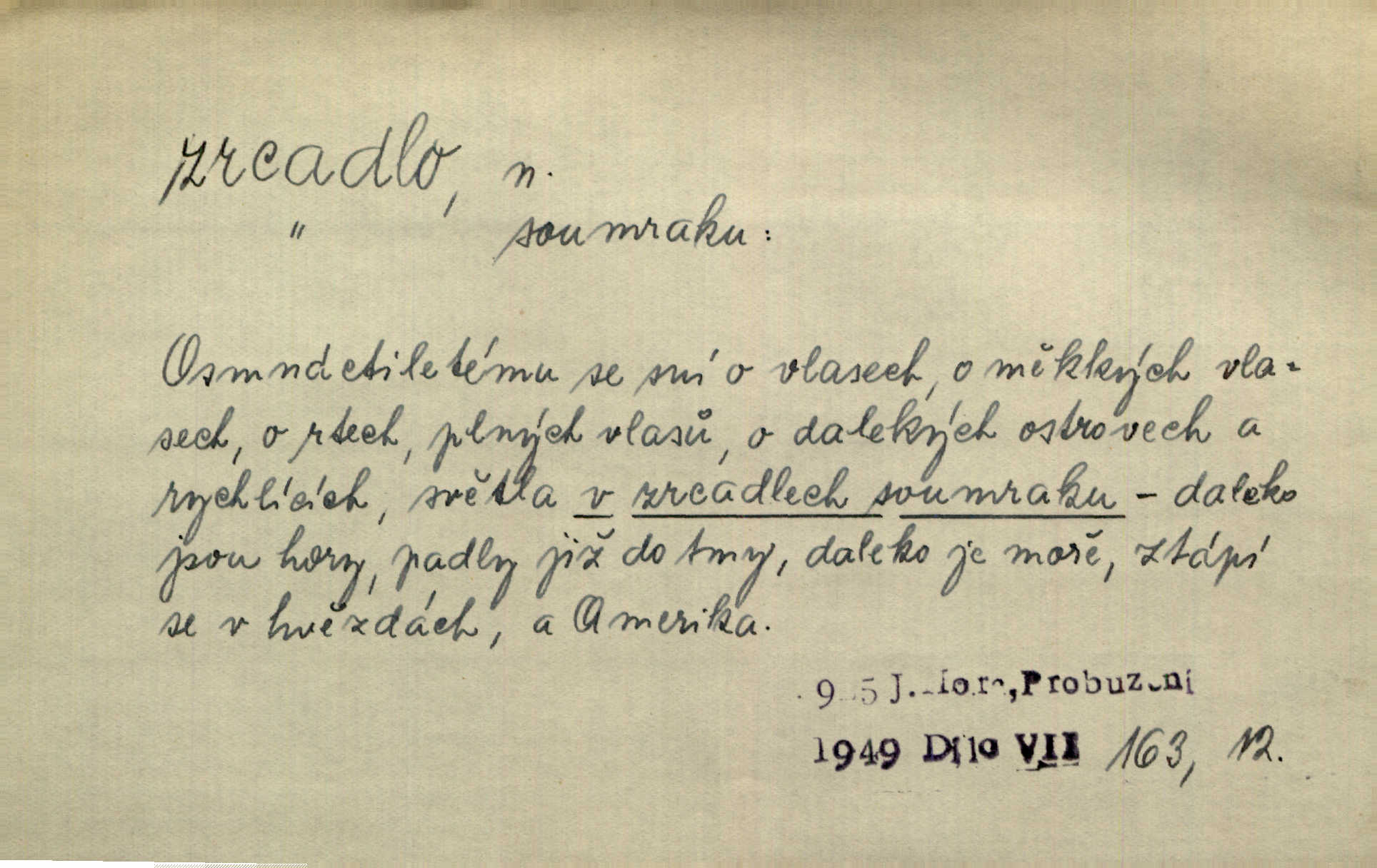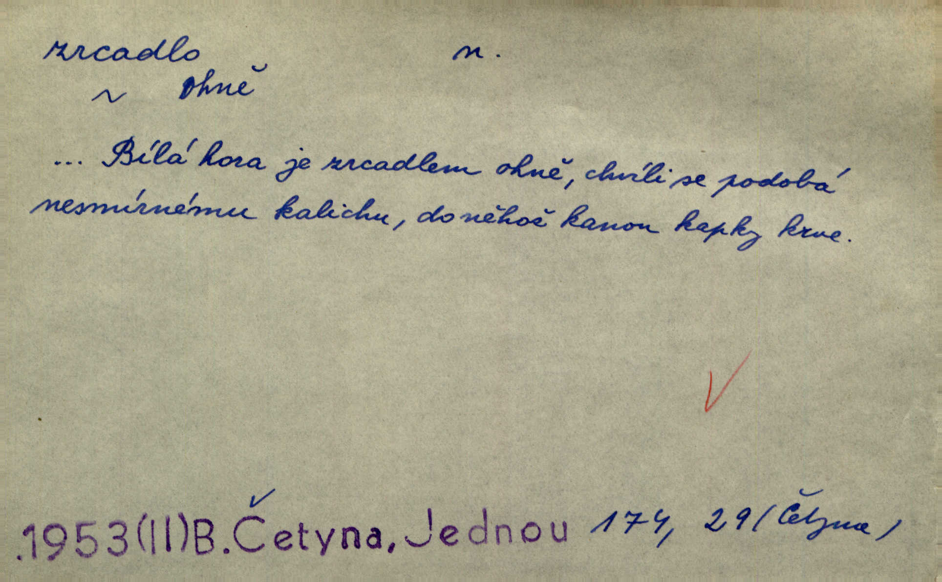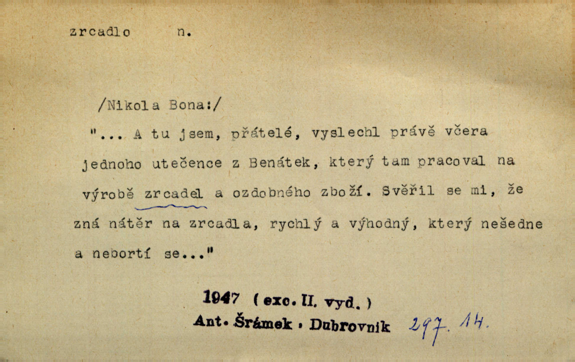 - zrcadlo, -a n. skleněná deska, uzpůsobená nanesením lesklé kovové vrstvy na spodní plochu k vytváření plošného obrazu předmětu, před ní postaveného, odražením paprsků. Poskočila s jedné nohy na druhou a vyplázla na sebe do zrcadla jazyk. K. J. Ben. I přiložili matce zrcadlo k ústům, zdali se zarosí a zdali matka žije. Herb. Zrcadla planou a sklenice řinčí [v kavárně]. K. Čap. Moravský průmysl skla a zrcadel. Úř. l. Mlýn stojí až dole v rovině, která jako zrcadlo leží až k Ronovu a Rožďalovicům rovná. Mach. Vše stopeno ve lůno vod, jak v zrcadle se zhlíží. Mácha. Krátká srsť [hřebice] byla uhlazena a zrcadlem se leskla. Hol. Byly [boty] jako zrcadlo leskly se. Jir. A chystá se to [mráz], západ je jako zrcadlo vyjasněný, čistý. Rais. Pěstounka a s chovanka se do sebe hleděly jako do zrcadla měly se rády. Svět. Klotilda viděla na babičce jako v zrcadle, že paráda a marnost člověka nesytí a neživí jasně, zřetelně. Prav. Vláda pronásledující a utlačující opposiční noviny sama rozbíjí neklamné zrcadlo, ve kterém by viděti mohla pravé vady své. Havl. Žádné zrcadlo bez prášku není každý má nějakou chybu. Čech. Tys mi při přelíčení podržel zrcadlo, že jsem sebe v něm viděl tak, jaký jsem pověděl pravdu. Šmil. Expr. lid. Neuvidí skvrny na mém oděvu ani zrcadla, jimiž se honosily mého kabátu lokte a kolena mých spodků odřená, lesklá místa látky. Klost. Přen. Zrcadlo vzpomínek mu vypadlo z dlaní a rozbilo se nebyl schopen vzpomínati. K. J. Ben. Tech. hladká pravidelná plocha, která odráží světlo. Rovinné, sférické, parabolické, duté, vypuklé a j. zrcadlo. Výr. benátské zrcadlo. Chem. arsenové, antimonové, stříbrné a j. zrcadlo. Geol. lesklé, uhlazené smykové plochy, zvl. v uhelných vrstvách, vzniklé třením a obrusem mezi porušenými vrstvami. Zrcadla uhlí. Bot., les. dřeňový paprsek dřeva v podobě světlého, často lesklého pruhu, pruh zrcadlový, zrcadélko (na př. u dubu, buku a j.). Dopr. přední část perutě kormidla u nákladních člunů labských, vyplňující prázdný trojúhelníkový kout mezi zádí lodi a pněm kormidla. Stav. vodorovné pole, obyč. obdélníkové, ve vrcholu zrcadlové klenby. Lék. zrcadlo konečníkové, poševní, rozvírací, lžicové a j. Mysl. světlá, zprav. bílá část zakončení trupu zvěře pod ocasem. Bílá skvrna v ohbí křídel zvěře tetřevovité. Zelená lesklá péra na klobouku z křídel divokých kachen. Hosp. zrcadlo mléčné část kůže na zadní hrázové straně vemene s chlupy rostlými nahoru. Les. zrcadlo housenek shluk právě vylíhlých housenek lesních škůdců, které ještě několik dnů zůstávají pohromadě na místě, kde byla nakladena vajíčka. Typ. přesný rozvrh umístění obrázků a textu pro knižní dílo n. stránky časopisu. D lesklá plocha (zvl. vodní hladina), v níž vzniká obraz předmětů odrazem paprsků jako v zrcadle. [Měsíc] nakouknul do zrcadla tiché hladiny rybníčka na návsi. Mrš. V noci štědrovečerní zahlédlo [děvče] v temném zrcadle studně mezi třaslavými odrazy hvězd i tvář svého osudu. Řezáč. Neustálá kmitavost [hodonkového setrvačníku] připomíná koupání třasořitky, mnohokrát viděné v rozčeřeném zrcadle potoka. K. Konr. V borů věnci zrcadlo se skvostné odkrývá jak v rámci vábivém. Krás. Země tuhne zcela prosaicky a voda se pokryla průhledně jasným zrcadlem ledem. Ner. Přen. Potůčky slzí rozčeří [láska], zrcadlo duše ti skalí. Heyd. D Kniž. přesný popis, věrný výraz, svědectví něčeho. Umění, to zrcadlo života a přírody v půvabný rámec filosofie zasazené, šíří se. Šmil. Vtip deníkové formy je v tom, že hrdina románu je zároveň zrcadlem, v němž se celá Amerika odráží. Čteme. Mně byla příroda jen zrcadlem mého smutku. Vrch. Psaní jeho [Husova] mohou nad jiné sloužiti za zrcadlo jeho smýšlení a charakteru. Pal. To krásné, modré, veliké oko bylo čistým, věrným zrcadlem její duše. Pfleg. Plné, kulaté tváře byly zrcadlem jeho dobromyslnosti. Tyl. Každé jeho další vysvědčení bylo novým zrcadlem vzorného, dokonalého studenta. Herrm. Tato vláda byla věrným zrcadlem finanční oligarchie, která republiku ovládala. Škol. D Kniž. prostředek n. nástroj poznání, vnímání n. uvědomování. Tu ve zrcadle snů svých vídám sebe [básník], jak pustou plání běžím v divém spěchu. Vrch. Zřím ten den a chvíli onu paměti své ve zrcadle. Vrch. Cítila, že byla krásná, viděla to v zrcadle jeho úsměvu. Podl. Starý mozek jeho přijímal všecky jeho [obrazu bitvy] barvy ne zrcadlem nynějším, ale zrcadlem dávno minulým. Svob. Tak poslední my [hymny] na té zeměkouli ty dávné, děsné, hrůzyplné boje zříme jak v přítomnosti ve zrcadle vědy. Vrch. D Poněk. zast. seznam, soupis k připamatování něčeho (zvl. v názvech knih). Beru-li na sebe úkol, abych podal zrcadlo chyb, jimiž se vyznačuje naše společnost, jsem si už napřed vědom [svého osudu]. Hol. Na okně Hájkova Kronika v tmavé, staré vazbě kožené, na ní v novější „Zrcadlo svaté“. Jir. Prohlížím se v zpovědním zrcadle a vidím netvora. Pujmanová. Plot, dělící Zapletalovic od „staršího bratra“, byl učiněným zpovědním zrcadlem nábožné Barušce, neboť všechny téměř hříchy své sebrala s plotu, který se druhdy pod břitkými hádkami div neprohýbal. Čap. Ch. Naše města dostávala záhy právní pomůcky z ciziny a přicházely i pomůcky práva zemského, zvláště švábské i saské zrcadlo. Vojt. Tištěni jsou [nápisové] v Paprockého Zrcadlu markrabství Moravského velmi nedbale. Pal. D Poněk. zast. vzor, příklad. Byl [Zeyer] jedním z těch, kdo patří v dávnou dobu, leč zrcadlo v ní přítomnosti křísí. Vrch. Zk