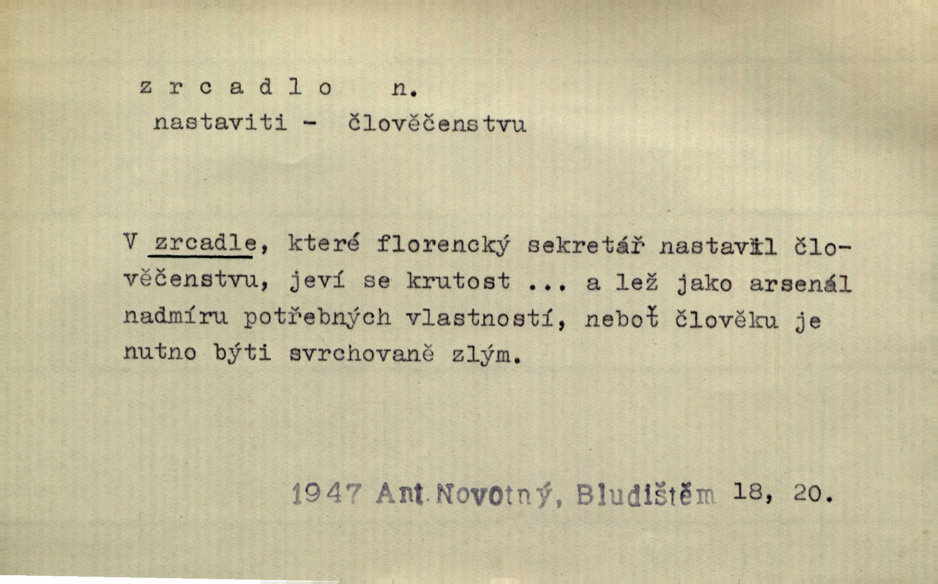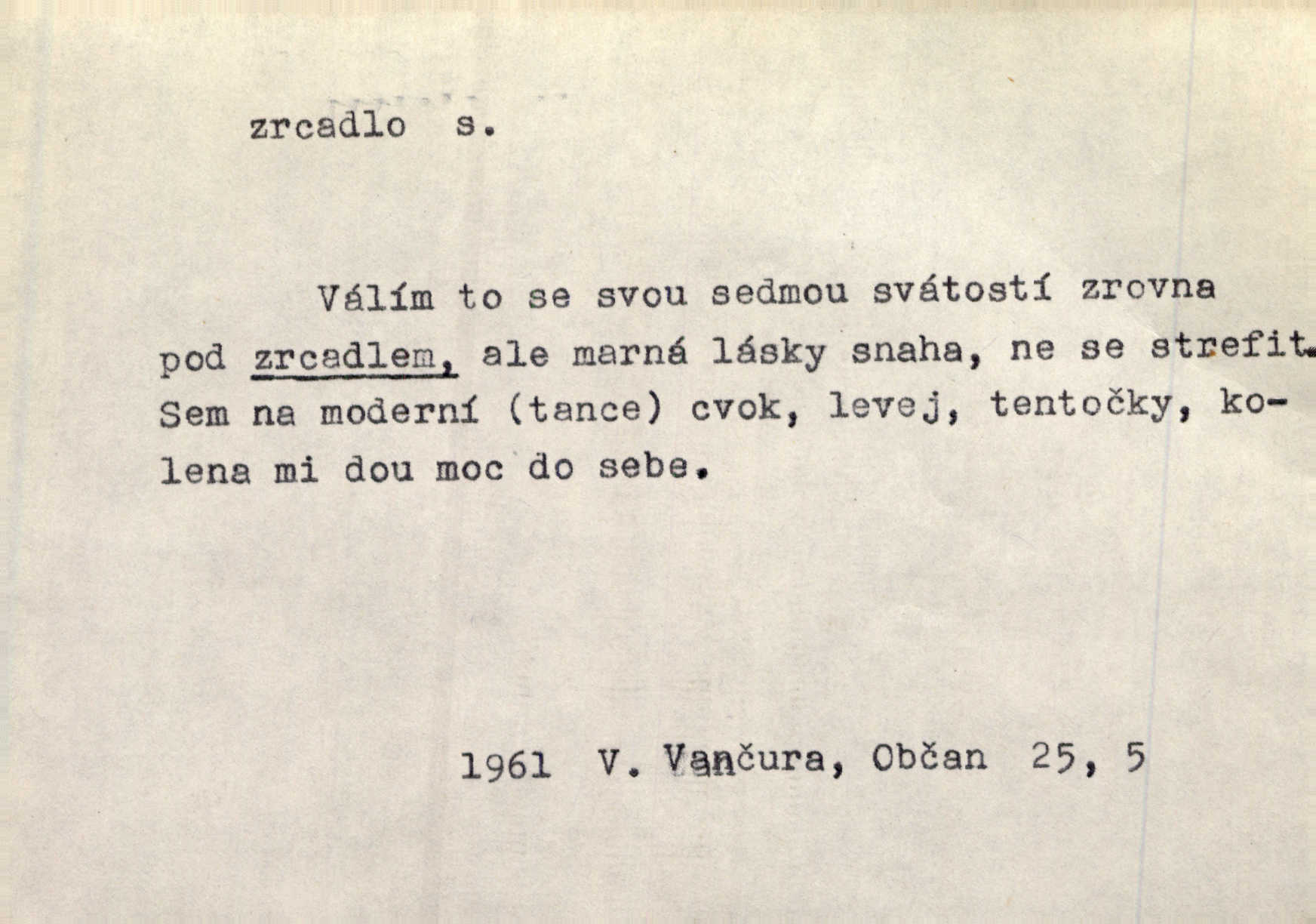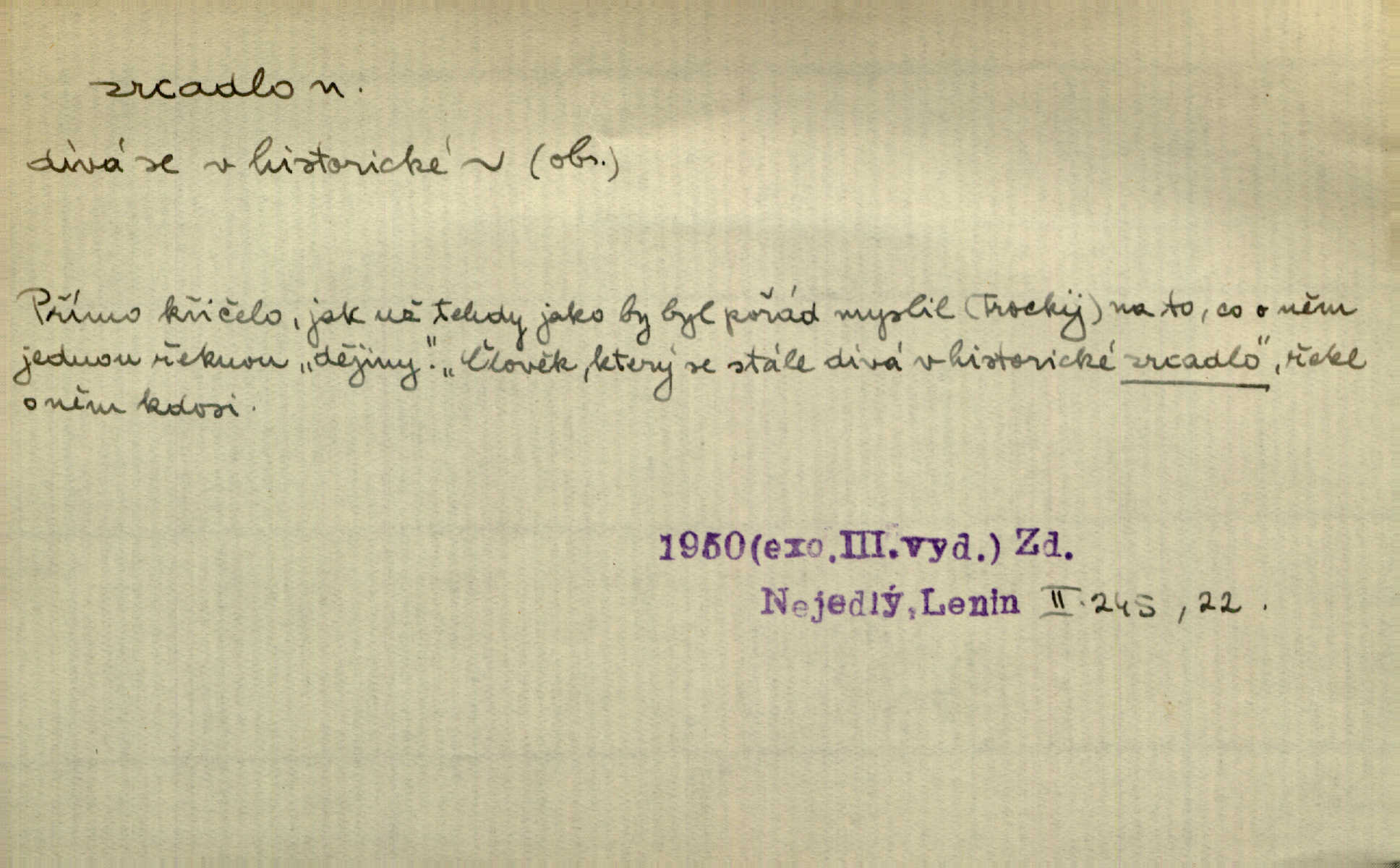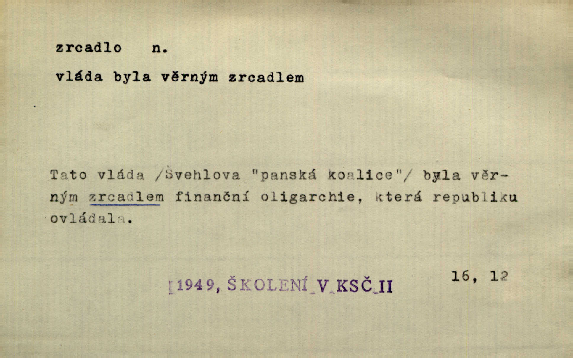 - zrcadlo, -a n. skleněná deska, uzpůsobená nanesením lesklé kovové vrstvy na spodní plochu k vytváření plošného obrazu předmětu, před ní postaveného, odražením paprsků. Poskočila s jedné nohy na druhou a vyplázla na sebe do zrcadla jazyk. K. J. Ben. I přiložili matce zrcadlo k ústům, zdali se zarosí a zdali matka žije. Herb. Zrcadla planou a sklenice řinčí [v kavárně]. K. Čap. Moravský průmysl skla a zrcadel. Úř. l. Mlýn stojí až dole v rovině, která jako zrcadlo leží až k Ronovu a Rožďalovicům rovná. Mach. Vše stopeno ve lůno vod, jak v zrcadle se zhlíží. Mácha. Krátká srsť [hřebice] byla uhlazena a zrcadlem se leskla. Hol. Byly [boty] jako zrcadlo leskly se. Jir. A chystá se to [mráz], západ je jako zrcadlo vyjasněný, čistý. Rais. Pěstounka a s chovanka se do sebe hleděly jako do zrcadla měly se rády. Svět. Klotilda viděla na babičce jako v zrcadle, že paráda a marnost člověka nesytí a neživí jasně, zřetelně. Prav. Vláda pronásledující a utlačující opposiční noviny sama rozbíjí neklamné zrcadlo, ve kterém by viděti mohla pravé vady své. Havl. Žádné zrcadlo bez prášku není každý má nějakou chybu. Čech. Tys mi při přelíčení podržel zrcadlo, že jsem sebe v něm viděl tak, jaký jsem pověděl pravdu. Šmil. Expr. lid. Neuvidí skvrny na mém oděvu ani zrcadla, jimiž se honosily mého kabátu lokte a kolena mých spodků odřená, lesklá místa látky. Klost. Přen. Zrcadlo vzpomínek mu vypadlo z dlaní a rozbilo se nebyl schopen vzpomínati. K. J. Ben. Tech. hladká pravidelná plocha, která odráží světlo. Rovinné, sférické, parabolické, duté, vypuklé a j. zrcadlo. Výr. benátské zrcadlo. Chem. arsenové, antimonové, stříbrné a j. zrcadlo. Geol. lesklé, uhlazené smykové plochy, zvl. v uhelných vrstvách, vzniklé třením a obrusem mezi porušenými vrstvami. Zrcadla uhlí. Bot., les. dřeňový paprsek dřeva v podobě světlého, často lesklého pruhu, pruh zrcadlový, zrcadélko (na př. u dubu, buku a j.). Dopr. přední část perutě kormidla u nákladních člunů labských, vyplňující prázdný trojúhelníkový kout mezi zádí lodi a pněm kormidla. Stav. vodorovné pole, obyč. obdélníkové, ve vrcholu zrcadlové klenby. Lék. zrcadlo konečníkové, poševní, rozvírací, lžicové a j. Mysl. světlá, zprav. bílá část zakončení trupu zvěře pod ocasem. Bílá skvrna v ohbí křídel zvěře tetřevovité. Zelená lesklá péra na klobouku z křídel divokých kachen. Hosp. zrcadlo mléčné část kůže na zadní hrázové straně vemene s chlupy rostlými nahoru. Les. zrcadlo housenek shluk právě vylíhlých housenek lesních škůdců, které ještě několik dnů zůstávají pohromadě na místě, kde byla nakladena vajíčka. Typ. přesný rozvrh umístění obrázků a textu pro knižní dílo n. stránky časopisu. D lesklá plocha (zvl. vodní hladina), v níž vzniká obraz předmětů odrazem paprsků jako v zrcadle. [Měsíc] nakouknul do zrcadla tiché hladiny rybníčka na návsi. Mrš. V noci štědrovečerní zahlédlo [děvče] v temném zrcadle studně mezi třaslavými odrazy hvězd i tvář svého osudu. Řezáč. Neustálá kmitavost [hodonkového setrvačníku] připomíná koupání třasořitky, mnohokrát viděné v rozčeřeném zrcadle potoka. K. Konr. V borů věnci zrcadlo se skvostné odkrývá jak v rámci vábivém. Krás. Země tuhne zcela prosaicky a voda se pokryla průhledně jasným zrcadlem ledem. Ner. Přen. Potůčky slzí rozčeří [láska], zrcadlo duše ti skalí. Heyd. D Kniž. přesný popis, věrný výraz, svědectví něčeho. Umění, to zrcadlo života a přírody v půvabný rámec filosofie zasazené, šíří se. Šmil. Vtip deníkové formy je v tom, že hrdina románu je zároveň zrcadlem, v němž se celá Amerika odráží. Čteme. Mně byla příroda jen zrcadlem mého smutku. Vrch. Psaní jeho [Husova] mohou nad jiné sloužiti za zrcadlo jeho smýšlení a charakteru. Pal. To krásné, modré, veliké oko bylo čistým, věrným zrcadlem její duše. Pfleg. Plné, kulaté tváře byly zrcadlem jeho dobromyslnosti. Tyl. Každé jeho další vysvědčení bylo novým zrcadlem vzorného, dokonalého studenta. Herrm. Tato vláda byla věrným zrcadlem finanční oligarchie, která republiku ovládala. Škol. D Kniž. prostředek n. nástroj poznání, vnímání n. uvědomování. Tu ve zrcadle snů svých vídám sebe [básník], jak pustou plání běžím v divém spěchu. Vrch. Zřím ten den a chvíli onu paměti své ve zrcadle. Vrch. Cítila, že byla krásná, viděla to v zrcadle jeho úsměvu. Podl. Starý mozek jeho přijímal všecky jeho [obrazu bitvy] barvy ne zrcadlem nynějším, ale zrcadlem dávno minulým. Svob. Tak poslední my [hymny] na té zeměkouli ty dávné, děsné, hrůzyplné boje zříme jak v přítomnosti ve zrcadle vědy. Vrch. D Poněk. zast. seznam, soupis k připamatování něčeho (zvl. v názvech knih). Beru-li na sebe úkol, abych podal zrcadlo chyb, jimiž se vyznačuje naše společnost, jsem si už napřed vědom [svého osudu]. Hol. Na okně Hájkova Kronika v tmavé, staré vazbě kožené, na ní v novější „Zrcadlo svaté“. Jir. Prohlížím se v zpovědním zrcadle a vidím netvora. Pujmanová. Plot, dělící Zapletalovic od „staršího bratra“, byl učiněným zpovědním zrcadlem nábožné Barušce, neboť všechny téměř hříchy své sebrala s plotu, který se druhdy pod břitkými hádkami div neprohýbal. Čap. Ch. Naše města dostávala záhy právní pomůcky z ciziny a přicházely i pomůcky práva zemského, zvláště švábské i saské zrcadlo. Vojt. Tištěni jsou [nápisové] v Paprockého Zrcadlu markrabství Moravského velmi nedbale. Pal. D Poněk. zast. vzor, příklad. Byl [Zeyer] jedním z těch, kdo patří v dávnou dobu, leč zrcadlo v ní přítomnosti křísí. Vrch. Zk