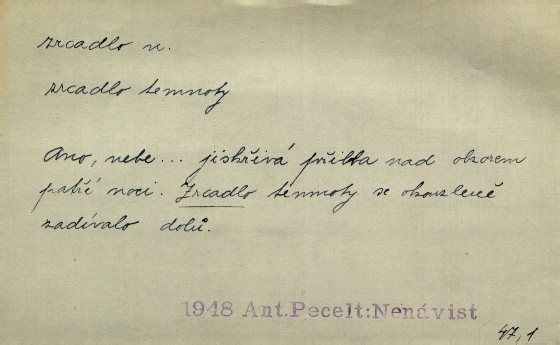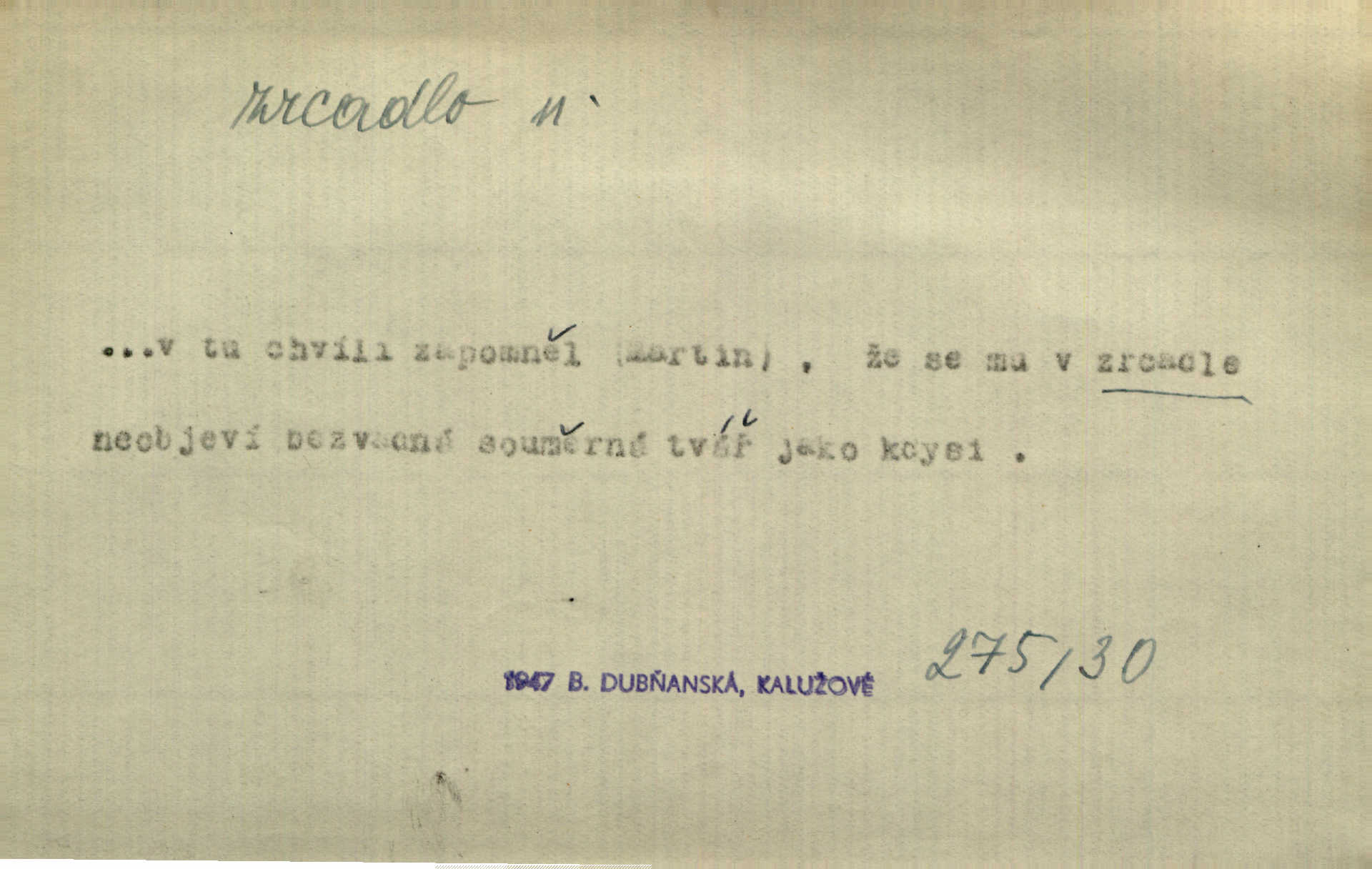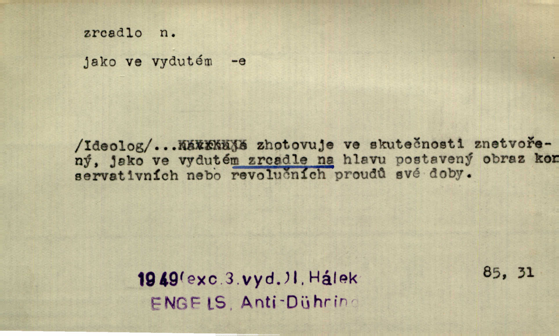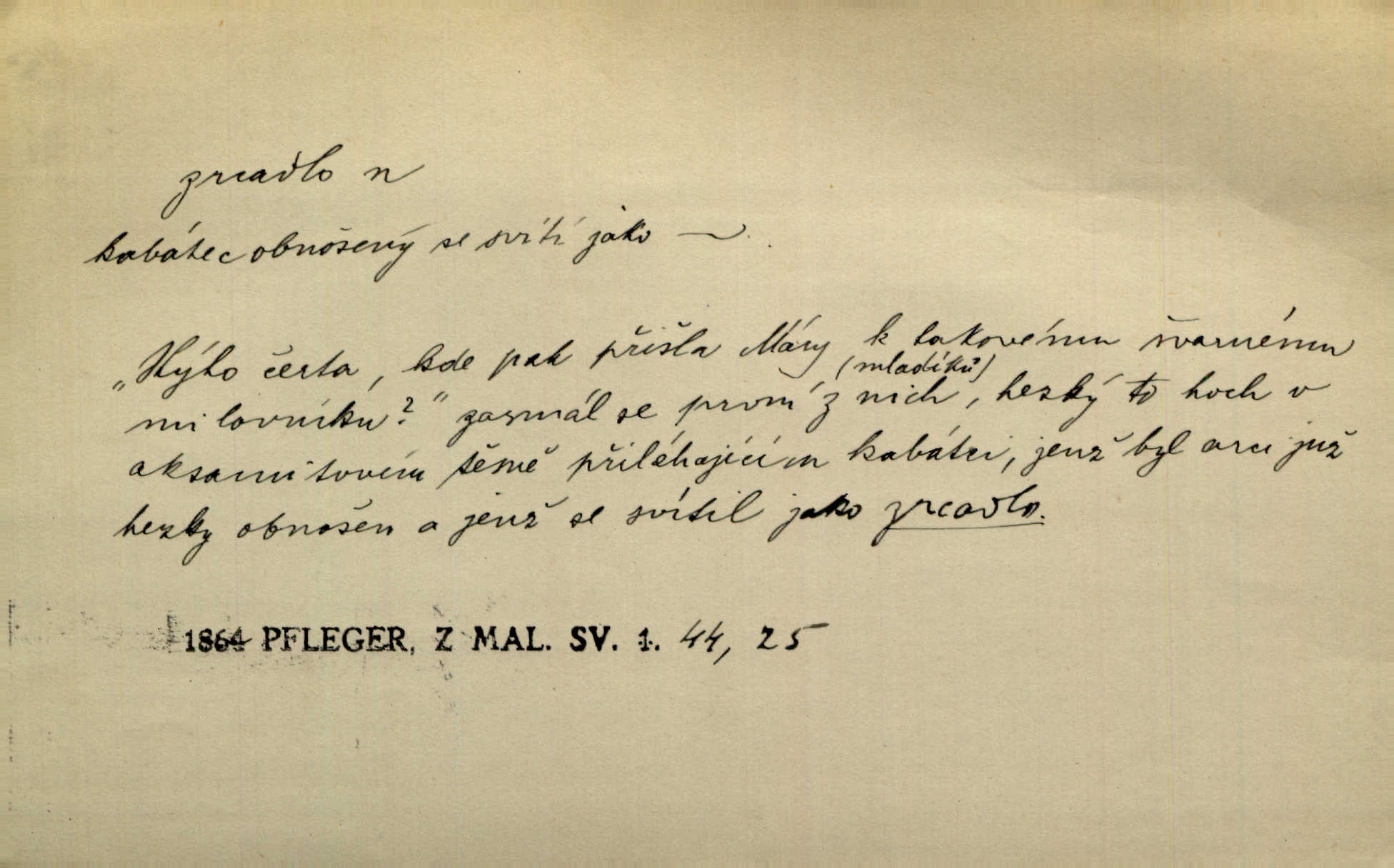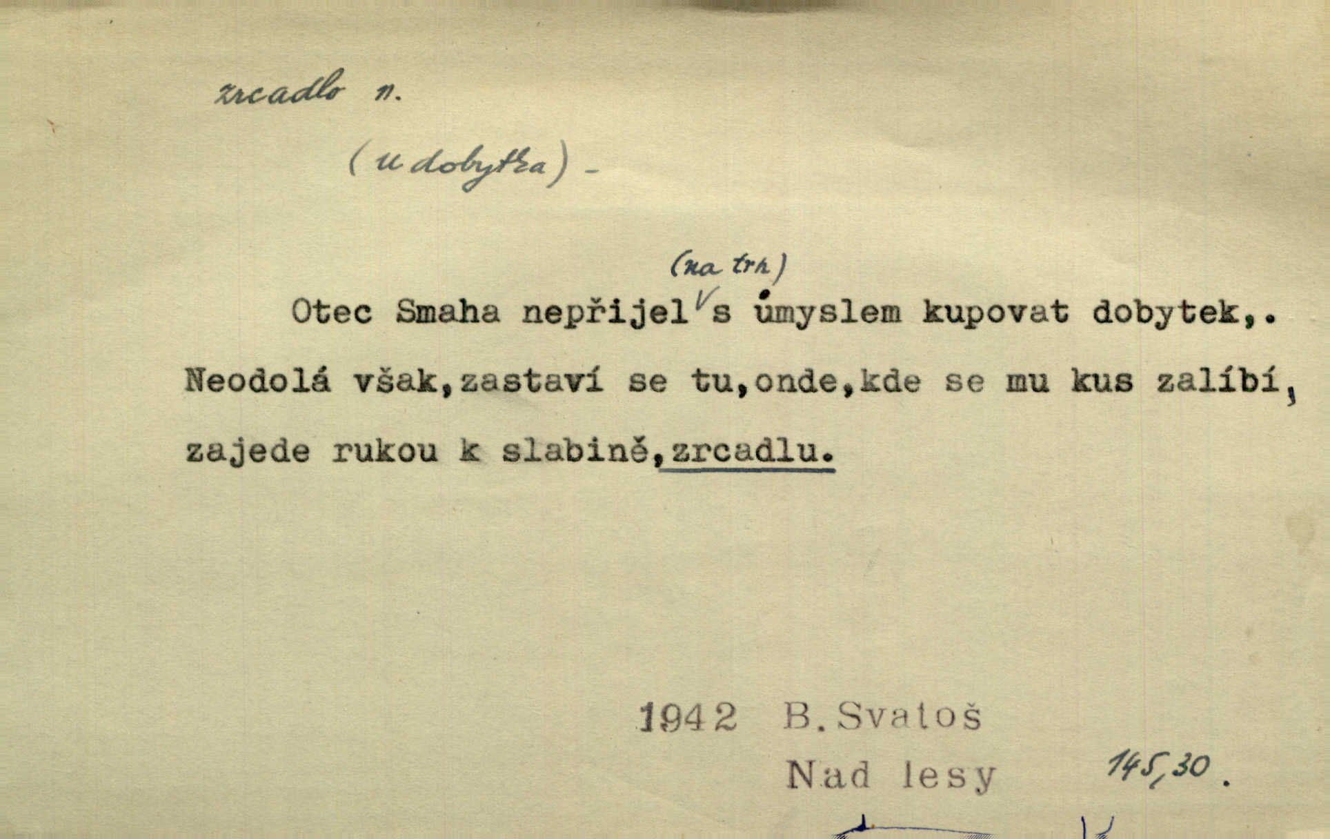- zrcadlo, -a n. skleněná deska, uzpůsobená nanesením lesklé kovové vrstvy na spodní plochu k vytváření plošného obrazu předmětu, před ní postaveného, odražením paprsků. Poskočila s jedné nohy na druhou a vyplázla na sebe do zrcadla jazyk. K. J. Ben. I přiložili matce zrcadlo k ústům, zdali se zarosí a zdali matka žije. Herb. Zrcadla planou a sklenice řinčí [v kavárně]. K. Čap. Moravský průmysl skla a zrcadel. Úř. l. Mlýn stojí až dole v rovině, která jako zrcadlo leží až k Ronovu a Rožďalovicům rovná. Mach. Vše stopeno ve lůno vod, jak v zrcadle se zhlíží. Mácha. Krátká srsť [hřebice] byla uhlazena a zrcadlem se leskla. Hol. Byly [boty] jako zrcadlo leskly se. Jir. A chystá se to [mráz], západ je jako zrcadlo vyjasněný, čistý. Rais. Pěstounka a s chovanka se do sebe hleděly jako do zrcadla měly se rády. Svět. Klotilda viděla na babičce jako v zrcadle, že paráda a marnost člověka nesytí a neživí jasně, zřetelně. Prav. Vláda pronásledující a utlačující opposiční noviny sama rozbíjí neklamné zrcadlo, ve kterém by viděti mohla pravé vady své. Havl. Žádné zrcadlo bez prášku není každý má nějakou chybu. Čech. Tys mi při přelíčení podržel zrcadlo, že jsem sebe v něm viděl tak, jaký jsem pověděl pravdu. Šmil. Expr. lid. Neuvidí skvrny na mém oděvu ani zrcadla, jimiž se honosily mého kabátu lokte a kolena mých spodků odřená, lesklá místa látky. Klost. Přen. Zrcadlo vzpomínek mu vypadlo z dlaní a rozbilo se nebyl schopen vzpomínati. K. J. Ben. Tech. hladká pravidelná plocha, která odráží světlo. Rovinné, sférické, parabolické, duté, vypuklé a j. zrcadlo. Výr. benátské zrcadlo. Chem. arsenové, antimonové, stříbrné a j. zrcadlo. Geol. lesklé, uhlazené smykové plochy, zvl. v uhelných vrstvách, vzniklé třením a obrusem mezi porušenými vrstvami. Zrcadla uhlí. Bot., les. dřeňový paprsek dřeva v podobě světlého, často lesklého pruhu, pruh zrcadlový, zrcadélko (na př. u dubu, buku a j.). Dopr. přední část perutě kormidla u nákladních člunů labských, vyplňující prázdný trojúhelníkový kout mezi zádí lodi a pněm kormidla. Stav. vodorovné pole, obyč. obdélníkové, ve vrcholu zrcadlové klenby. Lék. zrcadlo konečníkové, poševní, rozvírací, lžicové a j. Mysl. světlá, zprav. bílá část zakončení trupu zvěře pod ocasem. Bílá skvrna v ohbí křídel zvěře tetřevovité. Zelená lesklá péra na klobouku z křídel divokých kachen. Hosp. zrcadlo mléčné část kůže na zadní hrázové straně vemene s chlupy rostlými nahoru. Les. zrcadlo housenek shluk právě vylíhlých housenek lesních škůdců, které ještě několik dnů zůstávají pohromadě na místě, kde byla nakladena vajíčka. Typ. přesný rozvrh umístění obrázků a textu pro knižní dílo n. stránky časopisu. D lesklá plocha (zvl. vodní hladina), v níž vzniká obraz předmětů odrazem paprsků jako v zrcadle. [Měsíc] nakouknul do zrcadla tiché hladiny rybníčka na návsi. Mrš. V noci štědrovečerní zahlédlo [děvče] v temném zrcadle studně mezi třaslavými odrazy hvězd i tvář svého osudu. Řezáč. Neustálá kmitavost [hodonkového setrvačníku] připomíná koupání třasořitky, mnohokrát viděné v rozčeřeném zrcadle potoka. K. Konr. V borů věnci zrcadlo se skvostné odkrývá jak v rámci vábivém. Krás. Země tuhne zcela prosaicky a voda se pokryla průhledně jasným zrcadlem ledem. Ner. Přen. Potůčky slzí rozčeří [láska], zrcadlo duše ti skalí. Heyd. D Kniž. přesný popis, věrný výraz, svědectví něčeho. Umění, to zrcadlo života a přírody v půvabný rámec filosofie zasazené, šíří se. Šmil. Vtip deníkové formy je v tom, že hrdina románu je zároveň zrcadlem, v němž se celá Amerika odráží. Čteme. Mně byla příroda jen zrcadlem mého smutku. Vrch. Psaní jeho [Husova] mohou nad jiné sloužiti za zrcadlo jeho smýšlení a charakteru. Pal. To krásné, modré, veliké oko bylo čistým, věrným zrcadlem její duše. Pfleg. Plné, kulaté tváře byly zrcadlem jeho dobromyslnosti. Tyl. Každé jeho další vysvědčení bylo novým zrcadlem vzorného, dokonalého studenta. Herrm. Tato vláda byla věrným zrcadlem finanční oligarchie, která republiku ovládala. Škol. D Kniž. prostředek n. nástroj poznání, vnímání n. uvědomování. Tu ve zrcadle snů svých vídám sebe [básník], jak pustou plání běžím v divém spěchu. Vrch. Zřím ten den a chvíli onu paměti své ve zrcadle. Vrch. Cítila, že byla krásná, viděla to v zrcadle jeho úsměvu. Podl. Starý mozek jeho přijímal všecky jeho [obrazu bitvy] barvy ne zrcadlem nynějším, ale zrcadlem dávno minulým. Svob. Tak poslední my [hymny] na té zeměkouli ty dávné, děsné, hrůzyplné boje zříme jak v přítomnosti ve zrcadle vědy. Vrch. D Poněk. zast. seznam, soupis k připamatování něčeho (zvl. v názvech knih). Beru-li na sebe úkol, abych podal zrcadlo chyb, jimiž se vyznačuje naše společnost, jsem si už napřed vědom [svého osudu]. Hol. Na okně Hájkova Kronika v tmavé, staré vazbě kožené, na ní v novější „Zrcadlo svaté“. Jir. Prohlížím se v zpovědním zrcadle a vidím netvora. Pujmanová. Plot, dělící Zapletalovic od „staršího bratra“, byl učiněným zpovědním zrcadlem nábožné Barušce, neboť všechny téměř hříchy své sebrala s plotu, který se druhdy pod břitkými hádkami div neprohýbal. Čap. Ch. Naše města dostávala záhy právní pomůcky z ciziny a přicházely i pomůcky práva zemského, zvláště švábské i saské zrcadlo. Vojt. Tištěni jsou [nápisové] v Paprockého Zrcadlu markrabství Moravského velmi nedbale. Pal. D Poněk. zast. vzor, příklad. Byl [Zeyer] jedním z těch, kdo patří v dávnou dobu, leč zrcadlo v ní přítomnosti křísí. Vrch. Zk