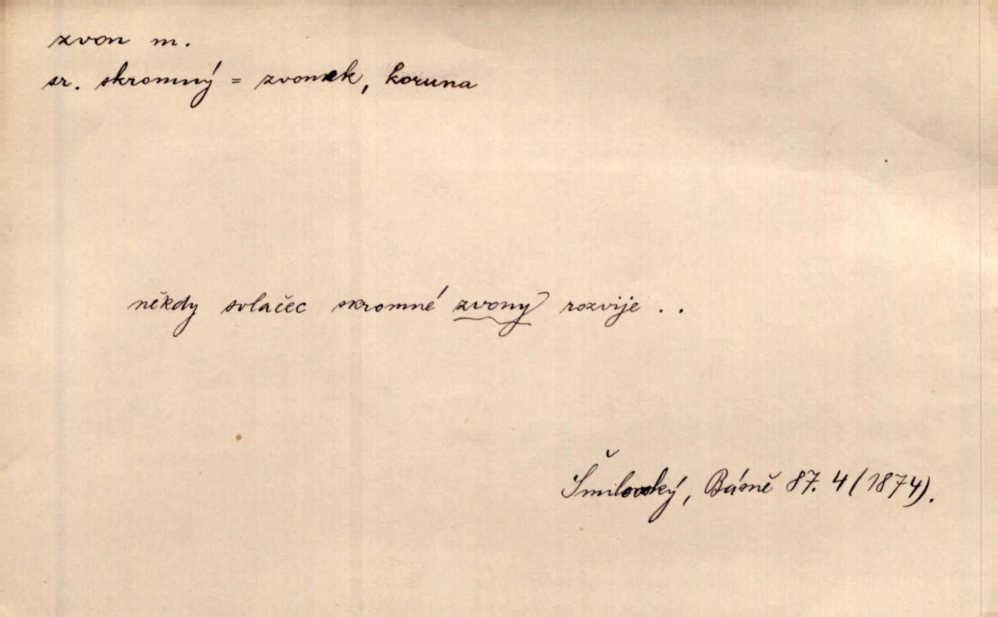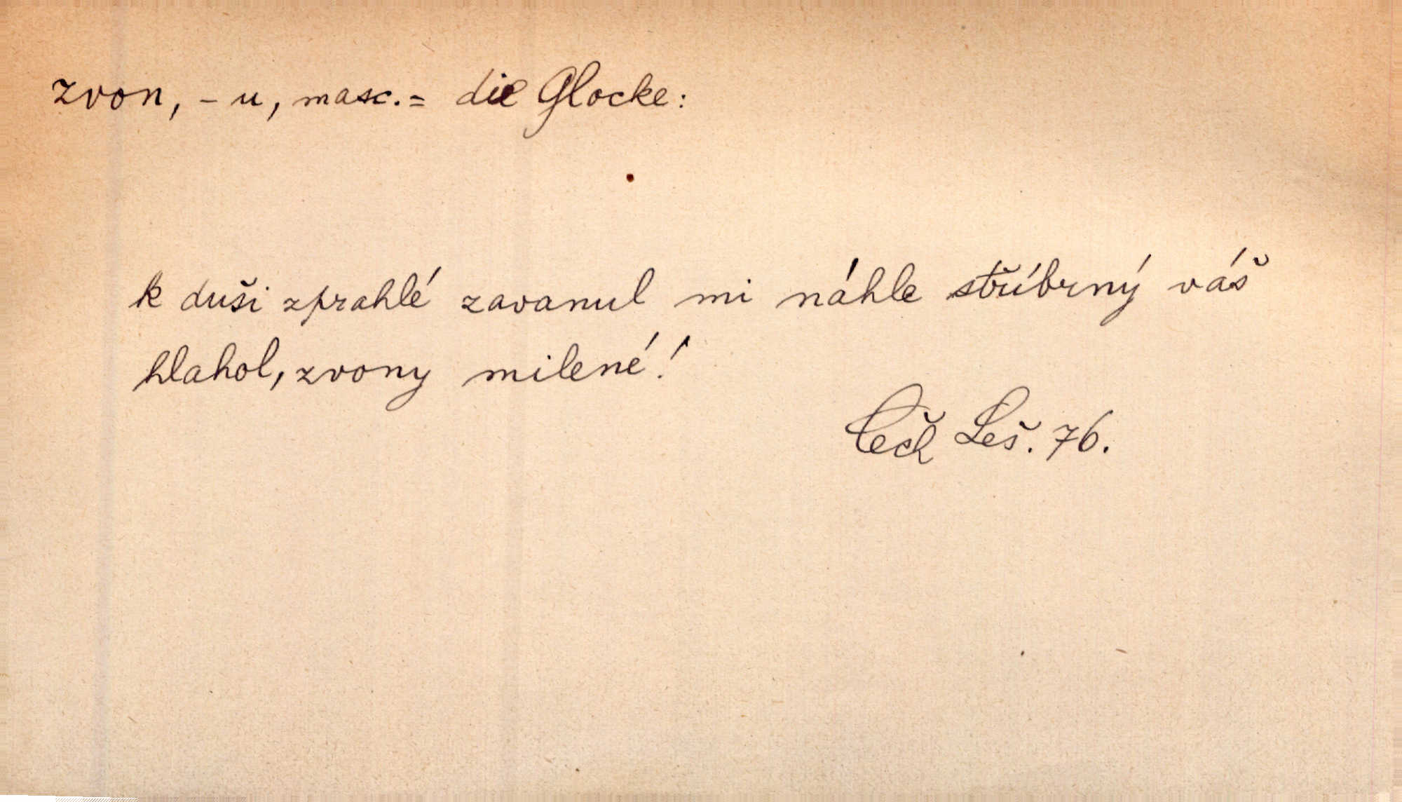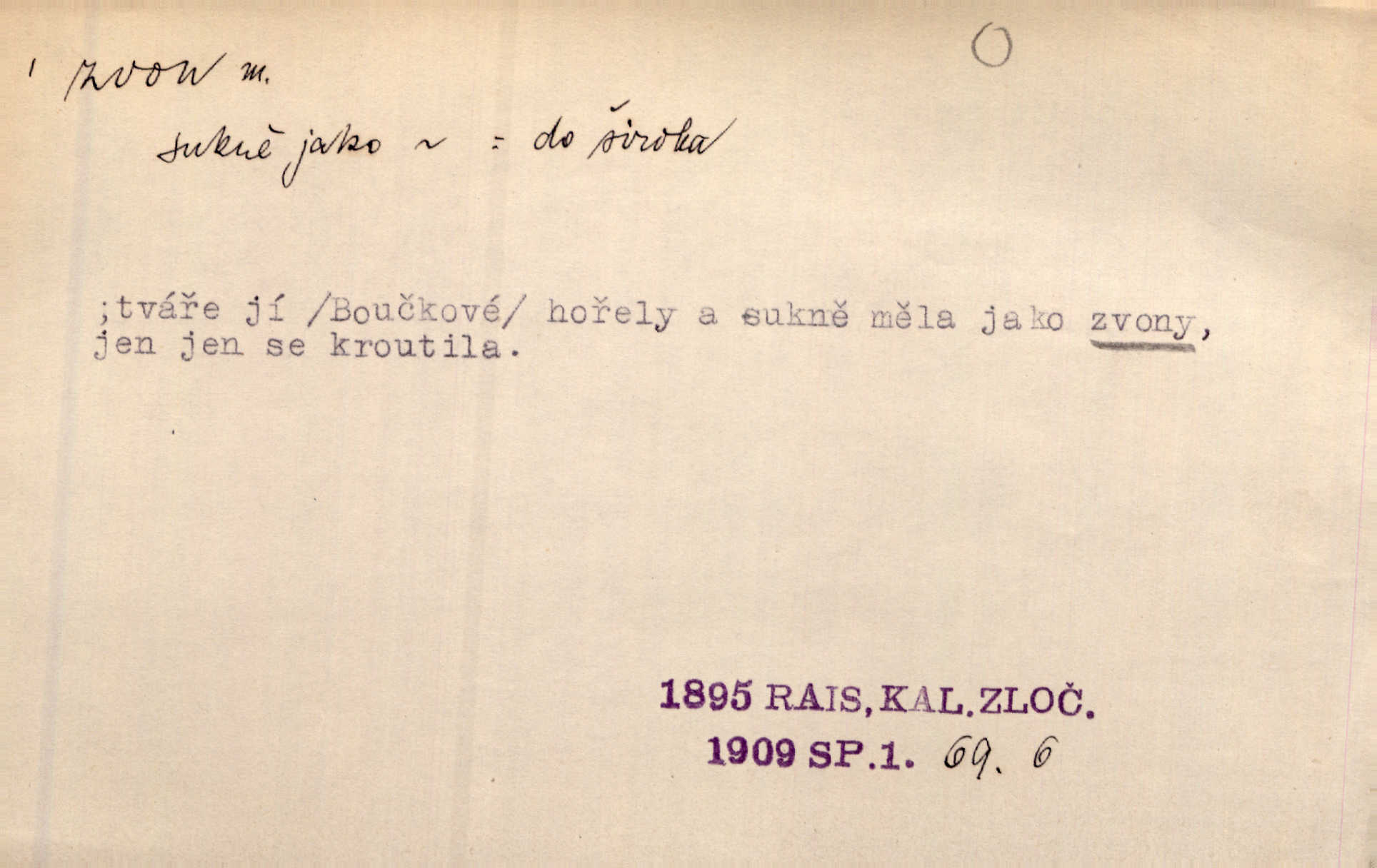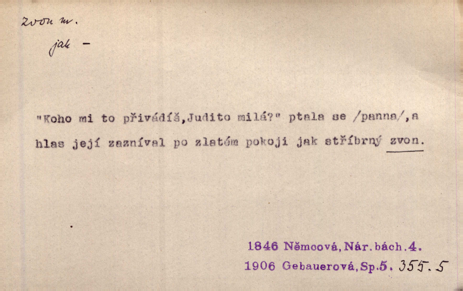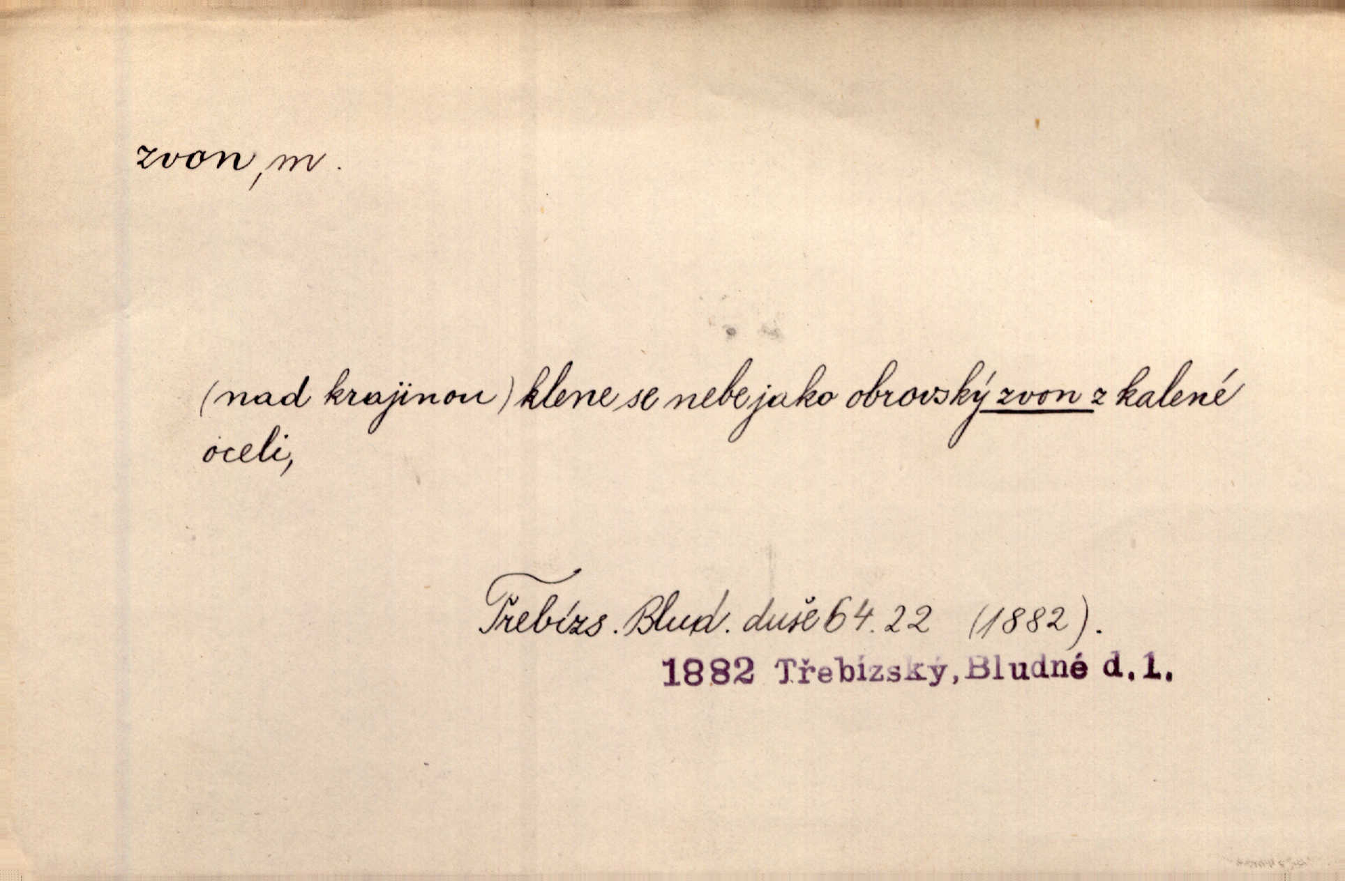 - zvon, -u m. kovový, obyč. bronzový nástroj v podobě obráceného kalichu, zavěšený tak, aby rozhoupáním se rozezvučoval pod údery zvl. kladiva (srdce). Zvoní a hlaholí Frydecké zvony, do země spouštějí rakev. Bezr. Lešetínské zvony slyšet valné hony. Čech. Na hlas zvonu přišlo z polí něco lidí do vesnice. Herb. V blízké vesnici začali šturmovat, zvon bil naříkavě na poplach. Maj. Rychtáři, dej udeřiti na zvon a neodcházej z radnice zvoniti na poplach. Jan. Dále v lese bučel dobytek, cinkaly zvony, co měl na krku zvonky. Prav. Na Zelený čtvrtek už byla velikonoční nálada vzrušenější. Zvony prý toho dne odletí do Říma (lidová pověra velkonoční). Strnadel. Obklopilo ji veliké a napjaté ticho nesmírnou prázdnotou jako dutým zvonem. K. J. Ben. Proč bych nemohl věděti, co se v Praze všemi zvony vyzvání o čem se všude mluví. Klicp. Jen ze šetrnosti k tobě nechtěl jsem rozmíšky naše pověsiti na zvon všude rozhlásiti. Svět. Tváře jí hořely a sukně měla jako zvony, jen jen se kroutila široce nažehlené. Rais. [Nad krajinou] klene se nebe jako obrovský zvon z kalené oceli. Třeb. Hlas její zazníval po zlatém pokoji jak stříbrný zvon. Něm. Biedermayerovští kavalíři chodili po korse s bílým šátkem kolem krku a zlatou jehlicí v zimníku do zvonu s dlouhými skládanými šosy. John. Věděl, že hejtman má srdce jako zvon zdravé. Branald. Bás. Tvůj ret se rozpěj víc a víc, až zvonem pozajásá. Ner. Přen. Ve zvon hromu bije na poplach. Krás. Je svátek duší, v jichžto zmlknutí zní zvony poesie. Krás. [Velcí muži] lidstvu cestu vyměří a ve zvon dějův mocně udeří vyvolají velké události. Ner. Ty květe anemony! Sáh jsi mi k srdci, jakby milá ruka tam vzpomínek všech rozpoutala zvony. Vrch. D bicí nástroj v podobě obráceného talíře, zvl. jako součást bicího zařízení hodin; gong. Z nejista a temně jaksi zaléhá sem zvon neviděné tramway. Mach. Přesypací hodiny a lodní zvon jsou dva předměty na lodi, které se těšily všeobecné pozornosti. Vosátka. Údery hodin sopránového zvonu znějí jako podrážděné výkřiky zlé ženy. Jah. Z nádraží [zazní druhé znamení zvonu dvakrát po sobě. Pfleg. D jiné zařízení v podobě zvonu; poklop a pod. Sýry schováváme pod skleněné příklopy (zvony). Hvězda. Přiklopme pak nádobku tu zvonem skleněným a počněme do toho uváděti vodík. Vot. Dříve rudu i vápenec vozili ve vozíkách, teď odstranili tuhle dřinu a všecko obstarávají zavážecí zvony. Uždil. Přen. [Za krajem obzoru] k mlhám země jako vlasovou linií přimyká se zvon oblohy. Štech. Pod zvon mračna, jež se zvedá stmělé, skryj [měsíc] kvetoucí svůj liliový plamen! Vrch. Kráčí jako pod mléčným zvonem. Krok vidí před sebe a ostatní je hustá, šedá mlha. Baar. Tech. potápěcí zvon zařízení v podobě zvonu, umožňující práci pod vodou. Hut. součást zavážecího zařízení vysoké pece. Tech. plynový zvon zařízení pro jímání kalového plynu ve vyhnívacích nádržích. Zbož. gumový zvon pomůcka k uvolňování ucpaného potrubí tlakem vzduchu. Mysl. kovová objímka nábojnice do loveckých pušek, do níž je zasazena roznětka. D Kniž. něco vzhledem připomínajícího zvon. Modrý zvon Řipu objevil se na mlhavém pozadí. Rais. A tak zanedlouho vykukovaly nožky v pavučinkových pučonkách pod vlajícím zvonem sukní. Ahoj. V bělosti té pleti vězí krůpěj průhledná jak ranní rosa v zvonu lilie zvonku. Zey. Tu zavzní na zvonění slavné malých i velkých kvítků zvon. Hál. Někdy svlačec skromné zvony rozvije. Šmil. Modré zvony klematisu zakryly i hořejší patro žluté vily. O. Schein. Těl. skupinové cvičení na kolovadlech.