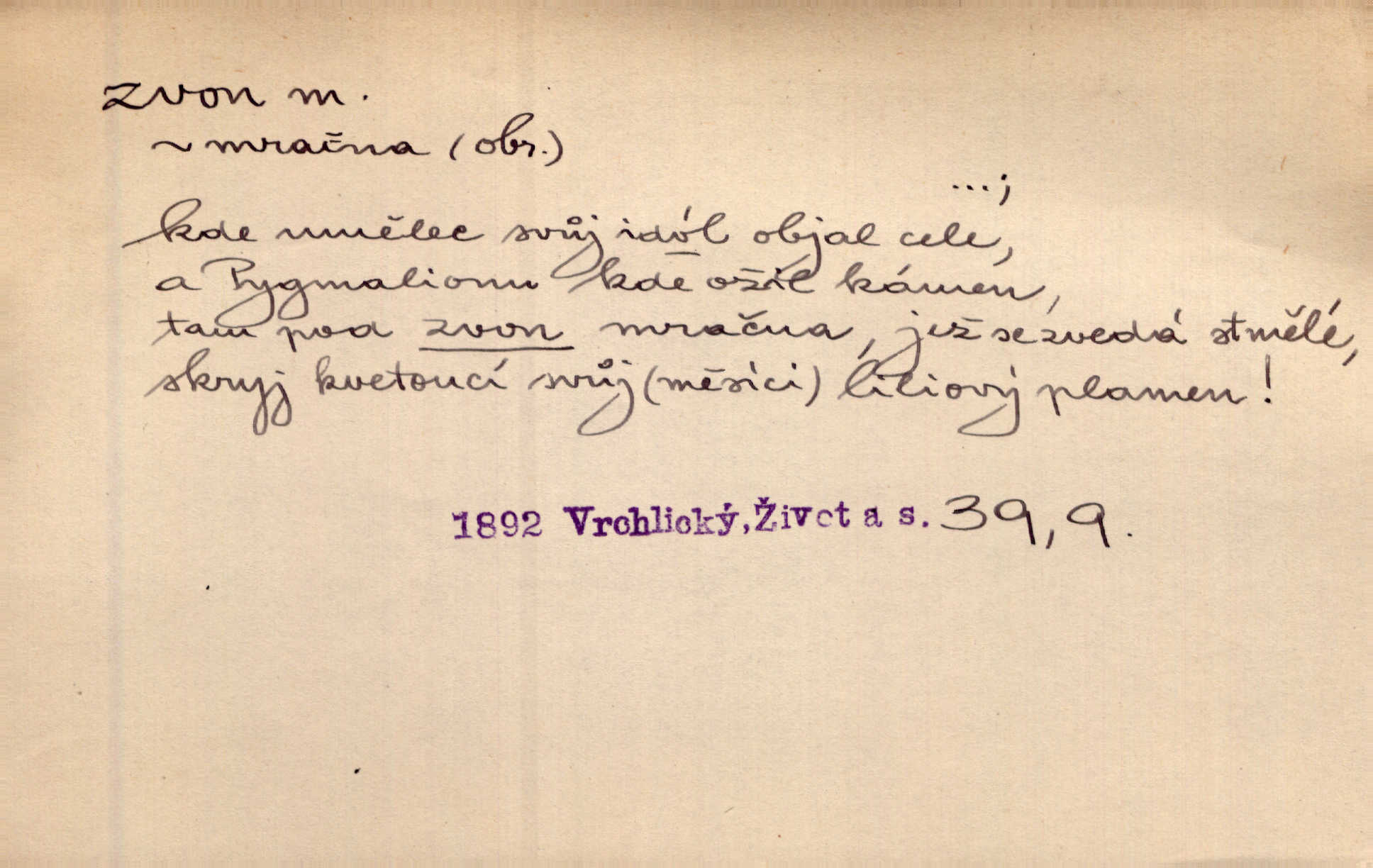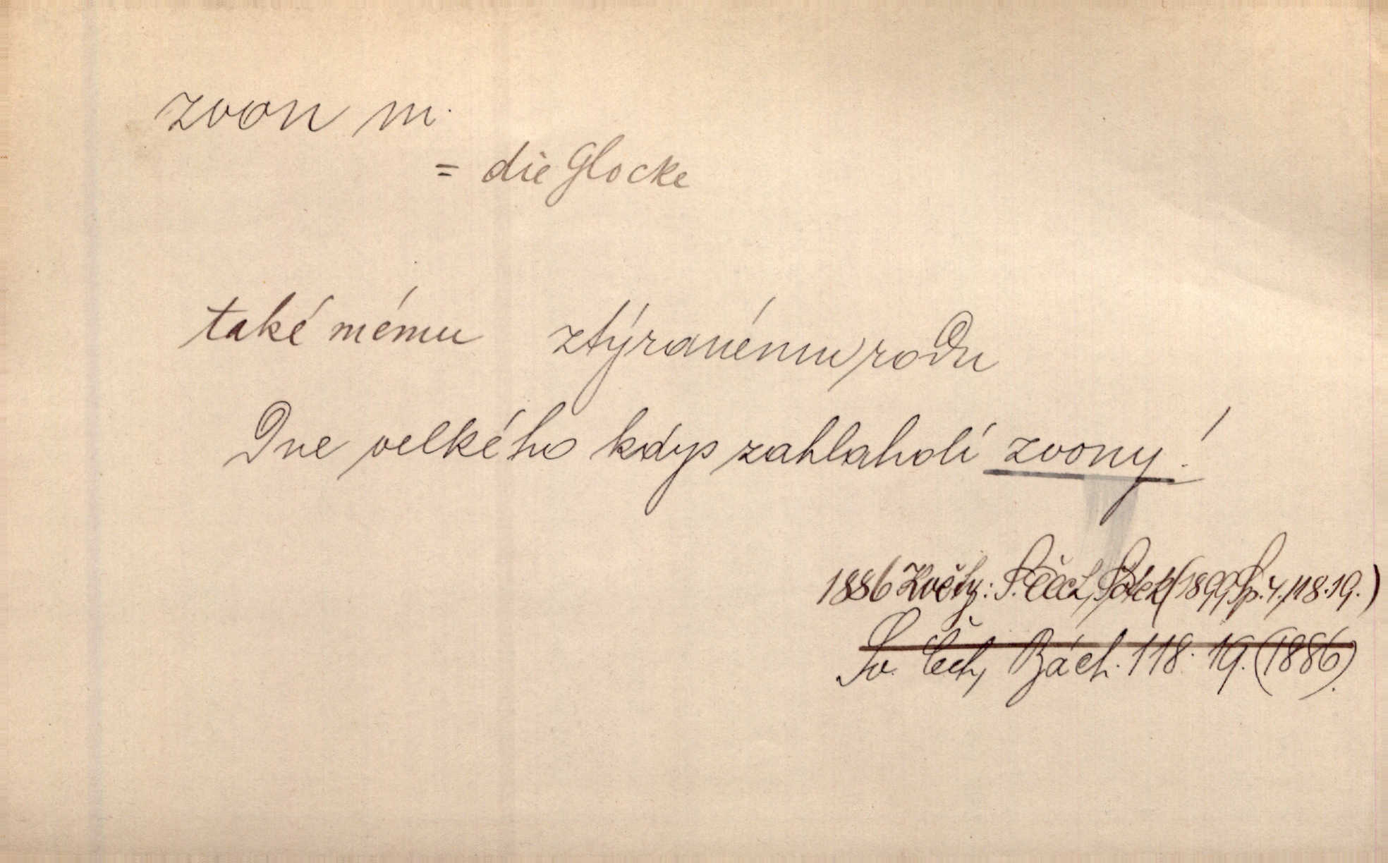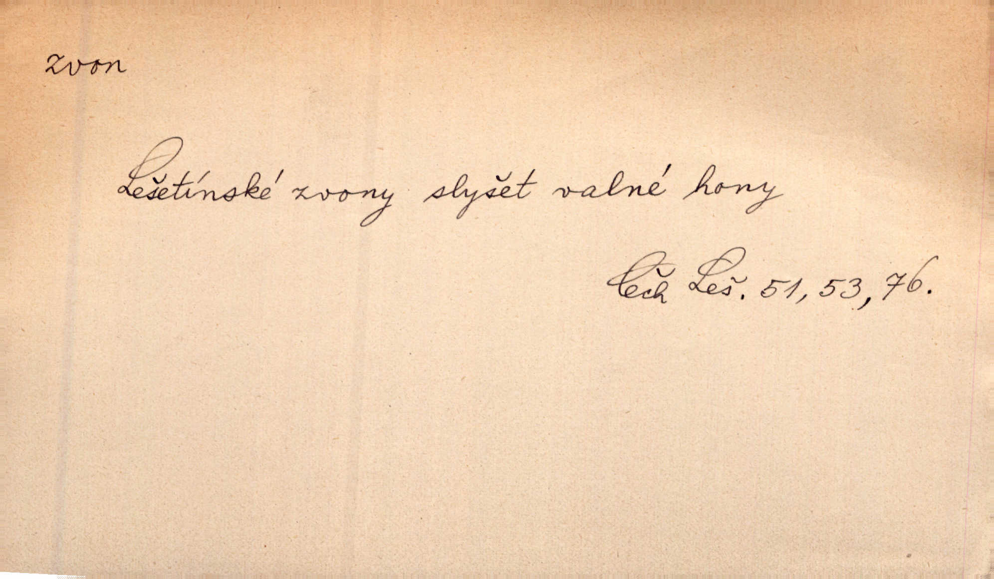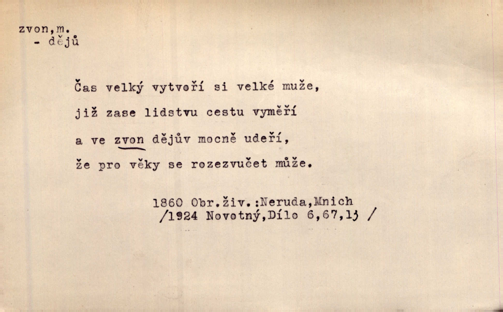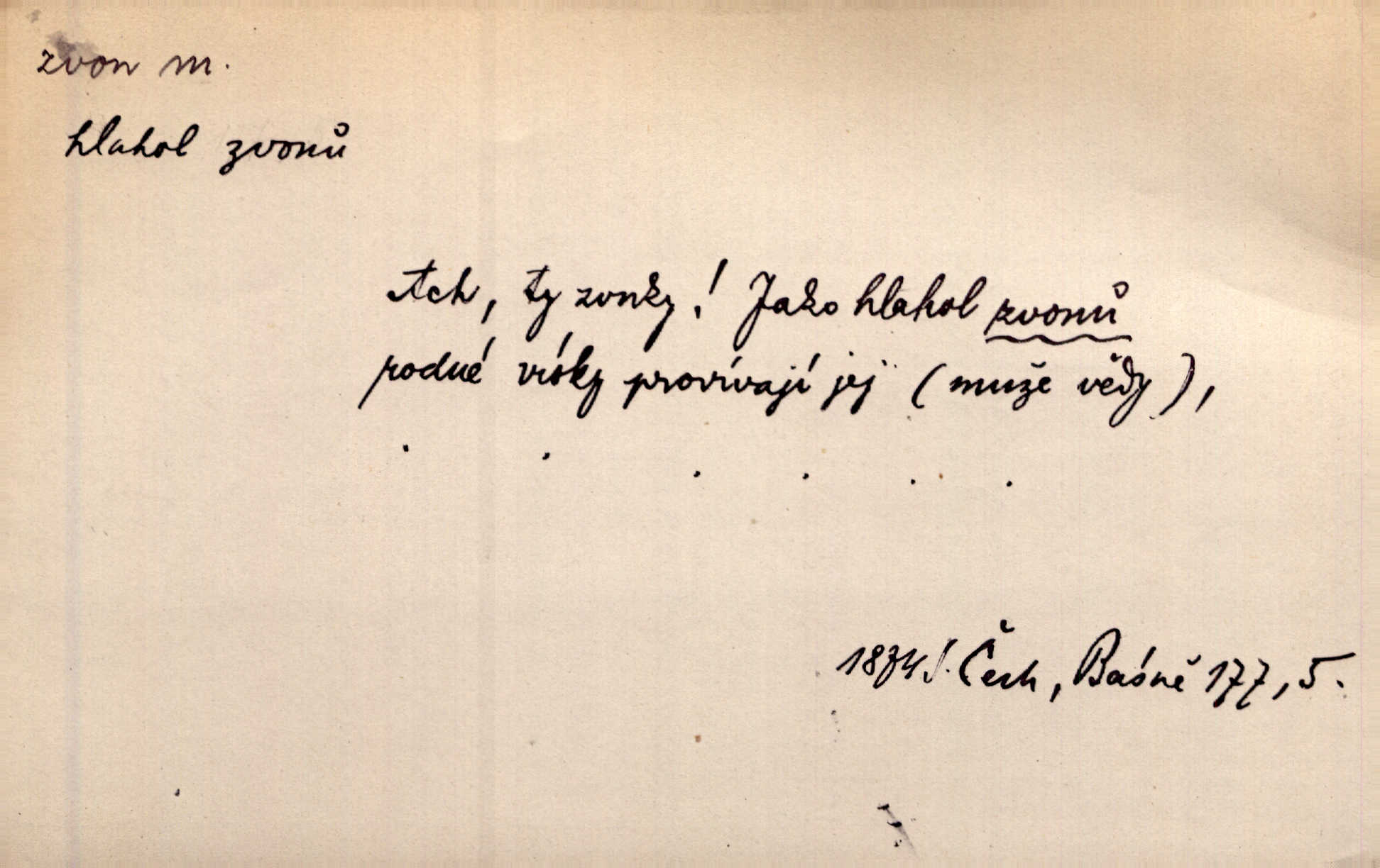 - zvon, -u m. kovový, obyč. bronzový nástroj v podobě obráceného kalichu, zavěšený tak, aby rozhoupáním se rozezvučoval pod údery zvl. kladiva (srdce). Zvoní a hlaholí Frydecké zvony, do země spouštějí rakev. Bezr. Lešetínské zvony slyšet valné hony. Čech. Na hlas zvonu přišlo z polí něco lidí do vesnice. Herb. V blízké vesnici začali šturmovat, zvon bil naříkavě na poplach. Maj. Rychtáři, dej udeřiti na zvon a neodcházej z radnice zvoniti na poplach. Jan. Dále v lese bučel dobytek, cinkaly zvony, co měl na krku zvonky. Prav. Na Zelený čtvrtek už byla velikonoční nálada vzrušenější. Zvony prý toho dne odletí do Říma (lidová pověra velkonoční). Strnadel. Obklopilo ji veliké a napjaté ticho nesmírnou prázdnotou jako dutým zvonem. K. J. Ben. Proč bych nemohl věděti, co se v Praze všemi zvony vyzvání o čem se všude mluví. Klicp. Jen ze šetrnosti k tobě nechtěl jsem rozmíšky naše pověsiti na zvon všude rozhlásiti. Svět. Tváře jí hořely a sukně měla jako zvony, jen jen se kroutila široce nažehlené. Rais. [Nad krajinou] klene se nebe jako obrovský zvon z kalené oceli. Třeb. Hlas její zazníval po zlatém pokoji jak stříbrný zvon. Něm. Biedermayerovští kavalíři chodili po korse s bílým šátkem kolem krku a zlatou jehlicí v zimníku do zvonu s dlouhými skládanými šosy. John. Věděl, že hejtman má srdce jako zvon zdravé. Branald. Bás. Tvůj ret se rozpěj víc a víc, až zvonem pozajásá. Ner. Přen. Ve zvon hromu bije na poplach. Krás. Je svátek duší, v jichžto zmlknutí zní zvony poesie. Krás. [Velcí muži] lidstvu cestu vyměří a ve zvon dějův mocně udeří vyvolají velké události. Ner. Ty květe anemony! Sáh jsi mi k srdci, jakby milá ruka tam vzpomínek všech rozpoutala zvony. Vrch. D bicí nástroj v podobě obráceného talíře, zvl. jako součást bicího zařízení hodin; gong. Z nejista a temně jaksi zaléhá sem zvon neviděné tramway. Mach. Přesypací hodiny a lodní zvon jsou dva předměty na lodi, které se těšily všeobecné pozornosti. Vosátka. Údery hodin sopránového zvonu znějí jako podrážděné výkřiky zlé ženy. Jah. Z nádraží [zazní druhé znamení zvonu dvakrát po sobě. Pfleg. D jiné zařízení v podobě zvonu; poklop a pod. Sýry schováváme pod skleněné příklopy (zvony). Hvězda. Přiklopme pak nádobku tu zvonem skleněným a počněme do toho uváděti vodík. Vot. Dříve rudu i vápenec vozili ve vozíkách, teď odstranili tuhle dřinu a všecko obstarávají zavážecí zvony. Uždil. Přen. [Za krajem obzoru] k mlhám země jako vlasovou linií přimyká se zvon oblohy. Štech. Pod zvon mračna, jež se zvedá stmělé, skryj [měsíc] kvetoucí svůj liliový plamen! Vrch. Kráčí jako pod mléčným zvonem. Krok vidí před sebe a ostatní je hustá, šedá mlha. Baar. Tech. potápěcí zvon zařízení v podobě zvonu, umožňující práci pod vodou. Hut. součást zavážecího zařízení vysoké pece. Tech. plynový zvon zařízení pro jímání kalového plynu ve vyhnívacích nádržích. Zbož. gumový zvon pomůcka k uvolňování ucpaného potrubí tlakem vzduchu. Mysl. kovová objímka nábojnice do loveckých pušek, do níž je zasazena roznětka. D Kniž. něco vzhledem připomínajícího zvon. Modrý zvon Řipu objevil se na mlhavém pozadí. Rais. A tak zanedlouho vykukovaly nožky v pavučinkových pučonkách pod vlajícím zvonem sukní. Ahoj. V bělosti té pleti vězí krůpěj průhledná jak ranní rosa v zvonu lilie zvonku. Zey. Tu zavzní na zvonění slavné malých i velkých kvítků zvon. Hál. Někdy svlačec skromné zvony rozvije. Šmil. Modré zvony klematisu zakryly i hořejší patro žluté vily. O. Schein. Těl. skupinové cvičení na kolovadlech.
