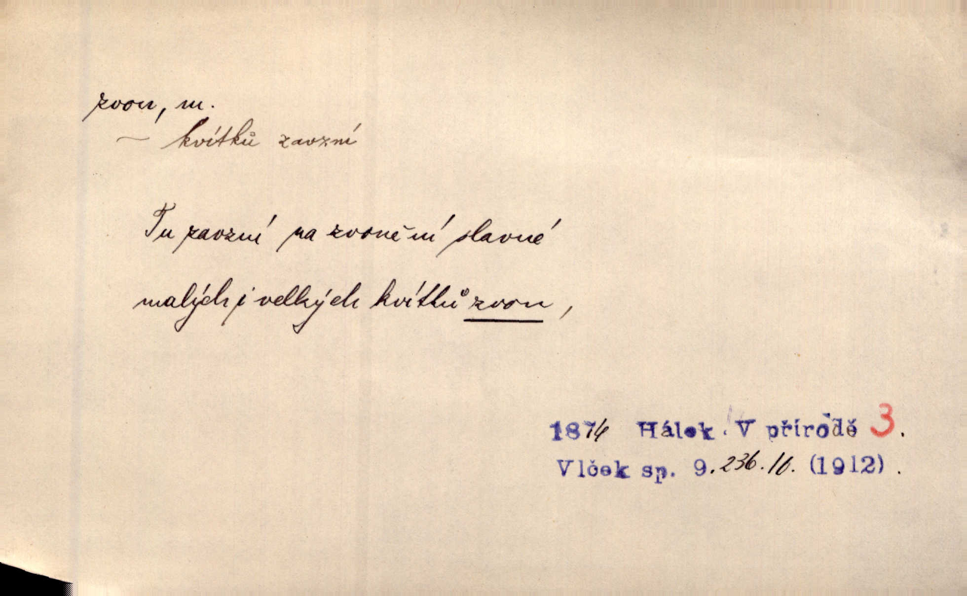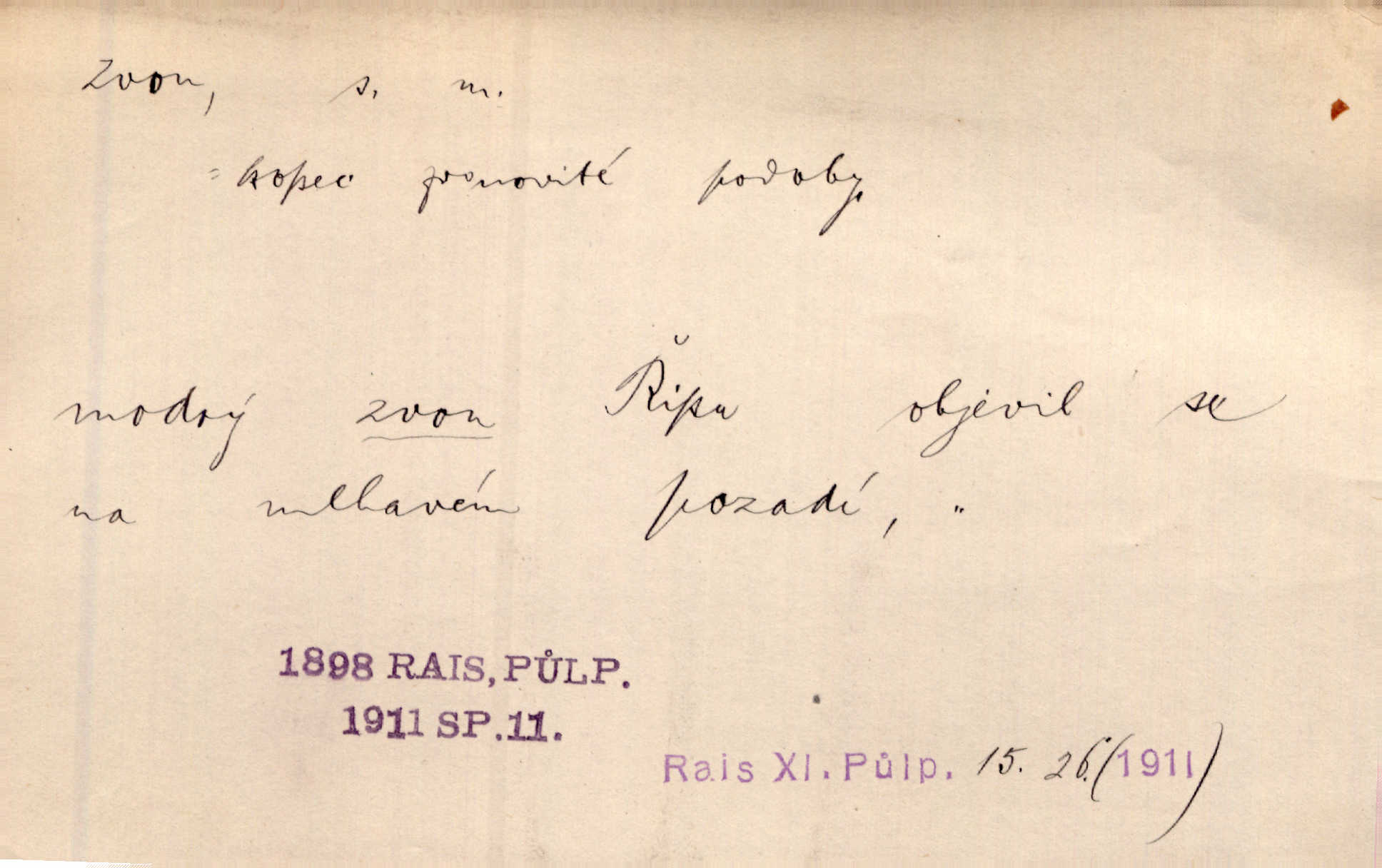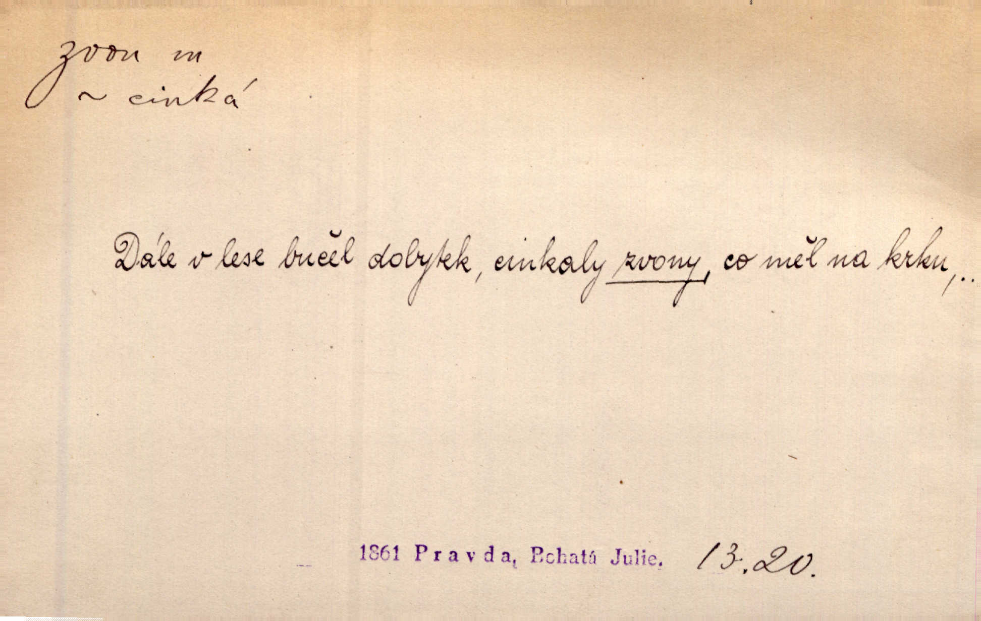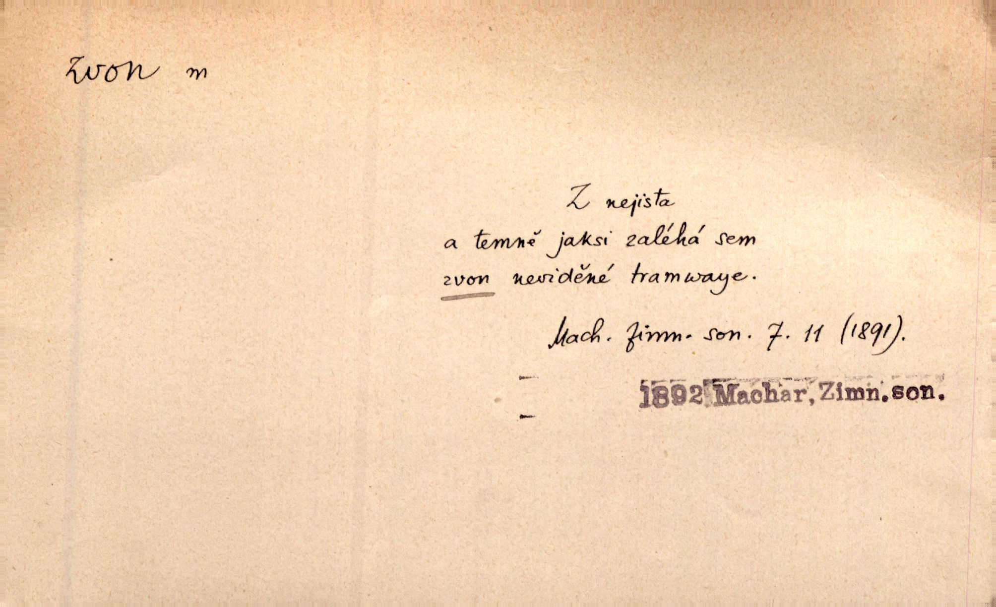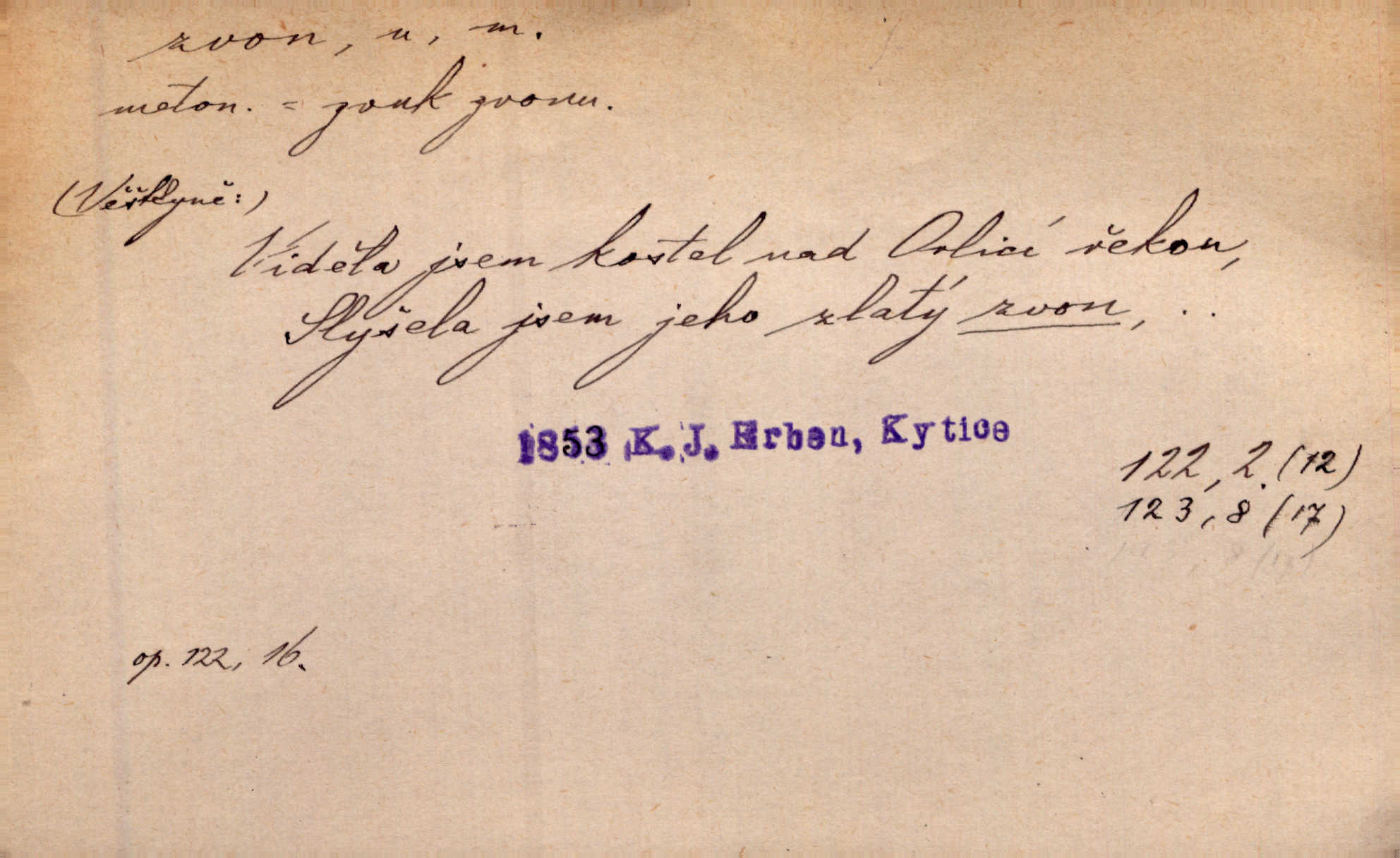 - zvon, -u m. kovový, obyč. bronzový nástroj v podobě obráceného kalichu, zavěšený tak, aby rozhoupáním se rozezvučoval pod údery zvl. kladiva (srdce). Zvoní a hlaholí Frydecké zvony, do země spouštějí rakev. Bezr. Lešetínské zvony slyšet valné hony. Čech. Na hlas zvonu přišlo z polí něco lidí do vesnice. Herb. V blízké vesnici začali šturmovat, zvon bil naříkavě na poplach. Maj. Rychtáři, dej udeřiti na zvon a neodcházej z radnice zvoniti na poplach. Jan. Dále v lese bučel dobytek, cinkaly zvony, co měl na krku zvonky. Prav. Na Zelený čtvrtek už byla velikonoční nálada vzrušenější. Zvony prý toho dne odletí do Říma (lidová pověra velkonoční). Strnadel. Obklopilo ji veliké a napjaté ticho nesmírnou prázdnotou jako dutým zvonem. K. J. Ben. Proč bych nemohl věděti, co se v Praze všemi zvony vyzvání o čem se všude mluví. Klicp. Jen ze šetrnosti k tobě nechtěl jsem rozmíšky naše pověsiti na zvon všude rozhlásiti. Svět. Tváře jí hořely a sukně měla jako zvony, jen jen se kroutila široce nažehlené. Rais. [Nad krajinou] klene se nebe jako obrovský zvon z kalené oceli. Třeb. Hlas její zazníval po zlatém pokoji jak stříbrný zvon. Něm. Biedermayerovští kavalíři chodili po korse s bílým šátkem kolem krku a zlatou jehlicí v zimníku do zvonu s dlouhými skládanými šosy. John. Věděl, že hejtman má srdce jako zvon zdravé. Branald. Bás. Tvůj ret se rozpěj víc a víc, až zvonem pozajásá. Ner. Přen. Ve zvon hromu bije na poplach. Krás. Je svátek duší, v jichžto zmlknutí zní zvony poesie. Krás. [Velcí muži] lidstvu cestu vyměří a ve zvon dějův mocně udeří vyvolají velké události. Ner. Ty květe anemony! Sáh jsi mi k srdci, jakby milá ruka tam vzpomínek všech rozpoutala zvony. Vrch. D bicí nástroj v podobě obráceného talíře, zvl. jako součást bicího zařízení hodin; gong. Z nejista a temně jaksi zaléhá sem zvon neviděné tramway. Mach. Přesypací hodiny a lodní zvon jsou dva předměty na lodi, které se těšily všeobecné pozornosti. Vosátka. Údery hodin sopránového zvonu znějí jako podrážděné výkřiky zlé ženy. Jah. Z nádraží [zazní druhé znamení zvonu dvakrát po sobě. Pfleg. D jiné zařízení v podobě zvonu; poklop a pod. Sýry schováváme pod skleněné příklopy (zvony). Hvězda. Přiklopme pak nádobku tu zvonem skleněným a počněme do toho uváděti vodík. Vot. Dříve rudu i vápenec vozili ve vozíkách, teď odstranili tuhle dřinu a všecko obstarávají zavážecí zvony. Uždil. Přen. [Za krajem obzoru] k mlhám země jako vlasovou linií přimyká se zvon oblohy. Štech. Pod zvon mračna, jež se zvedá stmělé, skryj [měsíc] kvetoucí svůj liliový plamen! Vrch. Kráčí jako pod mléčným zvonem. Krok vidí před sebe a ostatní je hustá, šedá mlha. Baar. Tech. potápěcí zvon zařízení v podobě zvonu, umožňující práci pod vodou. Hut. součást zavážecího zařízení vysoké pece. Tech. plynový zvon zařízení pro jímání kalového plynu ve vyhnívacích nádržích. Zbož. gumový zvon pomůcka k uvolňování ucpaného potrubí tlakem vzduchu. Mysl. kovová objímka nábojnice do loveckých pušek, do níž je zasazena roznětka. D Kniž. něco vzhledem připomínajícího zvon. Modrý zvon Řipu objevil se na mlhavém pozadí. Rais. A tak zanedlouho vykukovaly nožky v pavučinkových pučonkách pod vlajícím zvonem sukní. Ahoj. V bělosti té pleti vězí krůpěj průhledná jak ranní rosa v zvonu lilie zvonku. Zey. Tu zavzní na zvonění slavné malých i velkých kvítků zvon. Hál. Někdy svlačec skromné zvony rozvije. Šmil. Modré zvony klematisu zakryly i hořejší patro žluté vily. O. Schein. Těl. skupinové cvičení na kolovadlech.