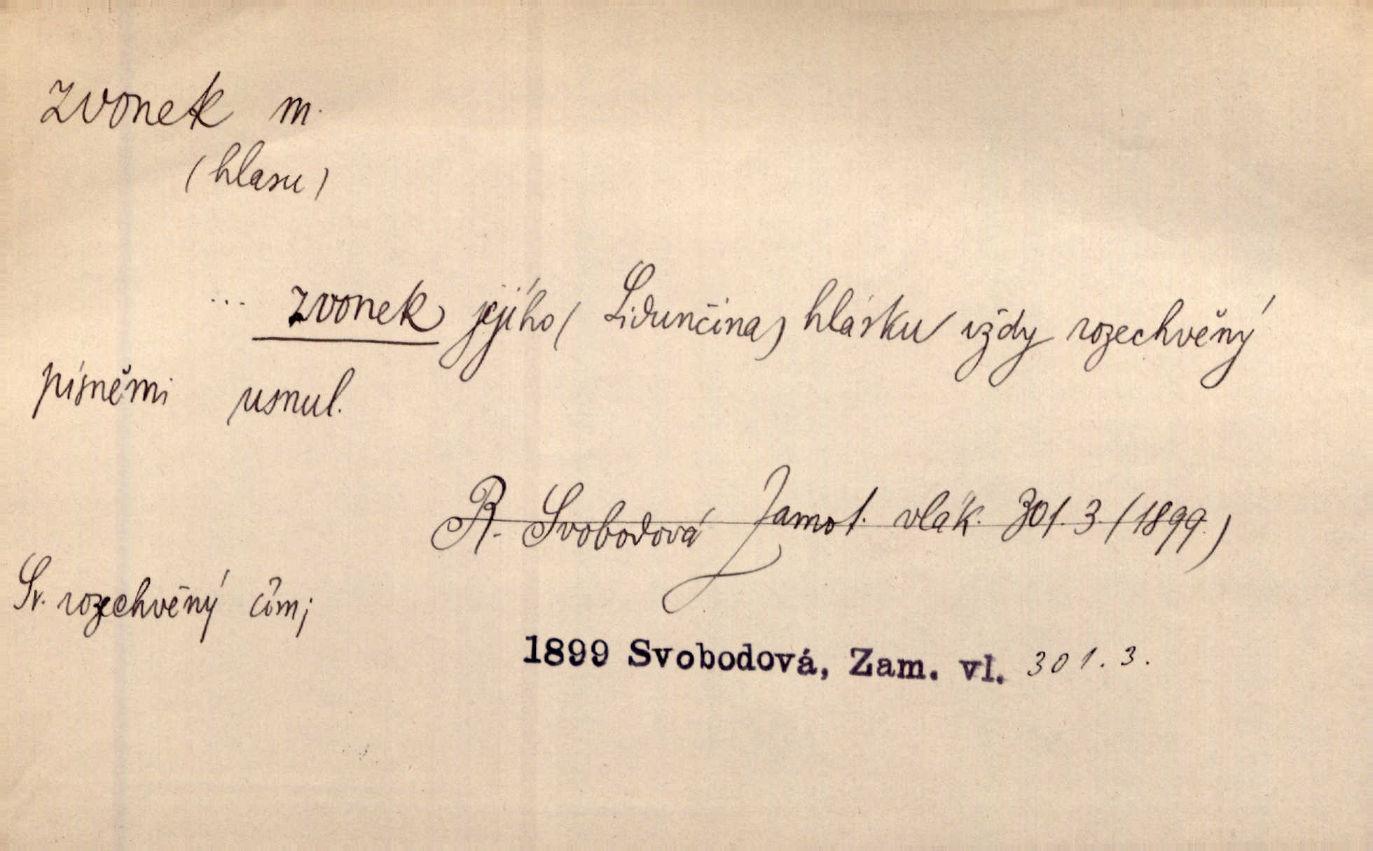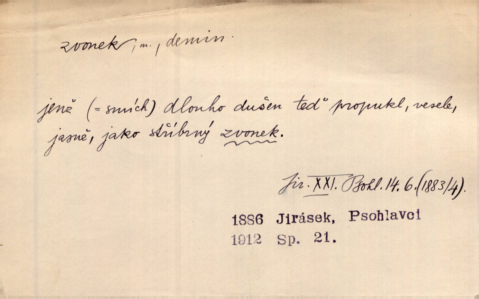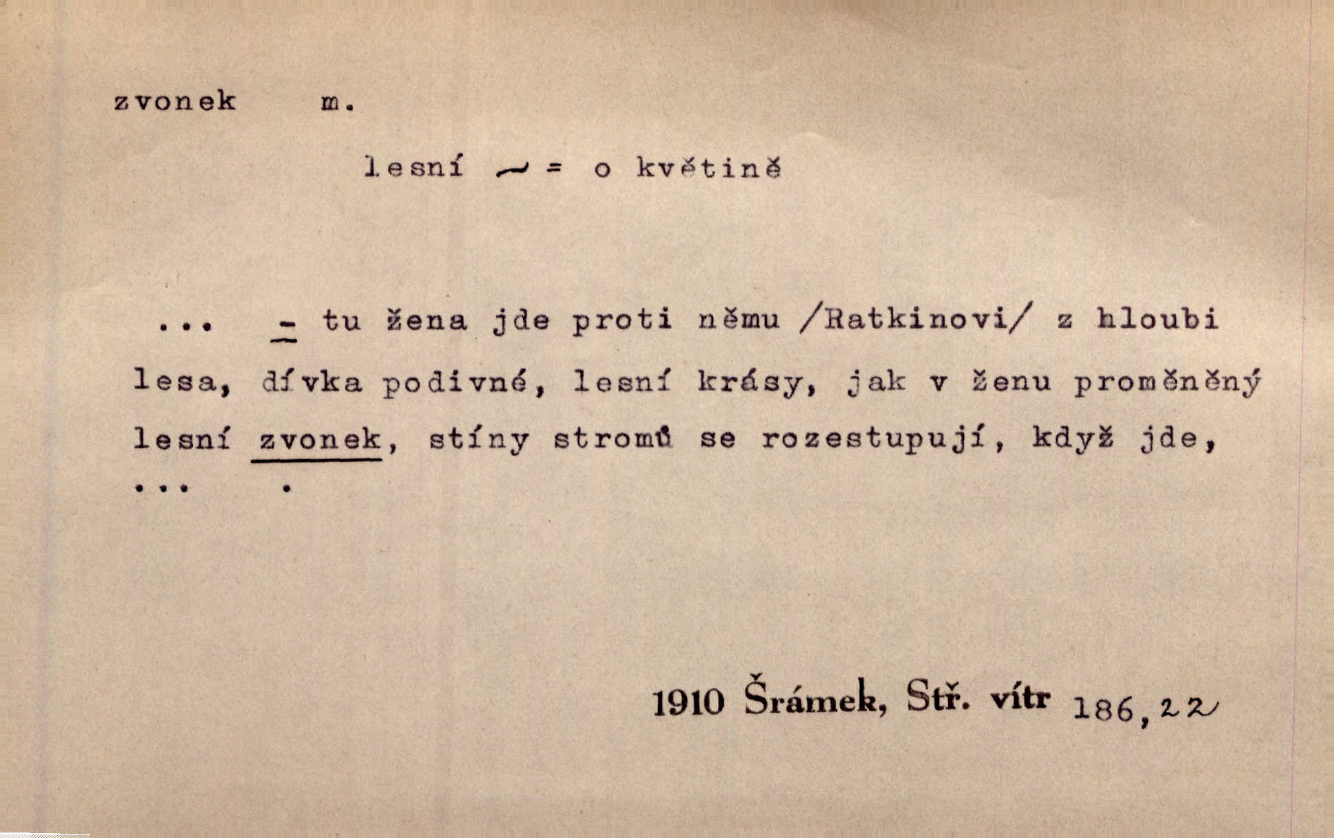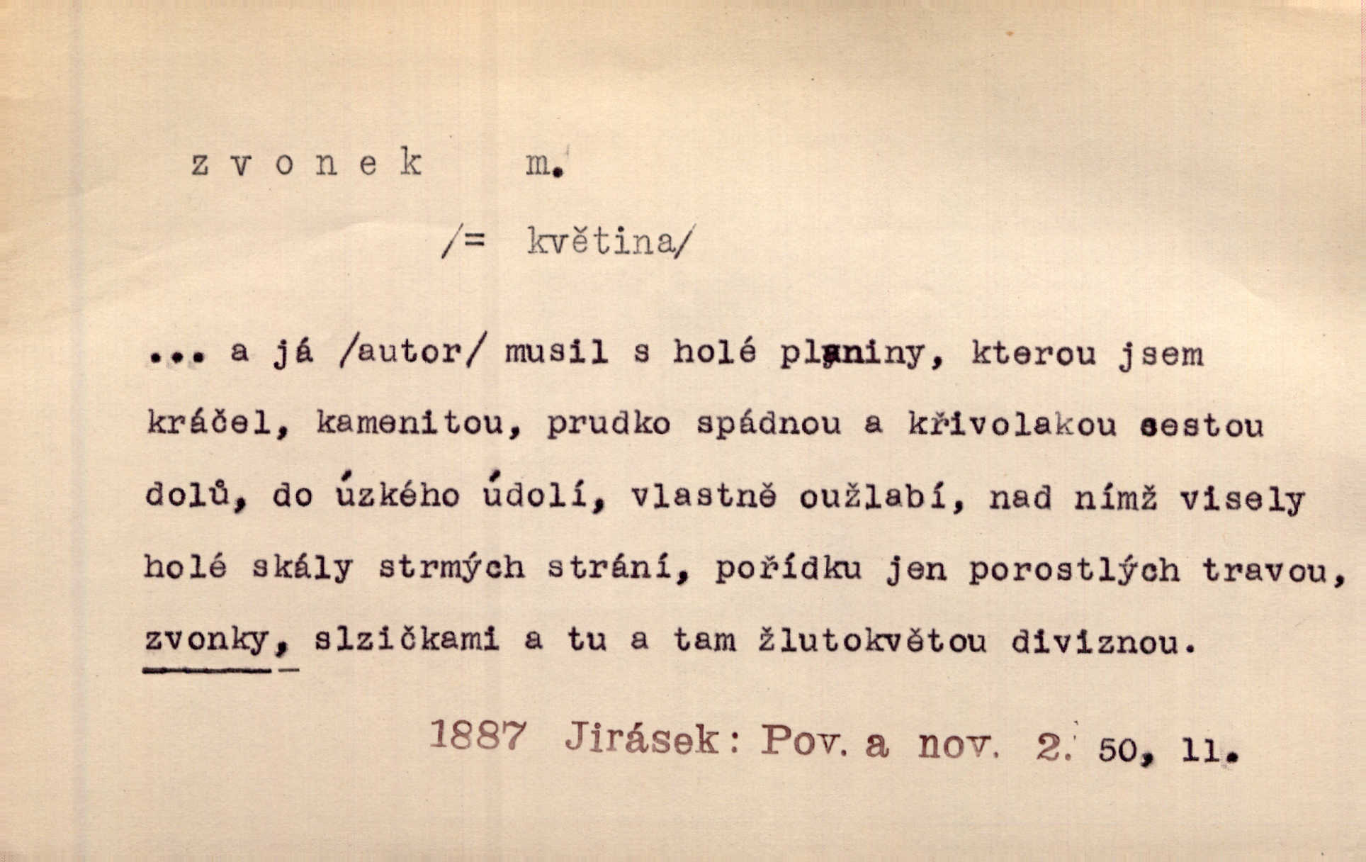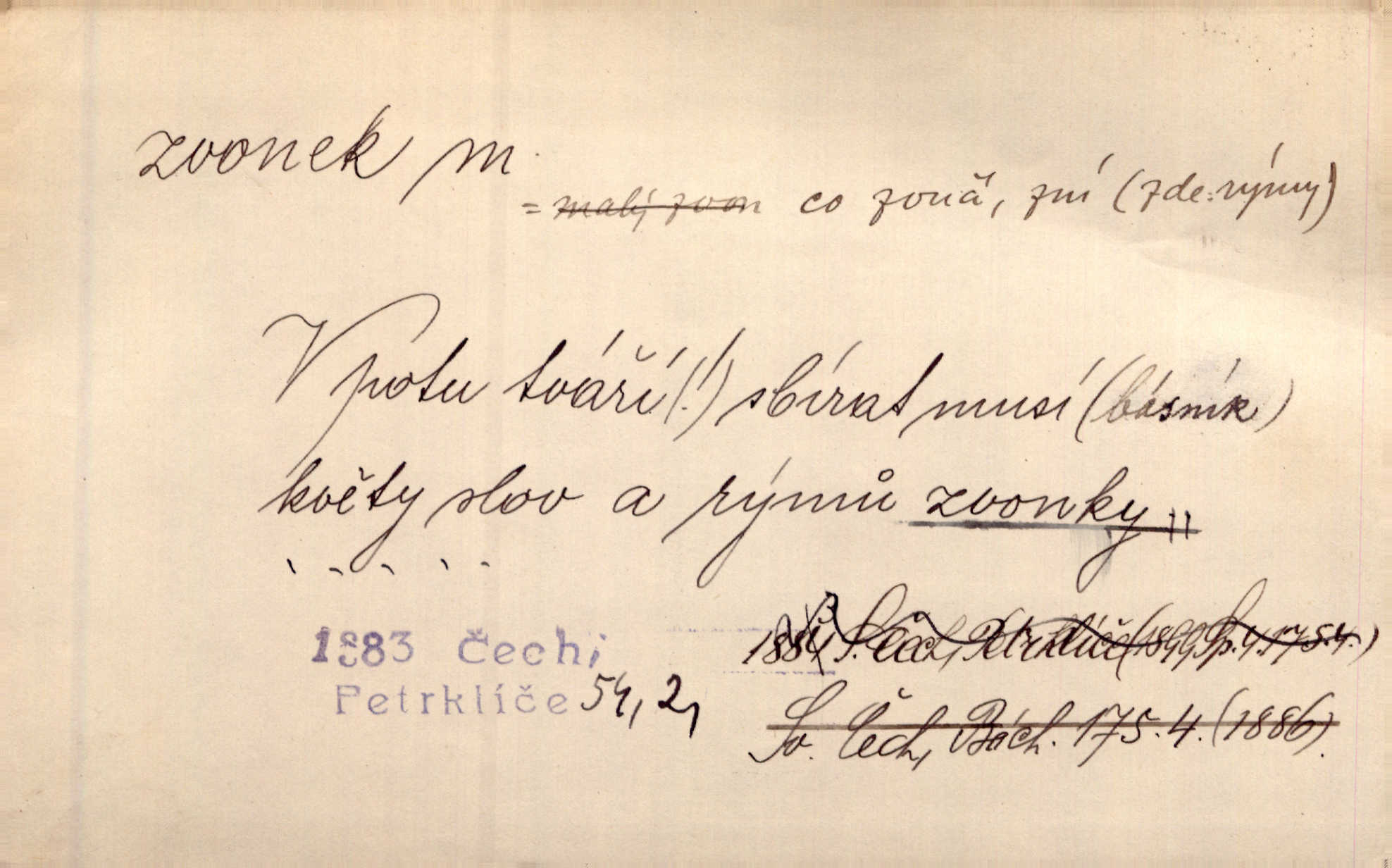 - zvonek, -nku m. zdrob. k zvon; malý zvon. Od Libočan přiletěl hlahol klekání a ve chvilce také na Polánce plačtivě rozklinkal se zvonek. Rais. Za chvilku přicházela tichým vzdechem vlnící se stříbrojasná píseň loretánských zvonků pod staré stromy. Zey. Kněžna pak vzala stříbrný zvonek se stolu a zazvonila. Něm. Jakž si dám pozor, abych zvonkem nezacinknul [při mši] ani jedenkráte více, než je potřebí. Ner. Kolem domků čekal sady, trávníky a lučiny, na nichž prohání se a čistými zvonky vyzvání brav i skot. Herb. U dveří zvonek zavzněl již. Mach. Bylo to chvíli před odjezdem vlaku, mezi cinkáním zvonků a signálů. Dyk. Do nastalé tišiny zařičel najednou zvonek telefonu. Čap. Ch. [Smích] dlouho dušen teď propukl, vesele, jasně, jako stříbrný zvonek. Jir. A hlava [opilého] sem tam jako zvonek se kolíbala. Sab. Hanýžce tlouklo srdíčko radostí jako zvonek, když se na ni zadíval. Baar. Přen. Zvonek jejího hlásku vždy rozechvěný písněmi usnul. R. Svob. V potu tváři sbírat musí [básník] květy slov a rýmů zvonky. Čech. Skřivan sype modré zvonky z blankytu do zelených řádek mladých plodin. Maj. „Ale to jsem ti zas něco vyzvonila, viď?“ „Milá teto, tys takový zvonek, za který ani není třeba tahat, zvoní sám od sebe“ povídavá osoba. Čap. Ch. Časté stonky jisté zvonky zvonění umíráčkem. Přísl. El. tech. elektrický zvonek zvonící zařízení založené na Wagnerově kladívku. Tech. signální (návěstní) zvonek. Pošt. znamení „zvonek“ klapka na dálnopisném stroji, kterou se dává volací znamení. D něco vzhledem připomínajícího zvonek, zvl. květní koruna podobná zvonku. Veliké krůpěje chvěly se v kalíšcích žlutých pryskyřníků, modrých zvonků. Nov. Před nimi kvetly zvonky a mateřídouška. Mah. K tanci lesním ženkám zvoní zvonků květ. Čech. Byl tam mech, jehličí, lesní zvonky. Podl. Bot. rod bylin z čeledi rostlin zvonkovitých, Campanula; zvonek rozkladitý. D olivově zeleně zbarvený zpěvavý pták. Hnízdí tu šoupálek, slavíci, zvonci, stehlíci a konopky. Mah. Na bezu nade mnou zvonek zpívá. F. S. Proch. Přes palouček do křovin přenesl se zvonek a odtud ostrými údery úzkého hrdélka bičuje vzduch. A. Mrš. Zool. rod ptáků z čeledi Fringillidae, Chloris; zvonek obecný.