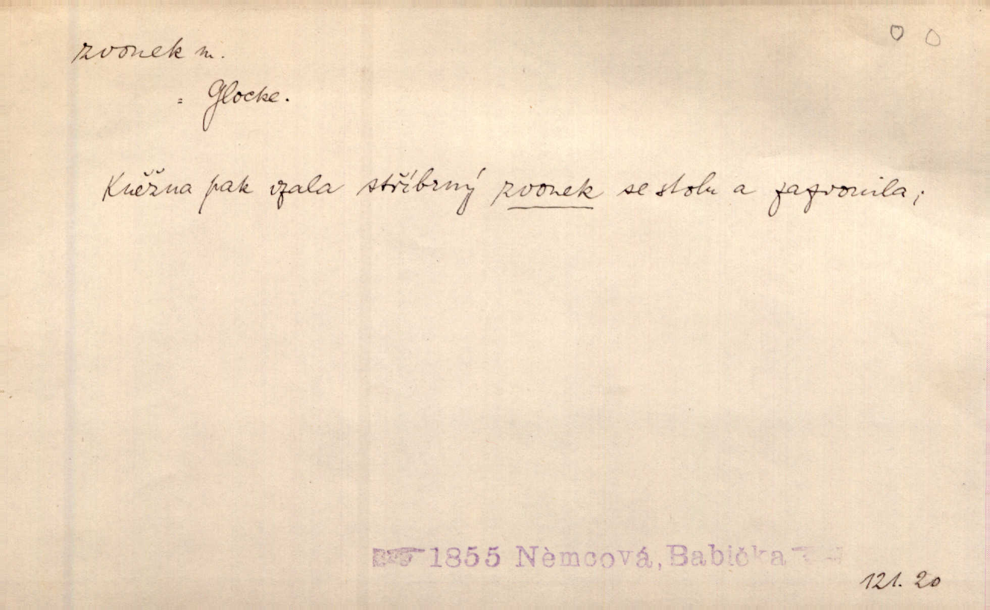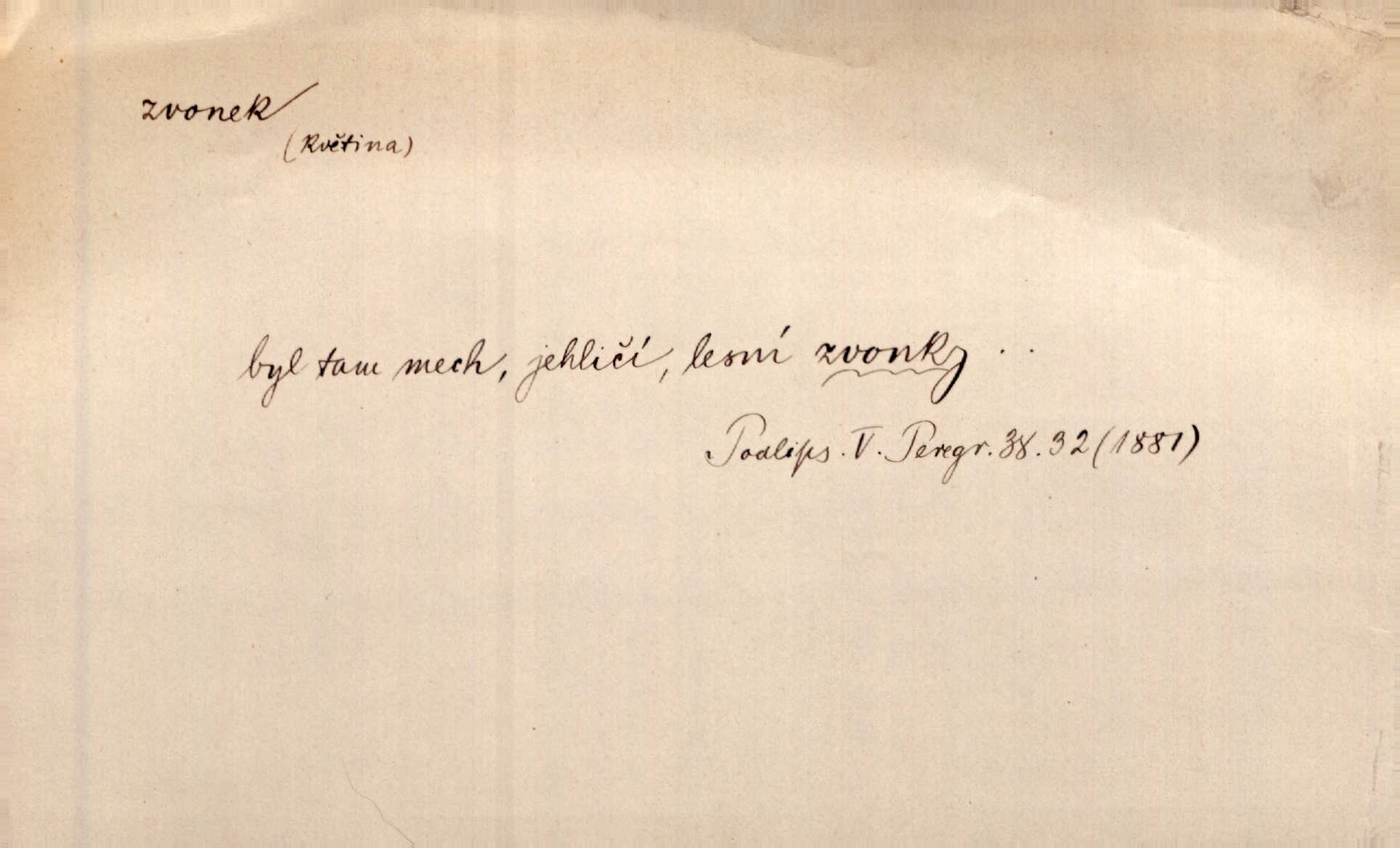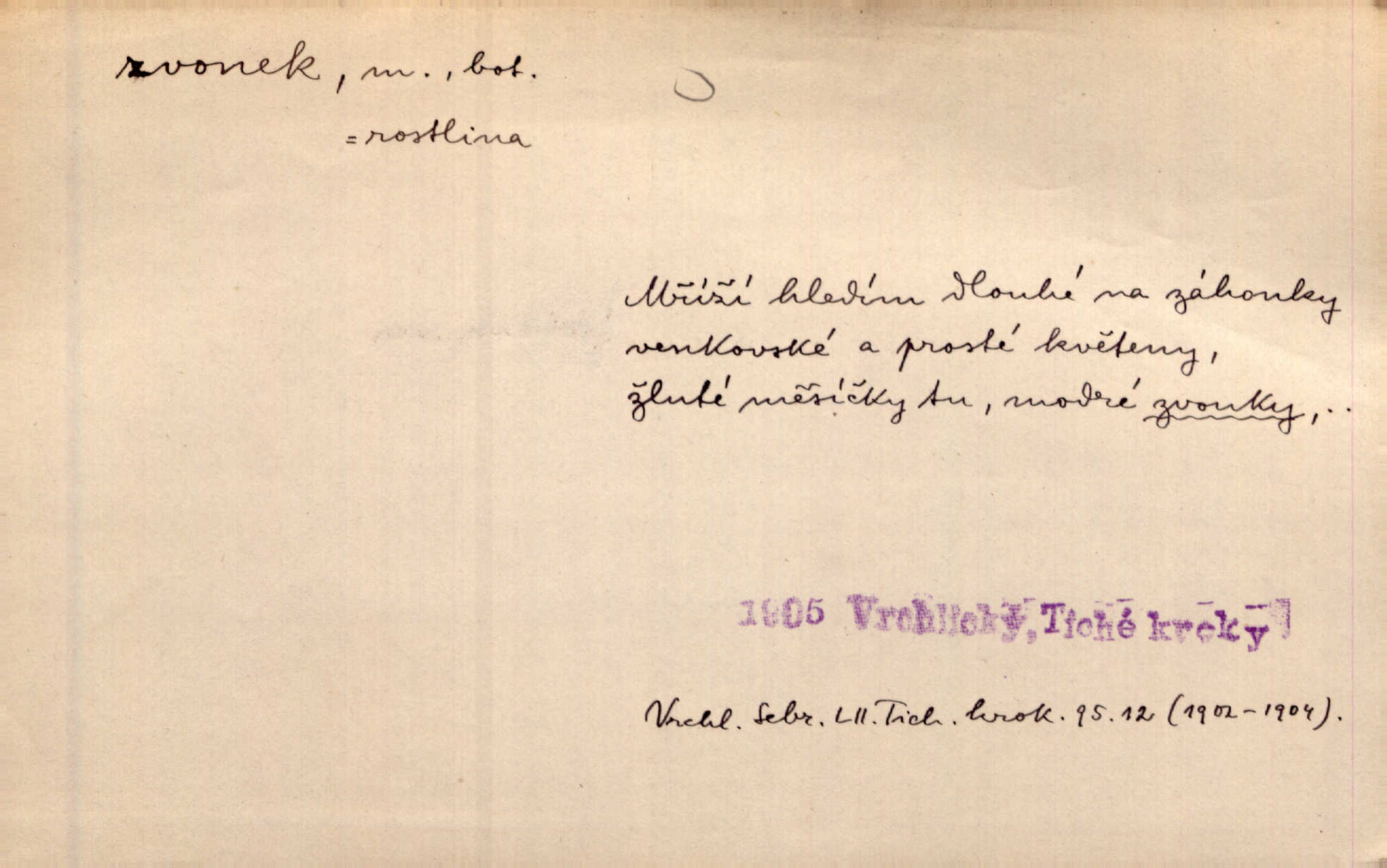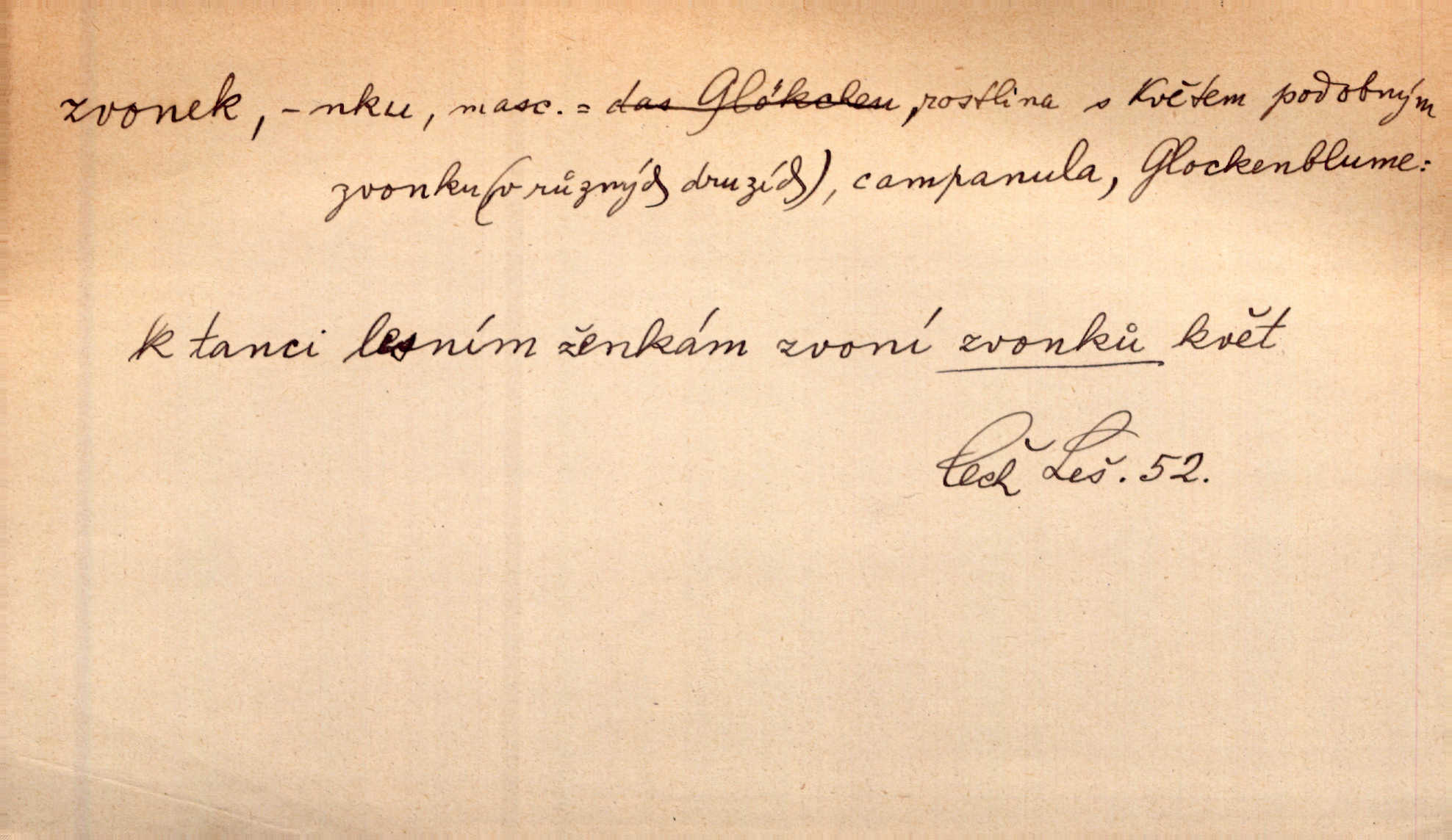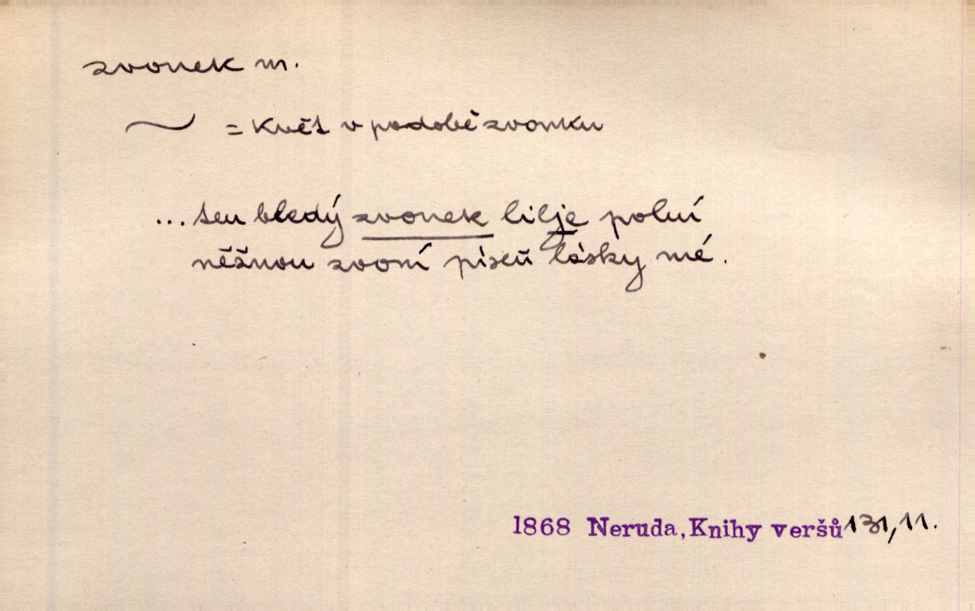 - zvonek, -nku m. zdrob. k zvon; malý zvon. Od Libočan přiletěl hlahol klekání a ve chvilce také na Polánce plačtivě rozklinkal se zvonek. Rais. Za chvilku přicházela tichým vzdechem vlnící se stříbrojasná píseň loretánských zvonků pod staré stromy. Zey. Kněžna pak vzala stříbrný zvonek se stolu a zazvonila. Něm. Jakž si dám pozor, abych zvonkem nezacinknul [při mši] ani jedenkráte více, než je potřebí. Ner. Kolem domků čekal sady, trávníky a lučiny, na nichž prohání se a čistými zvonky vyzvání brav i skot. Herb. U dveří zvonek zavzněl již. Mach. Bylo to chvíli před odjezdem vlaku, mezi cinkáním zvonků a signálů. Dyk. Do nastalé tišiny zařičel najednou zvonek telefonu. Čap. Ch. [Smích] dlouho dušen teď propukl, vesele, jasně, jako stříbrný zvonek. Jir. A hlava [opilého] sem tam jako zvonek se kolíbala. Sab. Hanýžce tlouklo srdíčko radostí jako zvonek, když se na ni zadíval. Baar. Přen. Zvonek jejího hlásku vždy rozechvěný písněmi usnul. R. Svob. V potu tváři sbírat musí [básník] květy slov a rýmů zvonky. Čech. Skřivan sype modré zvonky z blankytu do zelených řádek mladých plodin. Maj. „Ale to jsem ti zas něco vyzvonila, viď?“ „Milá teto, tys takový zvonek, za který ani není třeba tahat, zvoní sám od sebe“ povídavá osoba. Čap. Ch. Časté stonky jisté zvonky zvonění umíráčkem. Přísl. El. tech. elektrický zvonek zvonící zařízení založené na Wagnerově kladívku. Tech. signální (návěstní) zvonek. Pošt. znamení „zvonek“ klapka na dálnopisném stroji, kterou se dává volací znamení. D něco vzhledem připomínajícího zvonek, zvl. květní koruna podobná zvonku. Veliké krůpěje chvěly se v kalíšcích žlutých pryskyřníků, modrých zvonků. Nov. Před nimi kvetly zvonky a mateřídouška. Mah. K tanci lesním ženkám zvoní zvonků květ. Čech. Byl tam mech, jehličí, lesní zvonky. Podl. Bot. rod bylin z čeledi rostlin zvonkovitých, Campanula; zvonek rozkladitý. D olivově zeleně zbarvený zpěvavý pták. Hnízdí tu šoupálek, slavíci, zvonci, stehlíci a konopky. Mah. Na bezu nade mnou zvonek zpívá. F. S. Proch. Přes palouček do křovin přenesl se zvonek a odtud ostrými údery úzkého hrdélka bičuje vzduch. A. Mrš. Zool. rod ptáků z čeledi Fringillidae, Chloris; zvonek obecný.
