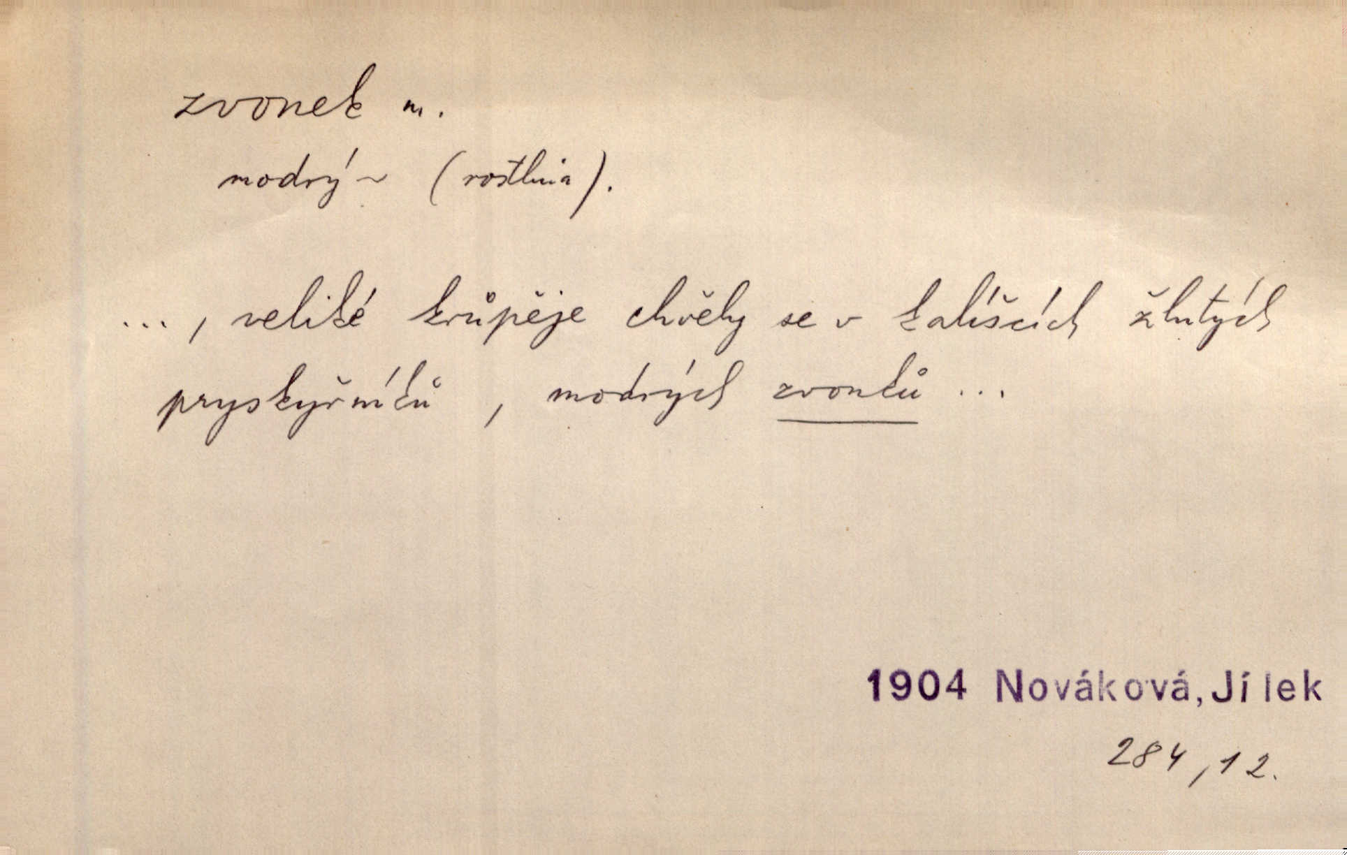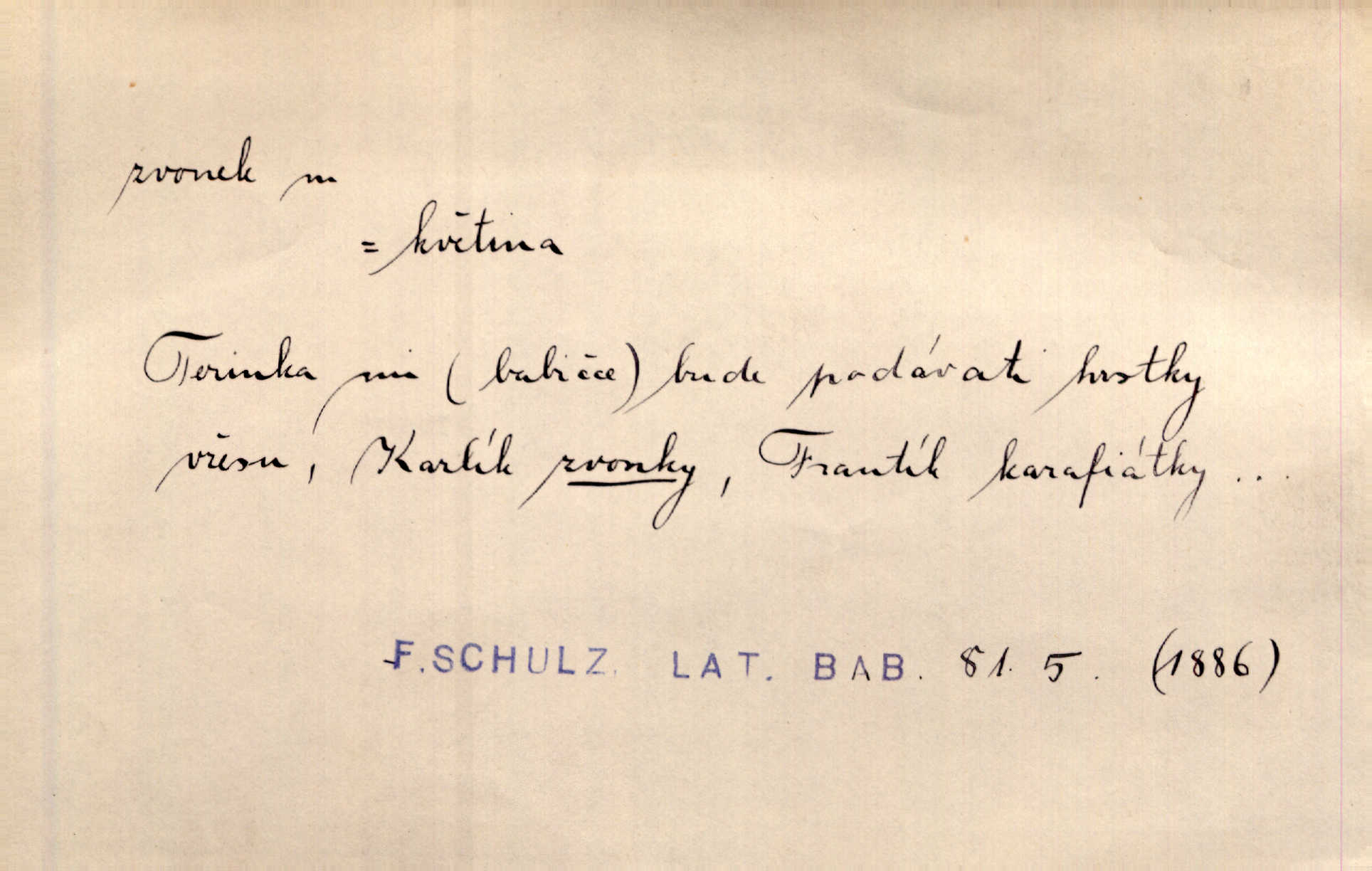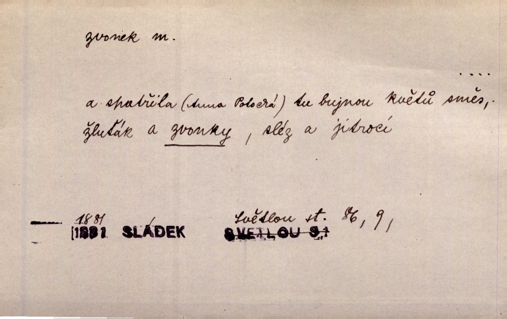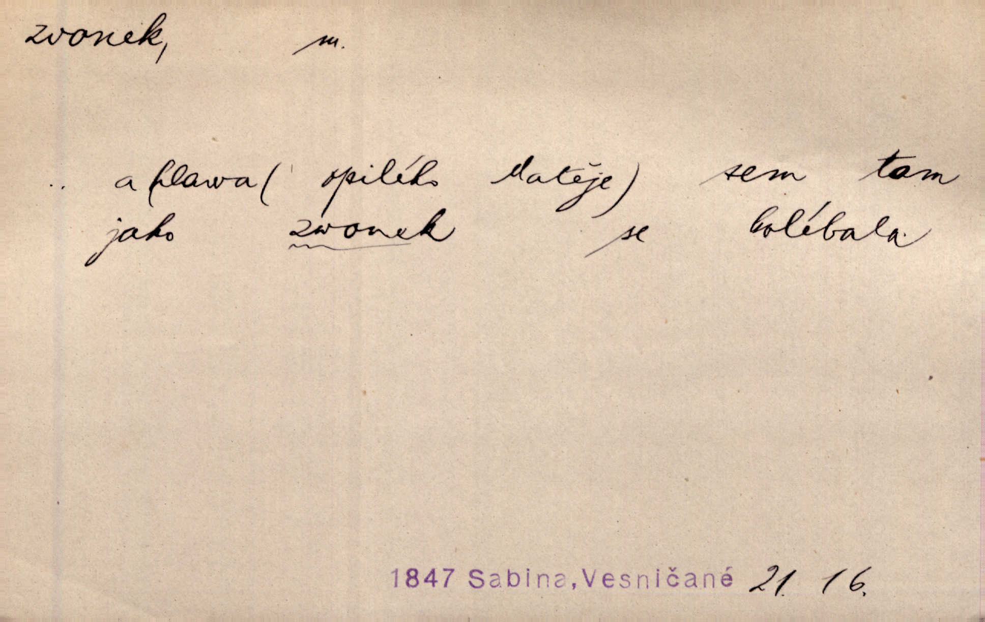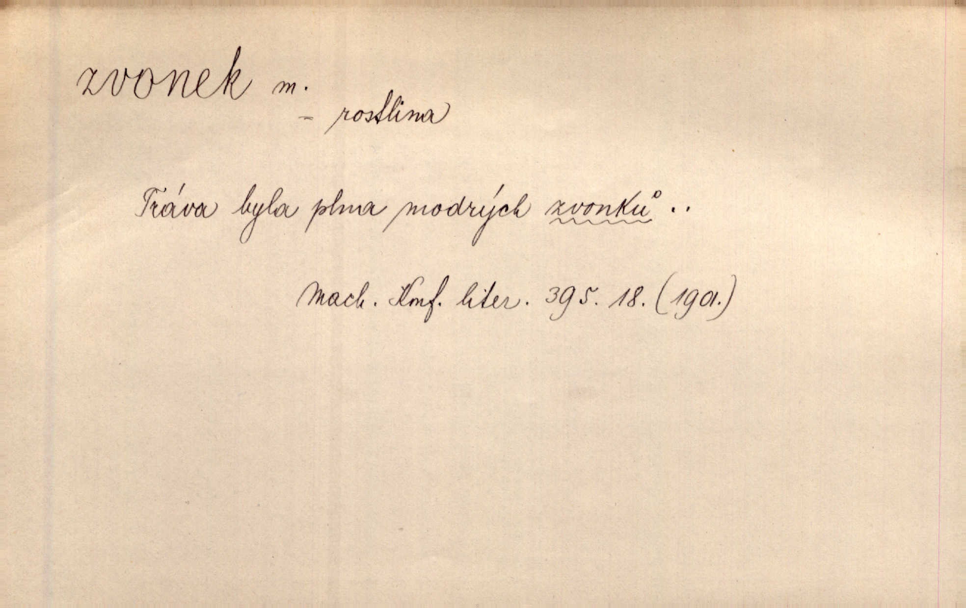 - zvonek, -nku m. zdrob. k zvon; malý zvon. Od Libočan přiletěl hlahol klekání a ve chvilce také na Polánce plačtivě rozklinkal se zvonek. Rais. Za chvilku přicházela tichým vzdechem vlnící se stříbrojasná píseň loretánských zvonků pod staré stromy. Zey. Kněžna pak vzala stříbrný zvonek se stolu a zazvonila. Něm. Jakž si dám pozor, abych zvonkem nezacinknul [při mši] ani jedenkráte více, než je potřebí. Ner. Kolem domků čekal sady, trávníky a lučiny, na nichž prohání se a čistými zvonky vyzvání brav i skot. Herb. U dveří zvonek zavzněl již. Mach. Bylo to chvíli před odjezdem vlaku, mezi cinkáním zvonků a signálů. Dyk. Do nastalé tišiny zařičel najednou zvonek telefonu. Čap. Ch. [Smích] dlouho dušen teď propukl, vesele, jasně, jako stříbrný zvonek. Jir. A hlava [opilého] sem tam jako zvonek se kolíbala. Sab. Hanýžce tlouklo srdíčko radostí jako zvonek, když se na ni zadíval. Baar. Přen. Zvonek jejího hlásku vždy rozechvěný písněmi usnul. R. Svob. V potu tváři sbírat musí [básník] květy slov a rýmů zvonky. Čech. Skřivan sype modré zvonky z blankytu do zelených řádek mladých plodin. Maj. „Ale to jsem ti zas něco vyzvonila, viď?“ „Milá teto, tys takový zvonek, za který ani není třeba tahat, zvoní sám od sebe“ povídavá osoba. Čap. Ch. Časté stonky jisté zvonky zvonění umíráčkem. Přísl. El. tech. elektrický zvonek zvonící zařízení založené na Wagnerově kladívku. Tech. signální (návěstní) zvonek. Pošt. znamení „zvonek“ klapka na dálnopisném stroji, kterou se dává volací znamení. D něco vzhledem připomínajícího zvonek, zvl. květní koruna podobná zvonku. Veliké krůpěje chvěly se v kalíšcích žlutých pryskyřníků, modrých zvonků. Nov. Před nimi kvetly zvonky a mateřídouška. Mah. K tanci lesním ženkám zvoní zvonků květ. Čech. Byl tam mech, jehličí, lesní zvonky. Podl. Bot. rod bylin z čeledi rostlin zvonkovitých, Campanula; zvonek rozkladitý. D olivově zeleně zbarvený zpěvavý pták. Hnízdí tu šoupálek, slavíci, zvonci, stehlíci a konopky. Mah. Na bezu nade mnou zvonek zpívá. F. S. Proch. Přes palouček do křovin přenesl se zvonek a odtud ostrými údery úzkého hrdélka bičuje vzduch. A. Mrš. Zool. rod ptáků z čeledi Fringillidae, Chloris; zvonek obecný.