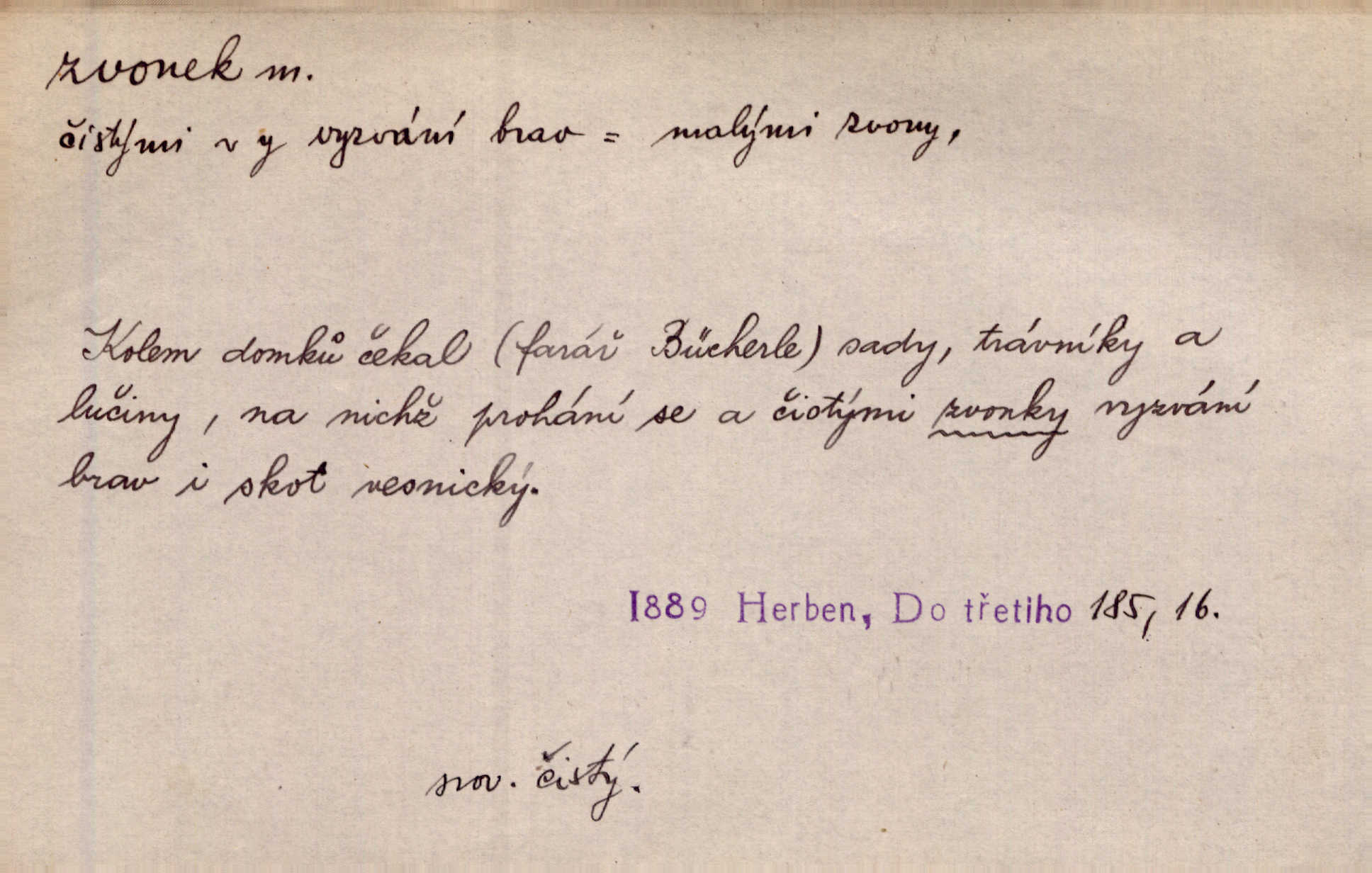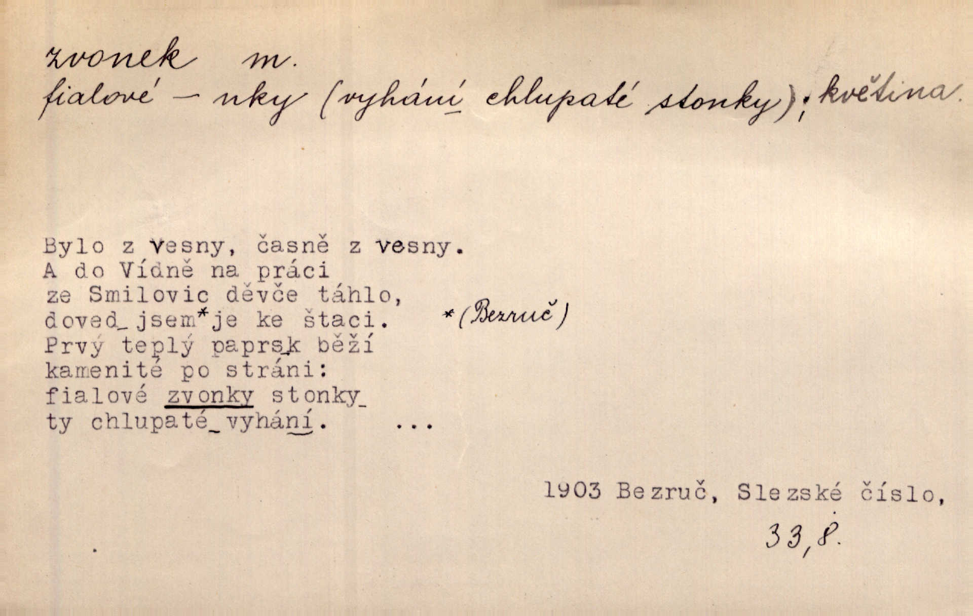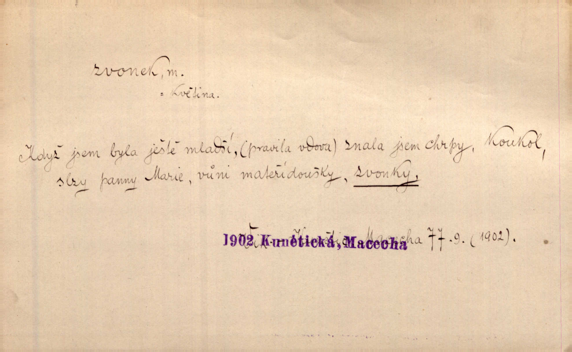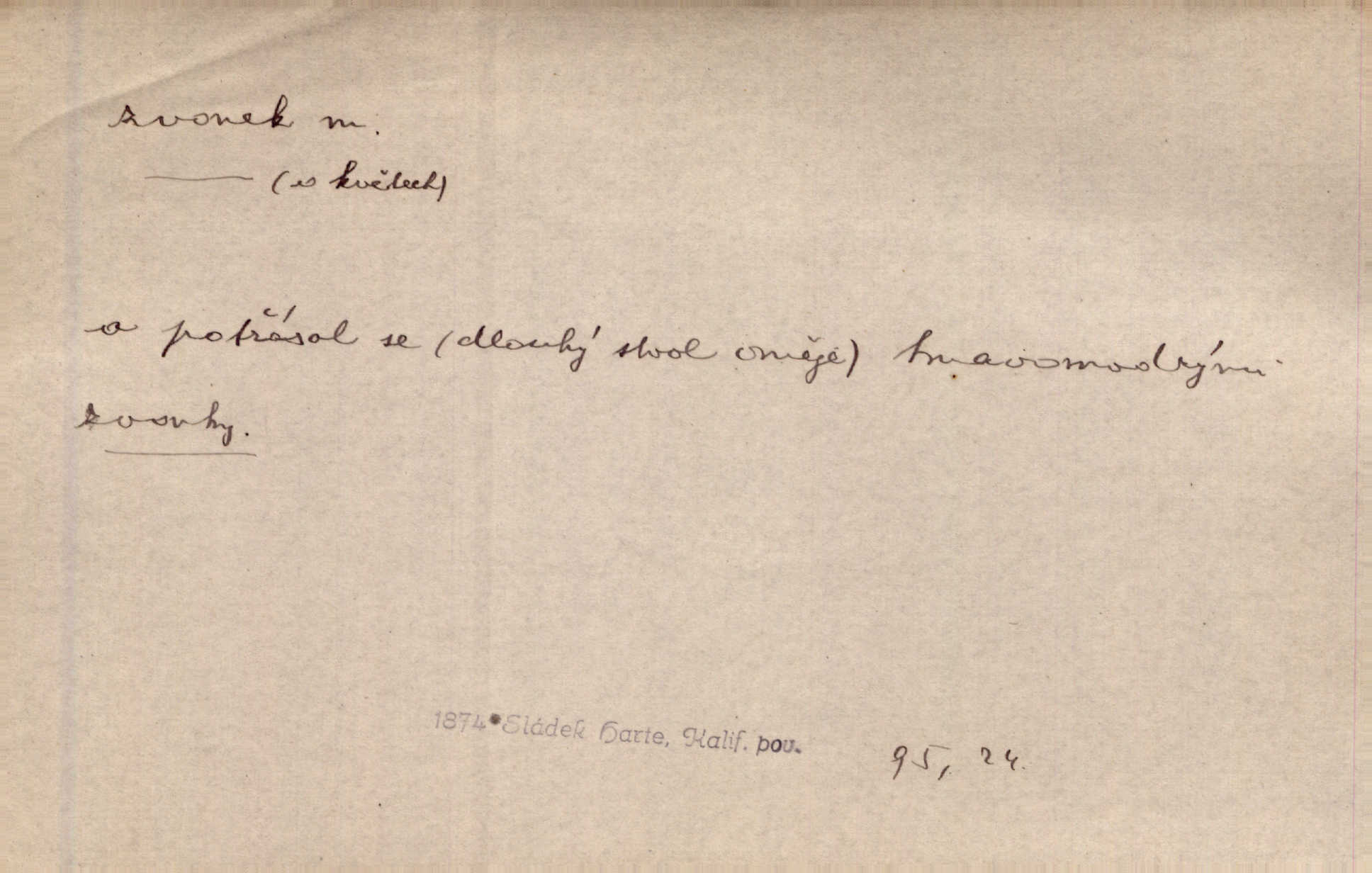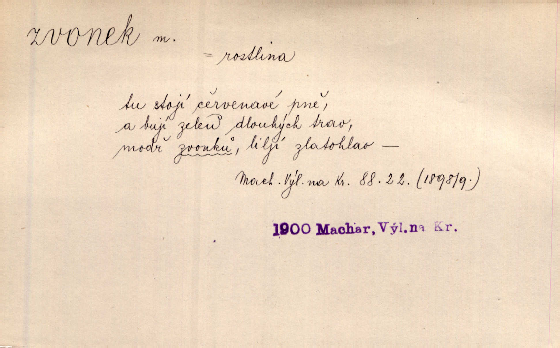 - zvonek, -nku m. zdrob. k zvon; malý zvon. Od Libočan přiletěl hlahol klekání a ve chvilce také na Polánce plačtivě rozklinkal se zvonek. Rais. Za chvilku přicházela tichým vzdechem vlnící se stříbrojasná píseň loretánských zvonků pod staré stromy. Zey. Kněžna pak vzala stříbrný zvonek se stolu a zazvonila. Něm. Jakž si dám pozor, abych zvonkem nezacinknul [při mši] ani jedenkráte více, než je potřebí. Ner. Kolem domků čekal sady, trávníky a lučiny, na nichž prohání se a čistými zvonky vyzvání brav i skot. Herb. U dveří zvonek zavzněl již. Mach. Bylo to chvíli před odjezdem vlaku, mezi cinkáním zvonků a signálů. Dyk. Do nastalé tišiny zařičel najednou zvonek telefonu. Čap. Ch. [Smích] dlouho dušen teď propukl, vesele, jasně, jako stříbrný zvonek. Jir. A hlava [opilého] sem tam jako zvonek se kolíbala. Sab. Hanýžce tlouklo srdíčko radostí jako zvonek, když se na ni zadíval. Baar. Přen. Zvonek jejího hlásku vždy rozechvěný písněmi usnul. R. Svob. V potu tváři sbírat musí [básník] květy slov a rýmů zvonky. Čech. Skřivan sype modré zvonky z blankytu do zelených řádek mladých plodin. Maj. „Ale to jsem ti zas něco vyzvonila, viď?“ „Milá teto, tys takový zvonek, za který ani není třeba tahat, zvoní sám od sebe“ povídavá osoba. Čap. Ch. Časté stonky jisté zvonky zvonění umíráčkem. Přísl. El. tech. elektrický zvonek zvonící zařízení založené na Wagnerově kladívku. Tech. signální (návěstní) zvonek. Pošt. znamení „zvonek“ klapka na dálnopisném stroji, kterou se dává volací znamení. D něco vzhledem připomínajícího zvonek, zvl. květní koruna podobná zvonku. Veliké krůpěje chvěly se v kalíšcích žlutých pryskyřníků, modrých zvonků. Nov. Před nimi kvetly zvonky a mateřídouška. Mah. K tanci lesním ženkám zvoní zvonků květ. Čech. Byl tam mech, jehličí, lesní zvonky. Podl. Bot. rod bylin z čeledi rostlin zvonkovitých, Campanula; zvonek rozkladitý. D olivově zeleně zbarvený zpěvavý pták. Hnízdí tu šoupálek, slavíci, zvonci, stehlíci a konopky. Mah. Na bezu nade mnou zvonek zpívá. F. S. Proch. Přes palouček do křovin přenesl se zvonek a odtud ostrými údery úzkého hrdélka bičuje vzduch. A. Mrš. Zool. rod ptáků z čeledi Fringillidae, Chloris; zvonek obecný.