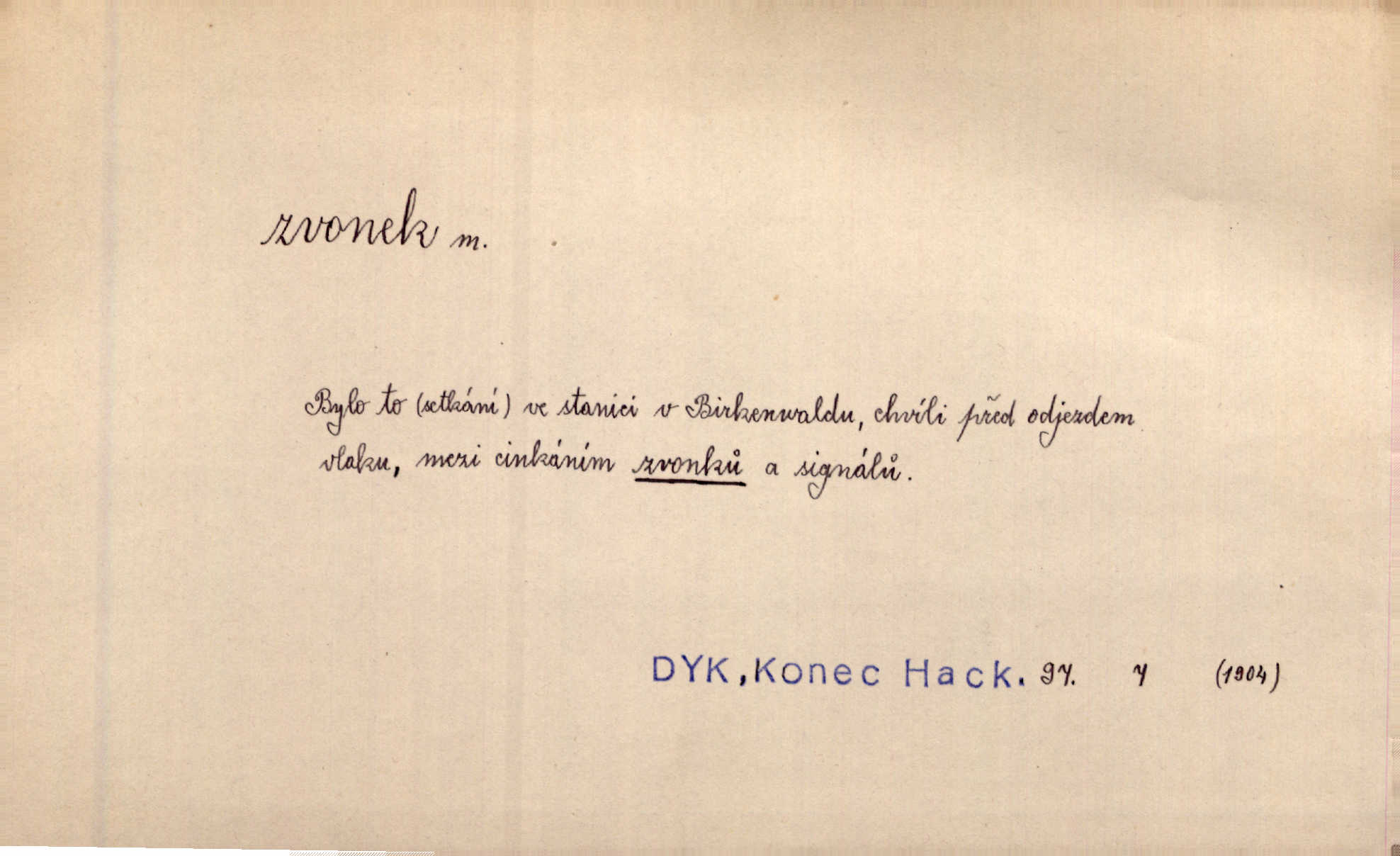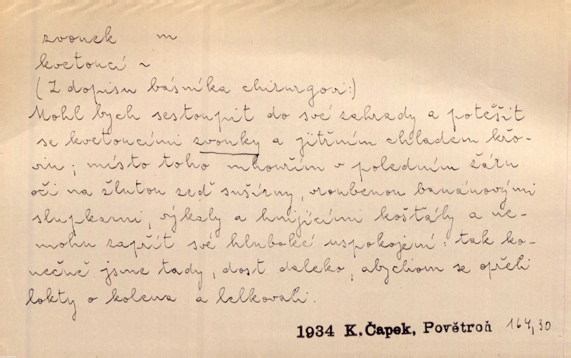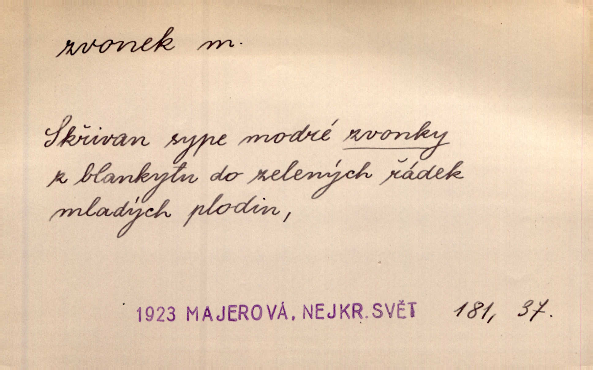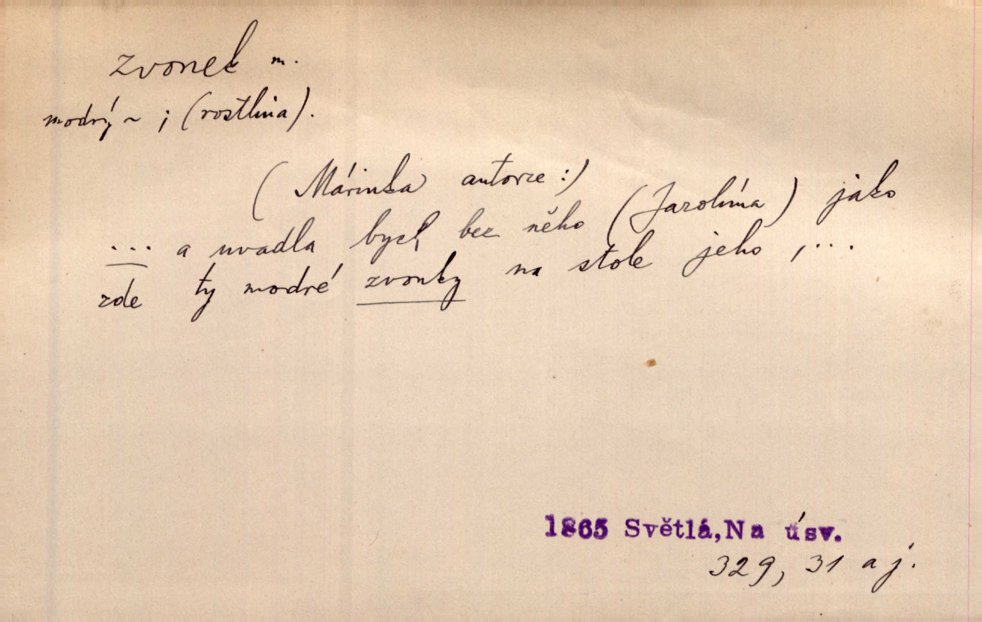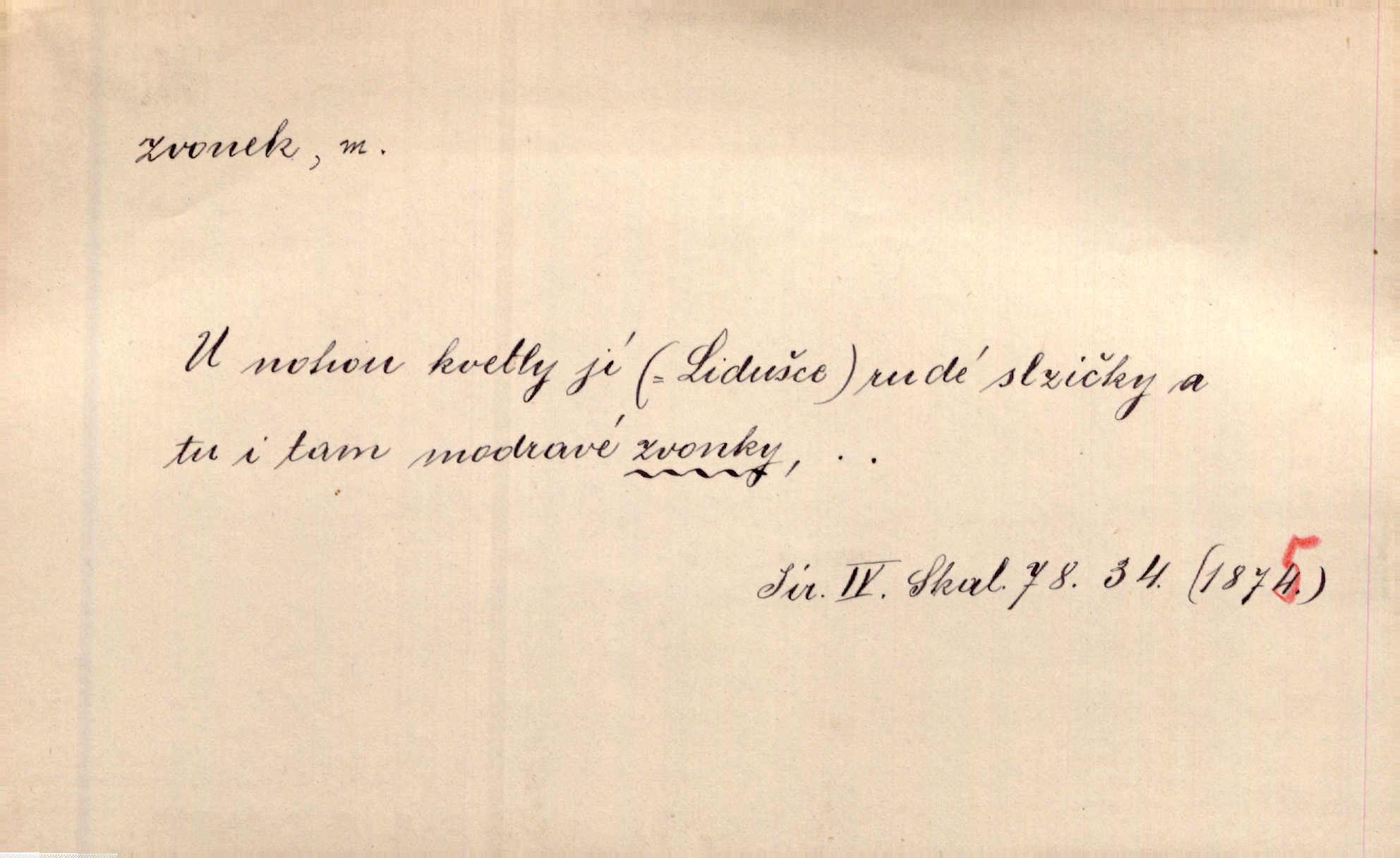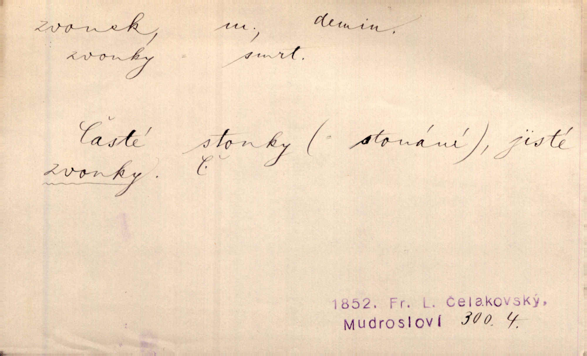 - zvonek, -nku m. zdrob. k zvon; malý zvon. Od Libočan přiletěl hlahol klekání a ve chvilce také na Polánce plačtivě rozklinkal se zvonek. Rais. Za chvilku přicházela tichým vzdechem vlnící se stříbrojasná píseň loretánských zvonků pod staré stromy. Zey. Kněžna pak vzala stříbrný zvonek se stolu a zazvonila. Něm. Jakž si dám pozor, abych zvonkem nezacinknul [při mši] ani jedenkráte více, než je potřebí. Ner. Kolem domků čekal sady, trávníky a lučiny, na nichž prohání se a čistými zvonky vyzvání brav i skot. Herb. U dveří zvonek zavzněl již. Mach. Bylo to chvíli před odjezdem vlaku, mezi cinkáním zvonků a signálů. Dyk. Do nastalé tišiny zařičel najednou zvonek telefonu. Čap. Ch. [Smích] dlouho dušen teď propukl, vesele, jasně, jako stříbrný zvonek. Jir. A hlava [opilého] sem tam jako zvonek se kolíbala. Sab. Hanýžce tlouklo srdíčko radostí jako zvonek, když se na ni zadíval. Baar. Přen. Zvonek jejího hlásku vždy rozechvěný písněmi usnul. R. Svob. V potu tváři sbírat musí [básník] květy slov a rýmů zvonky. Čech. Skřivan sype modré zvonky z blankytu do zelených řádek mladých plodin. Maj. „Ale to jsem ti zas něco vyzvonila, viď?“ „Milá teto, tys takový zvonek, za který ani není třeba tahat, zvoní sám od sebe“ povídavá osoba. Čap. Ch. Časté stonky jisté zvonky zvonění umíráčkem. Přísl. El. tech. elektrický zvonek zvonící zařízení založené na Wagnerově kladívku. Tech. signální (návěstní) zvonek. Pošt. znamení „zvonek“ klapka na dálnopisném stroji, kterou se dává volací znamení. D něco vzhledem připomínajícího zvonek, zvl. květní koruna podobná zvonku. Veliké krůpěje chvěly se v kalíšcích žlutých pryskyřníků, modrých zvonků. Nov. Před nimi kvetly zvonky a mateřídouška. Mah. K tanci lesním ženkám zvoní zvonků květ. Čech. Byl tam mech, jehličí, lesní zvonky. Podl. Bot. rod bylin z čeledi rostlin zvonkovitých, Campanula; zvonek rozkladitý. D olivově zeleně zbarvený zpěvavý pták. Hnízdí tu šoupálek, slavíci, zvonci, stehlíci a konopky. Mah. Na bezu nade mnou zvonek zpívá. F. S. Proch. Přes palouček do křovin přenesl se zvonek a odtud ostrými údery úzkého hrdélka bičuje vzduch. A. Mrš. Zool. rod ptáků z čeledi Fringillidae, Chloris; zvonek obecný.