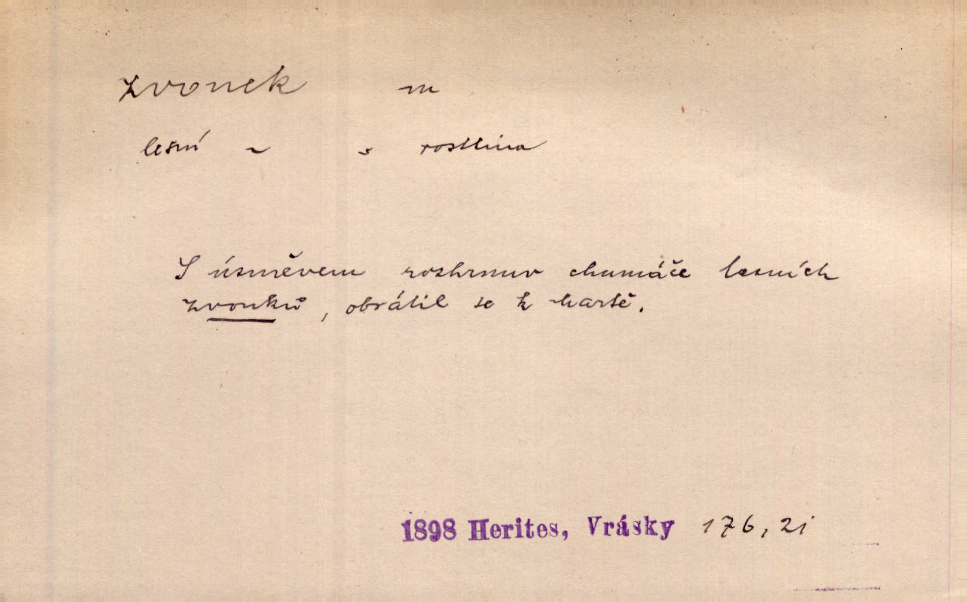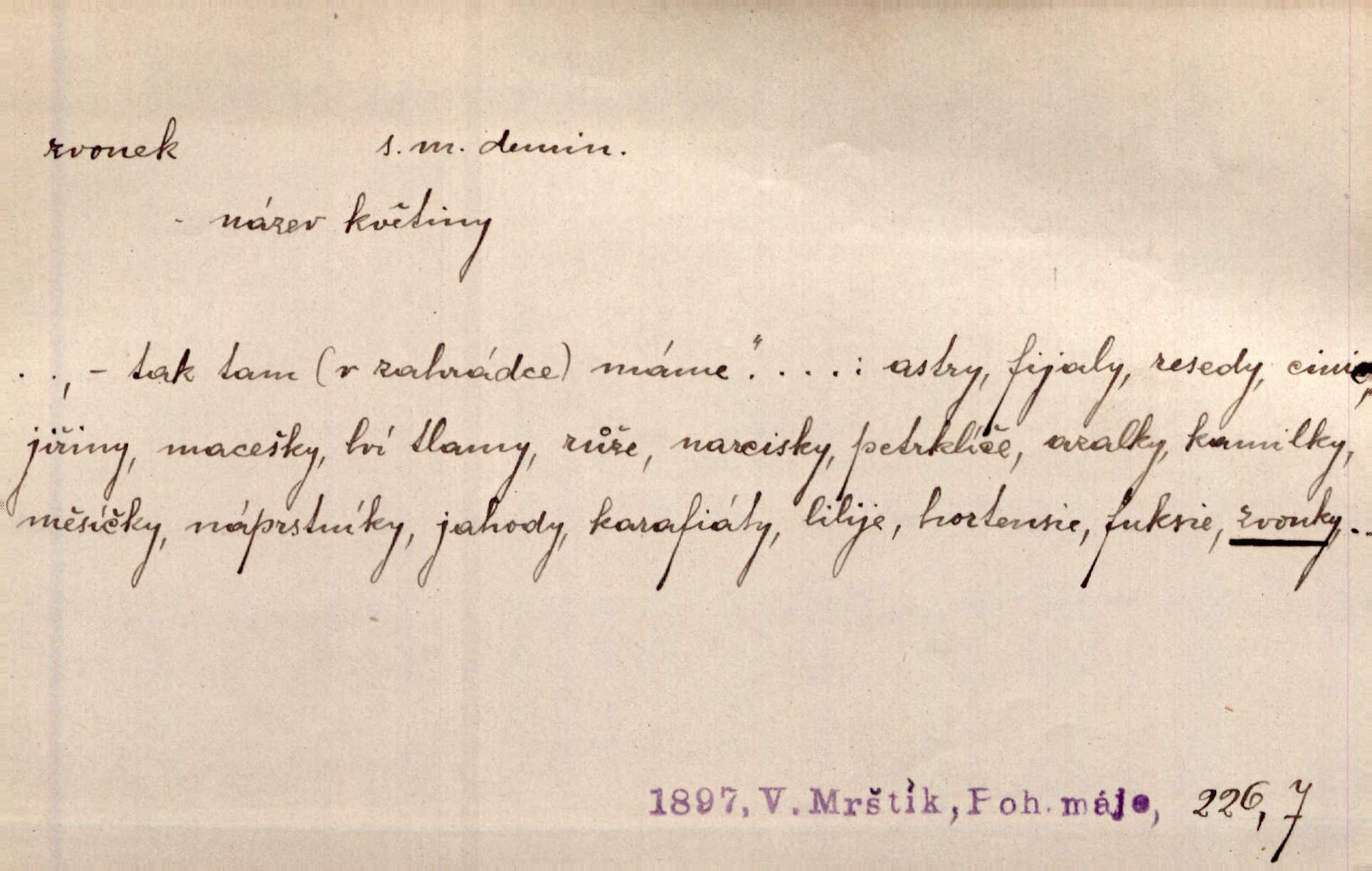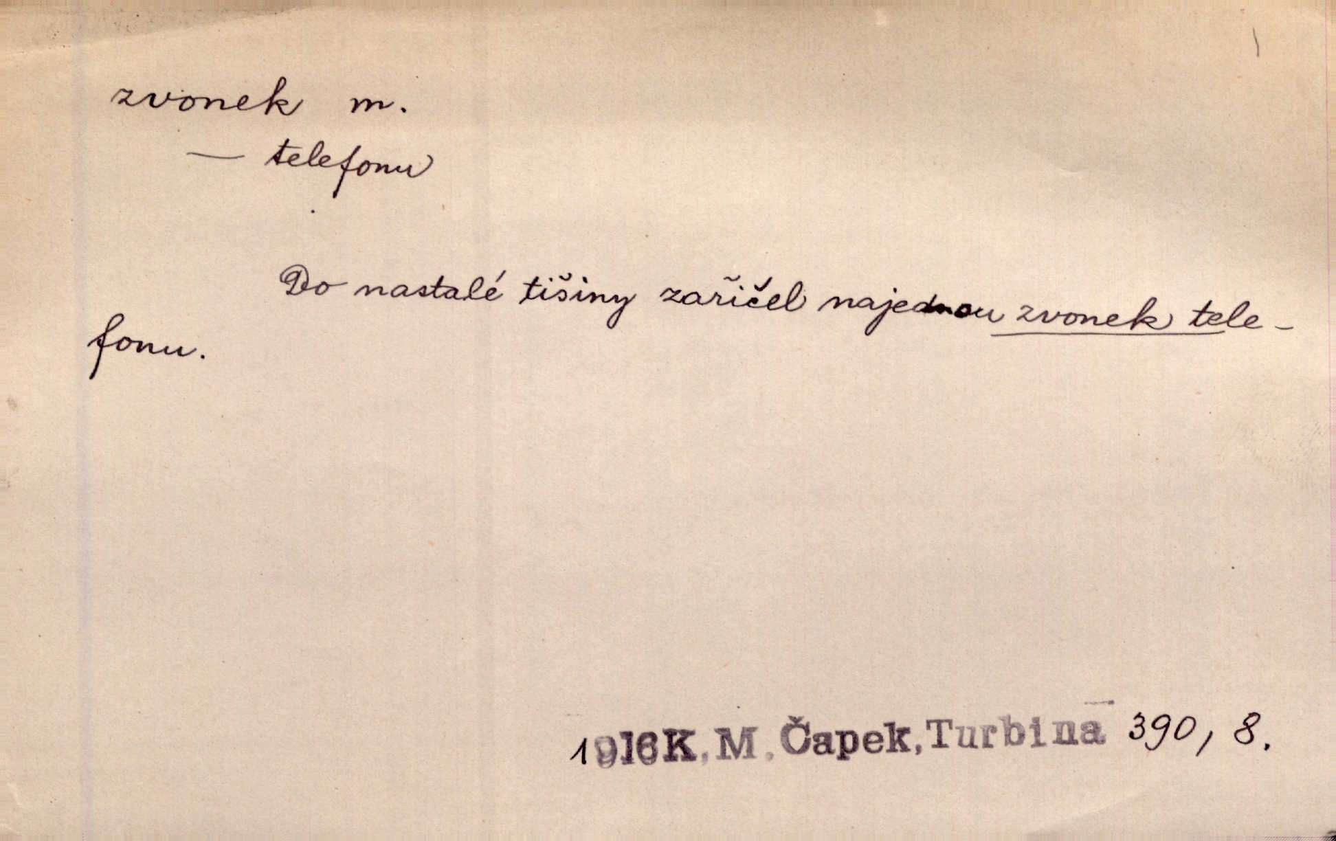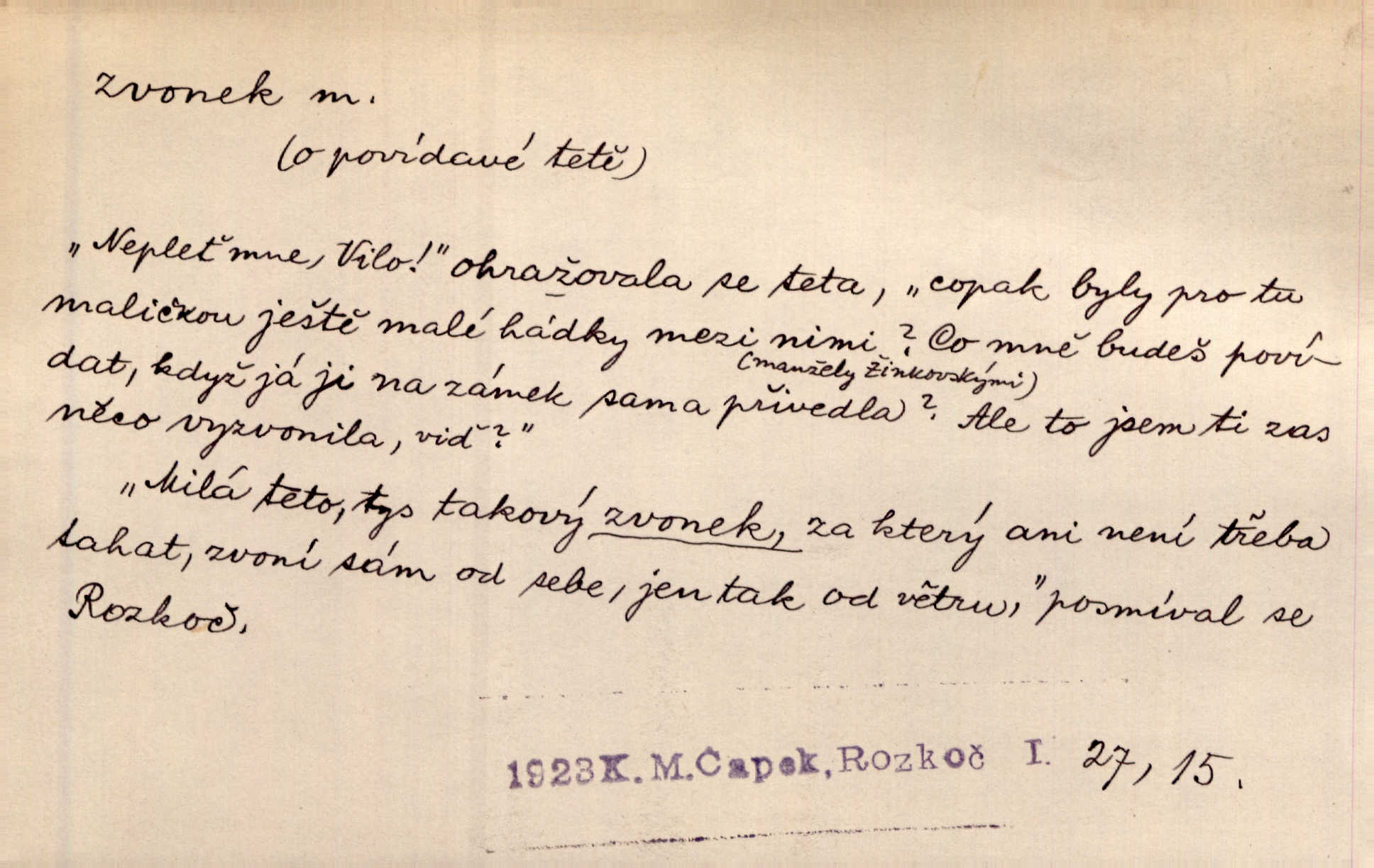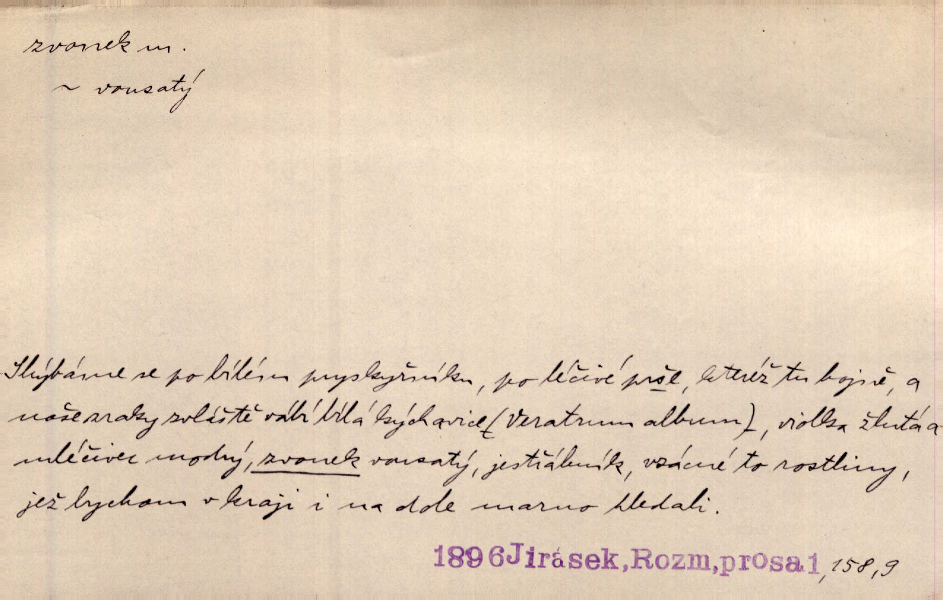 - zvonek, -nku m. zdrob. k zvon; malý zvon. Od Libočan přiletěl hlahol klekání a ve chvilce také na Polánce plačtivě rozklinkal se zvonek. Rais. Za chvilku přicházela tichým vzdechem vlnící se stříbrojasná píseň loretánských zvonků pod staré stromy. Zey. Kněžna pak vzala stříbrný zvonek se stolu a zazvonila. Něm. Jakž si dám pozor, abych zvonkem nezacinknul [při mši] ani jedenkráte více, než je potřebí. Ner. Kolem domků čekal sady, trávníky a lučiny, na nichž prohání se a čistými zvonky vyzvání brav i skot. Herb. U dveří zvonek zavzněl již. Mach. Bylo to chvíli před odjezdem vlaku, mezi cinkáním zvonků a signálů. Dyk. Do nastalé tišiny zařičel najednou zvonek telefonu. Čap. Ch. [Smích] dlouho dušen teď propukl, vesele, jasně, jako stříbrný zvonek. Jir. A hlava [opilého] sem tam jako zvonek se kolíbala. Sab. Hanýžce tlouklo srdíčko radostí jako zvonek, když se na ni zadíval. Baar. Přen. Zvonek jejího hlásku vždy rozechvěný písněmi usnul. R. Svob. V potu tváři sbírat musí [básník] květy slov a rýmů zvonky. Čech. Skřivan sype modré zvonky z blankytu do zelených řádek mladých plodin. Maj. „Ale to jsem ti zas něco vyzvonila, viď?“ „Milá teto, tys takový zvonek, za který ani není třeba tahat, zvoní sám od sebe“ povídavá osoba. Čap. Ch. Časté stonky jisté zvonky zvonění umíráčkem. Přísl. El. tech. elektrický zvonek zvonící zařízení založené na Wagnerově kladívku. Tech. signální (návěstní) zvonek. Pošt. znamení „zvonek“ klapka na dálnopisném stroji, kterou se dává volací znamení. D něco vzhledem připomínajícího zvonek, zvl. květní koruna podobná zvonku. Veliké krůpěje chvěly se v kalíšcích žlutých pryskyřníků, modrých zvonků. Nov. Před nimi kvetly zvonky a mateřídouška. Mah. K tanci lesním ženkám zvoní zvonků květ. Čech. Byl tam mech, jehličí, lesní zvonky. Podl. Bot. rod bylin z čeledi rostlin zvonkovitých, Campanula; zvonek rozkladitý. D olivově zeleně zbarvený zpěvavý pták. Hnízdí tu šoupálek, slavíci, zvonci, stehlíci a konopky. Mah. Na bezu nade mnou zvonek zpívá. F. S. Proch. Přes palouček do křovin přenesl se zvonek a odtud ostrými údery úzkého hrdélka bičuje vzduch. A. Mrš. Zool. rod ptáků z čeledi Fringillidae, Chloris; zvonek obecný.