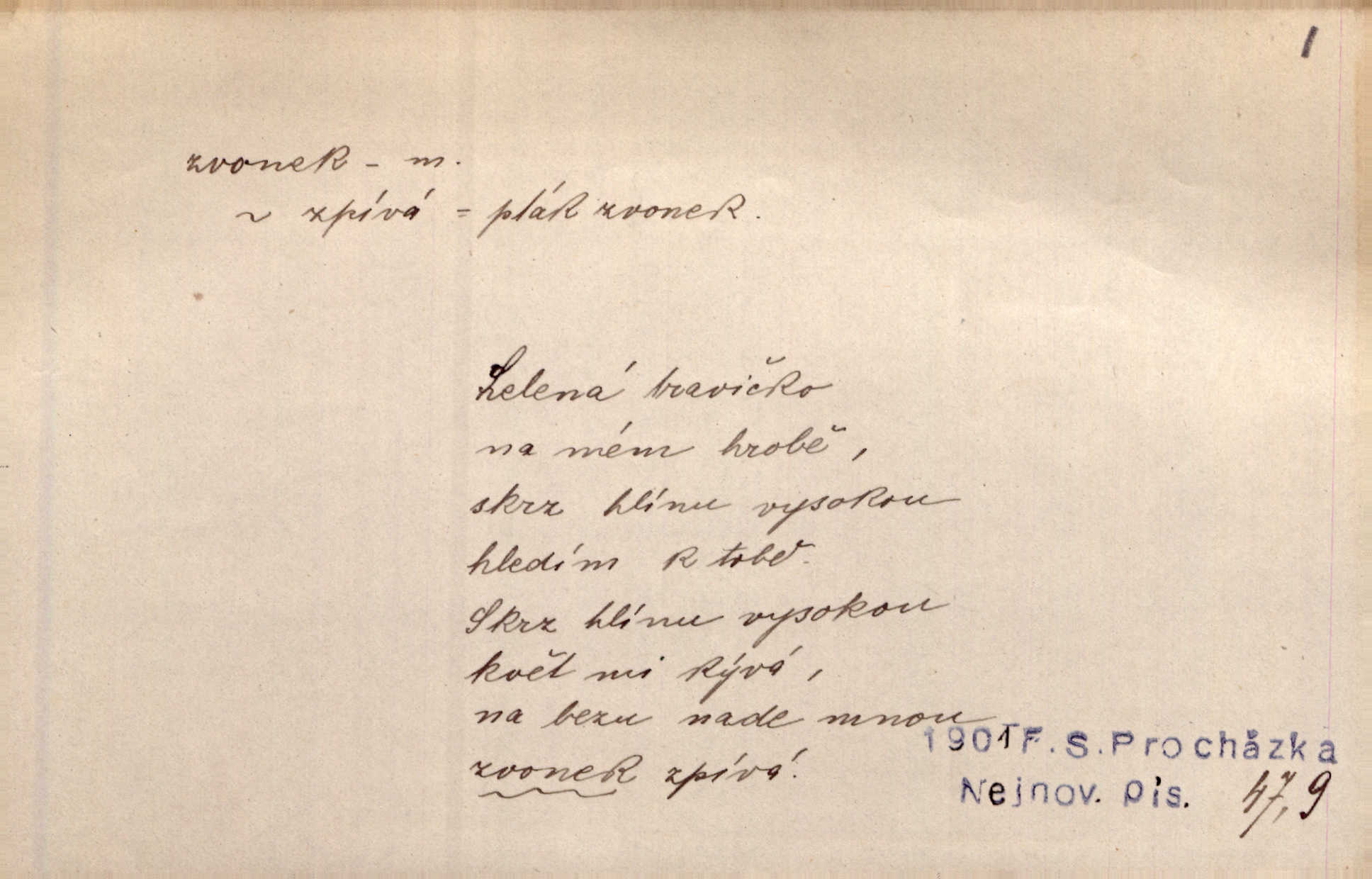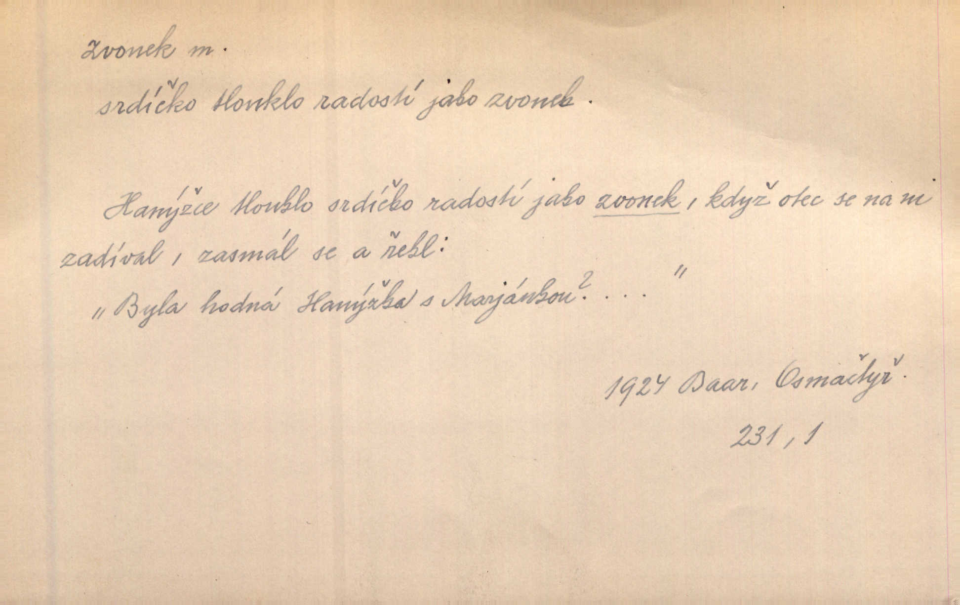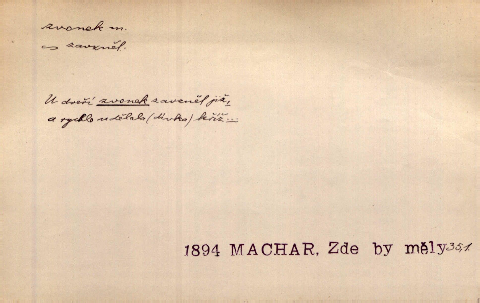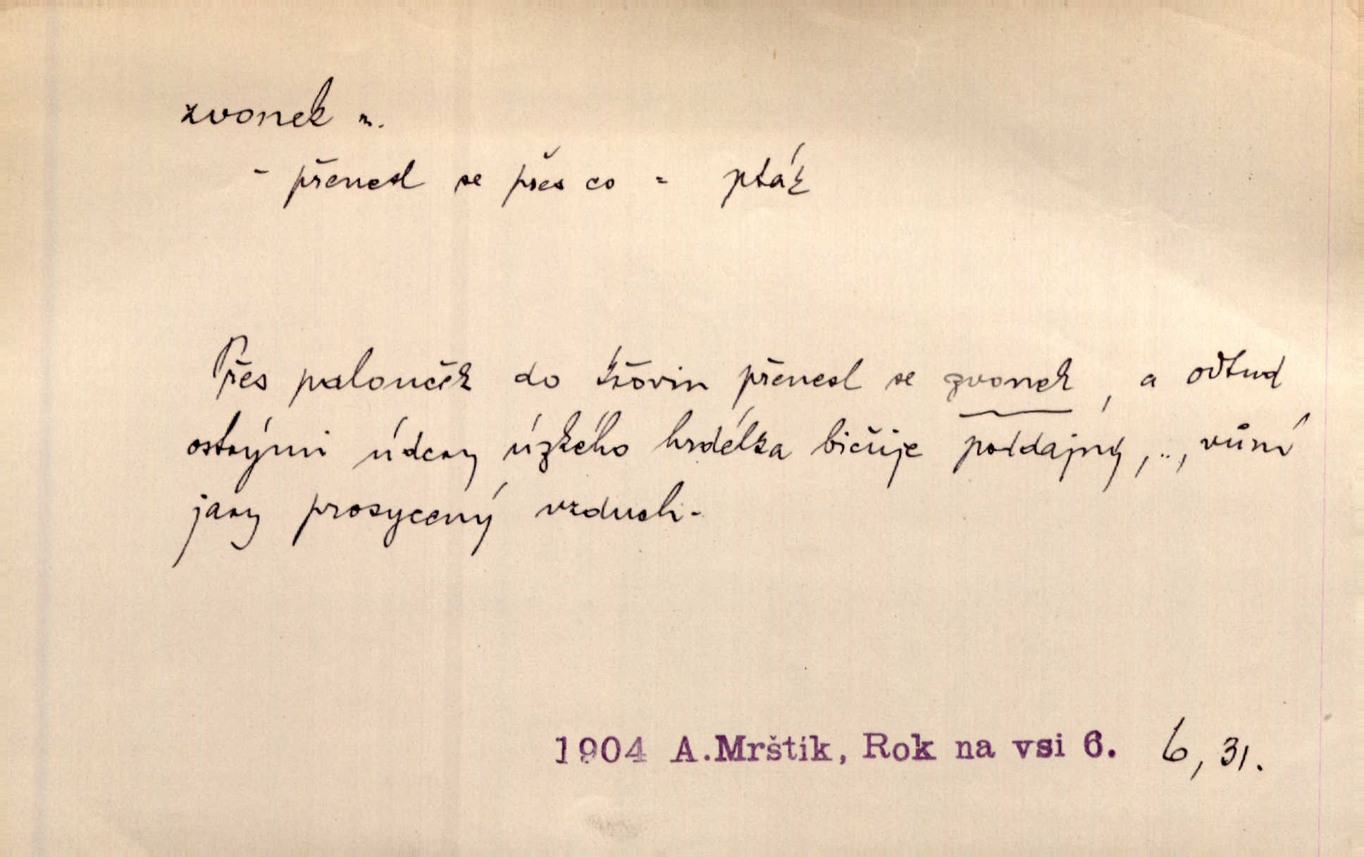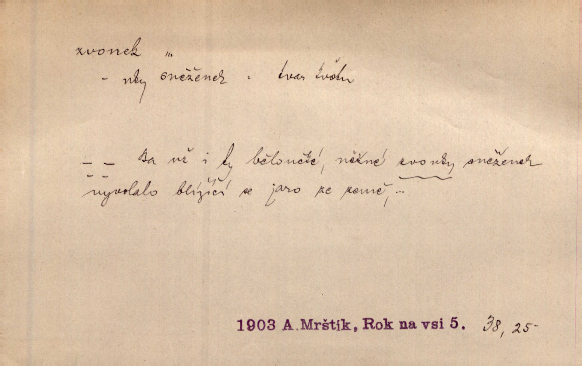 - zvonek, -nku m. zdrob. k zvon; malý zvon. Od Libočan přiletěl hlahol klekání a ve chvilce také na Polánce plačtivě rozklinkal se zvonek. Rais. Za chvilku přicházela tichým vzdechem vlnící se stříbrojasná píseň loretánských zvonků pod staré stromy. Zey. Kněžna pak vzala stříbrný zvonek se stolu a zazvonila. Něm. Jakž si dám pozor, abych zvonkem nezacinknul [při mši] ani jedenkráte více, než je potřebí. Ner. Kolem domků čekal sady, trávníky a lučiny, na nichž prohání se a čistými zvonky vyzvání brav i skot. Herb. U dveří zvonek zavzněl již. Mach. Bylo to chvíli před odjezdem vlaku, mezi cinkáním zvonků a signálů. Dyk. Do nastalé tišiny zařičel najednou zvonek telefonu. Čap. Ch. [Smích] dlouho dušen teď propukl, vesele, jasně, jako stříbrný zvonek. Jir. A hlava [opilého] sem tam jako zvonek se kolíbala. Sab. Hanýžce tlouklo srdíčko radostí jako zvonek, když se na ni zadíval. Baar. Přen. Zvonek jejího hlásku vždy rozechvěný písněmi usnul. R. Svob. V potu tváři sbírat musí [básník] květy slov a rýmů zvonky. Čech. Skřivan sype modré zvonky z blankytu do zelených řádek mladých plodin. Maj. „Ale to jsem ti zas něco vyzvonila, viď?“ „Milá teto, tys takový zvonek, za který ani není třeba tahat, zvoní sám od sebe“ povídavá osoba. Čap. Ch. Časté stonky jisté zvonky zvonění umíráčkem. Přísl. El. tech. elektrický zvonek zvonící zařízení založené na Wagnerově kladívku. Tech. signální (návěstní) zvonek. Pošt. znamení „zvonek“ klapka na dálnopisném stroji, kterou se dává volací znamení. D něco vzhledem připomínajícího zvonek, zvl. květní koruna podobná zvonku. Veliké krůpěje chvěly se v kalíšcích žlutých pryskyřníků, modrých zvonků. Nov. Před nimi kvetly zvonky a mateřídouška. Mah. K tanci lesním ženkám zvoní zvonků květ. Čech. Byl tam mech, jehličí, lesní zvonky. Podl. Bot. rod bylin z čeledi rostlin zvonkovitých, Campanula; zvonek rozkladitý. D olivově zeleně zbarvený zpěvavý pták. Hnízdí tu šoupálek, slavíci, zvonci, stehlíci a konopky. Mah. Na bezu nade mnou zvonek zpívá. F. S. Proch. Přes palouček do křovin přenesl se zvonek a odtud ostrými údery úzkého hrdélka bičuje vzduch. A. Mrš. Zool. rod ptáků z čeledi Fringillidae, Chloris; zvonek obecný.
