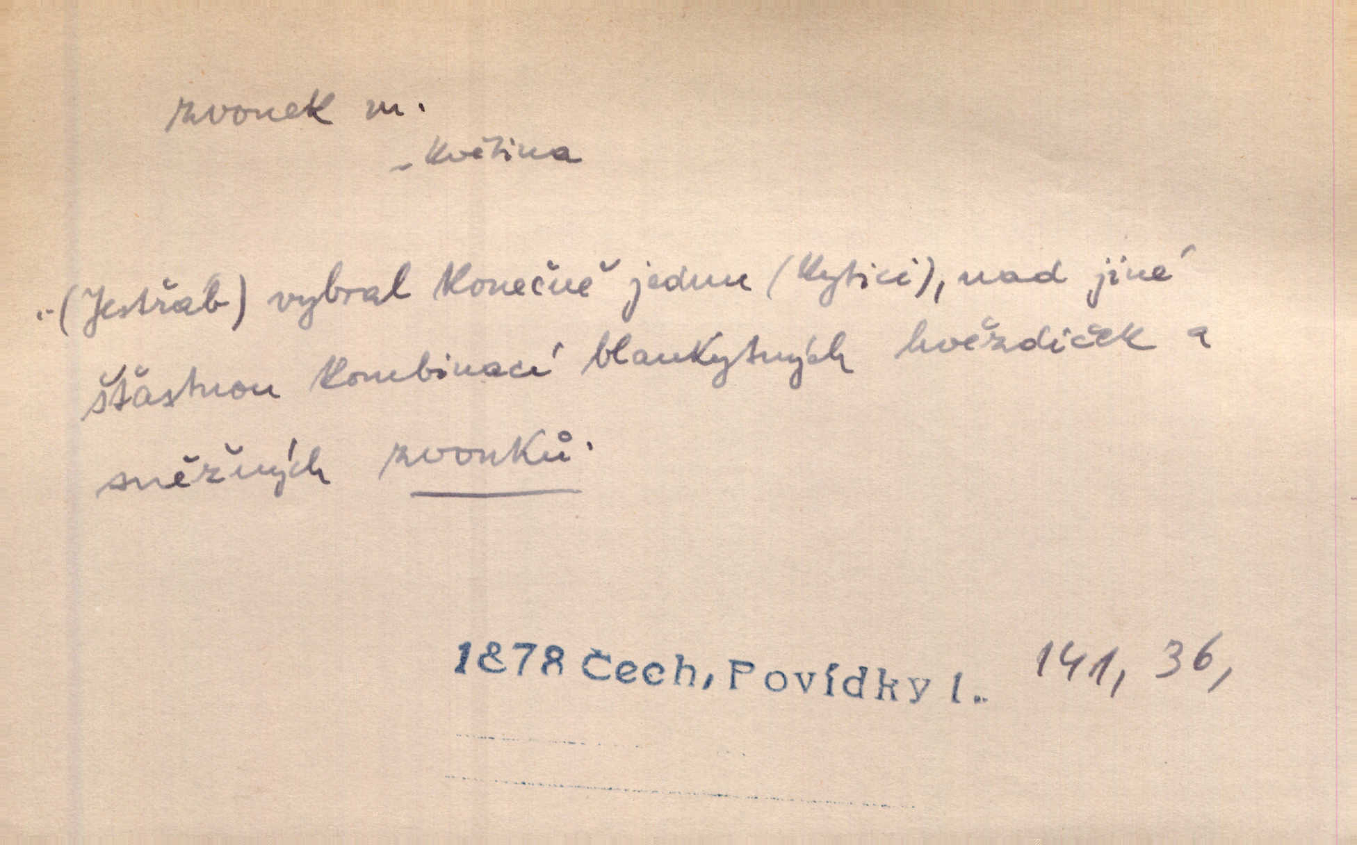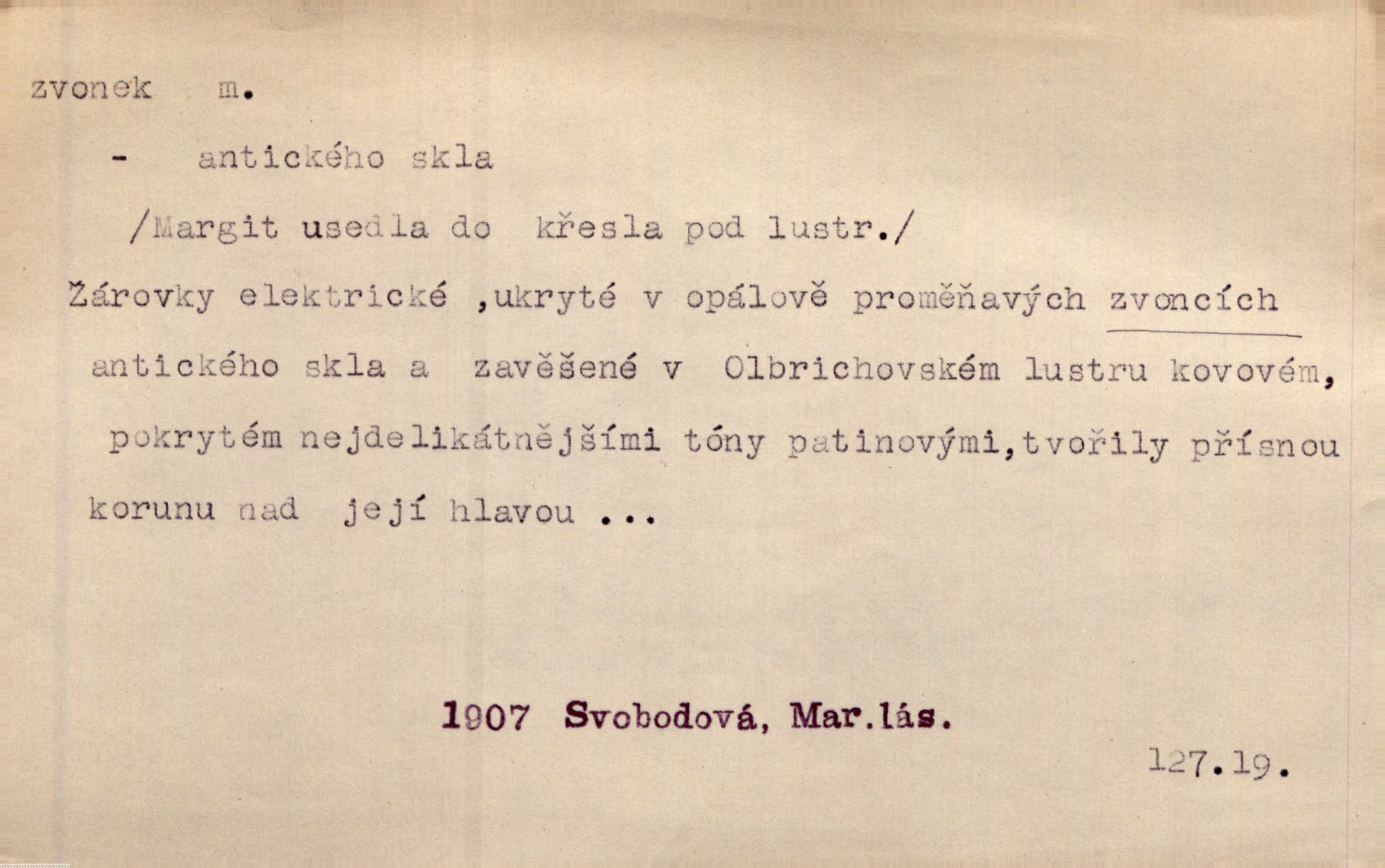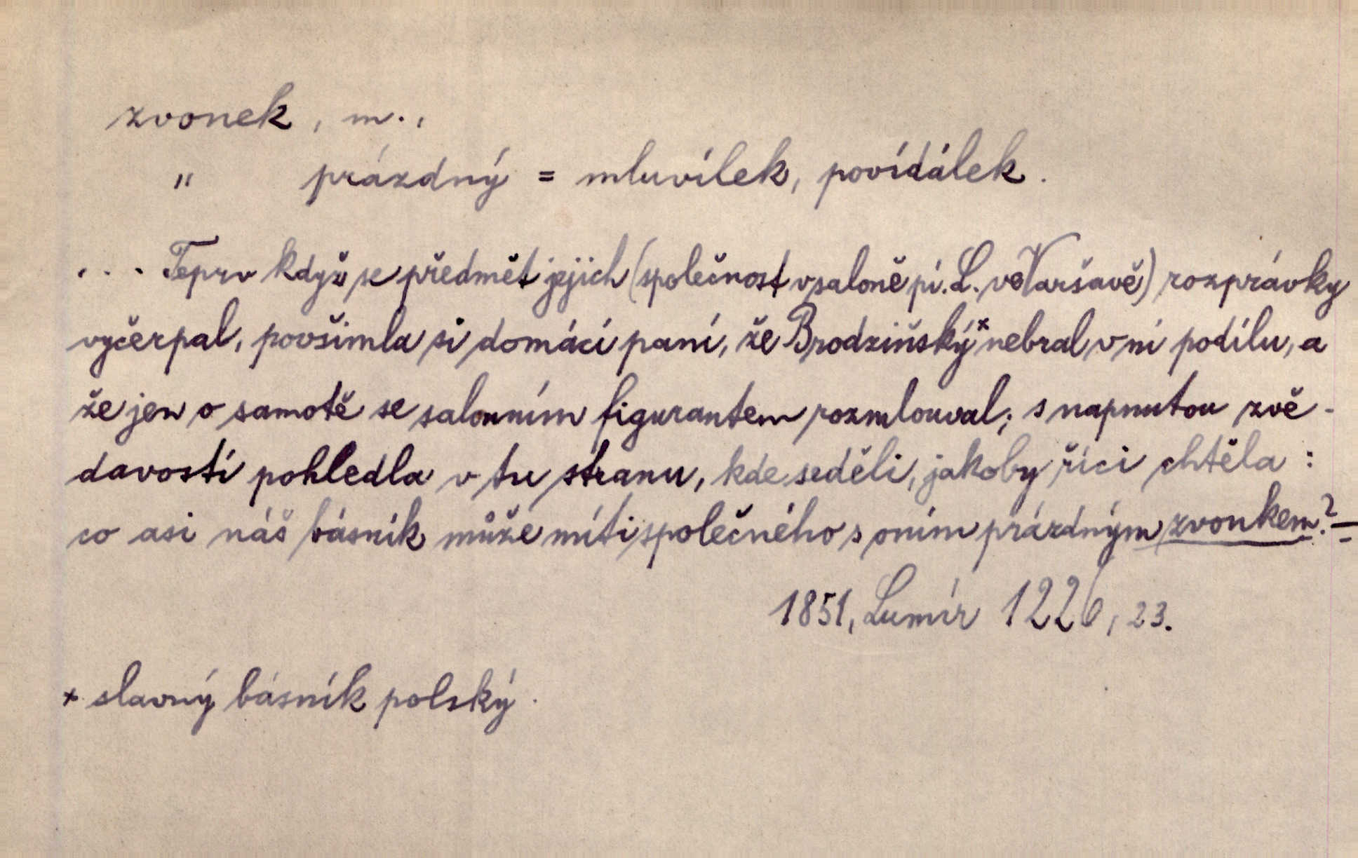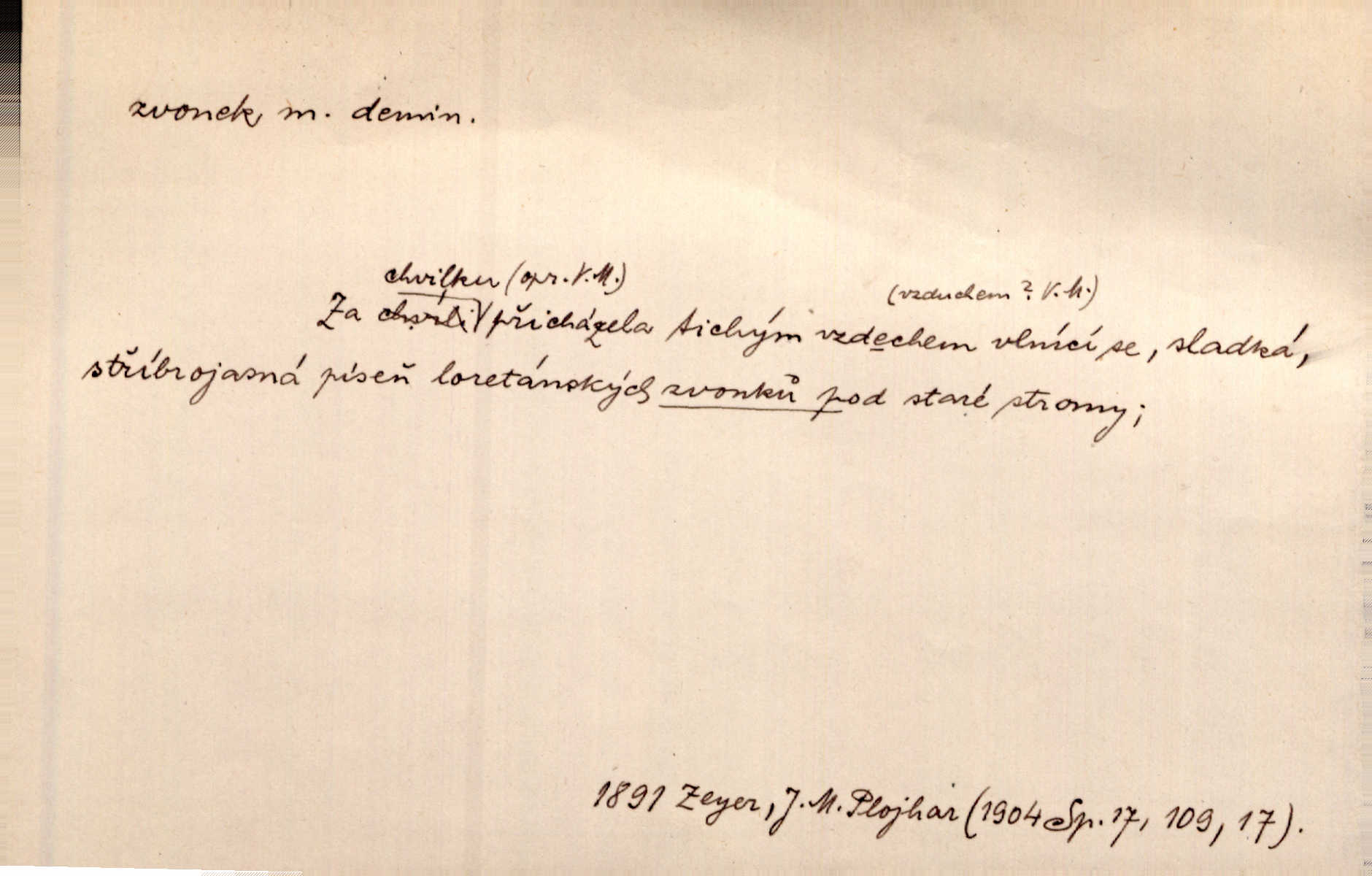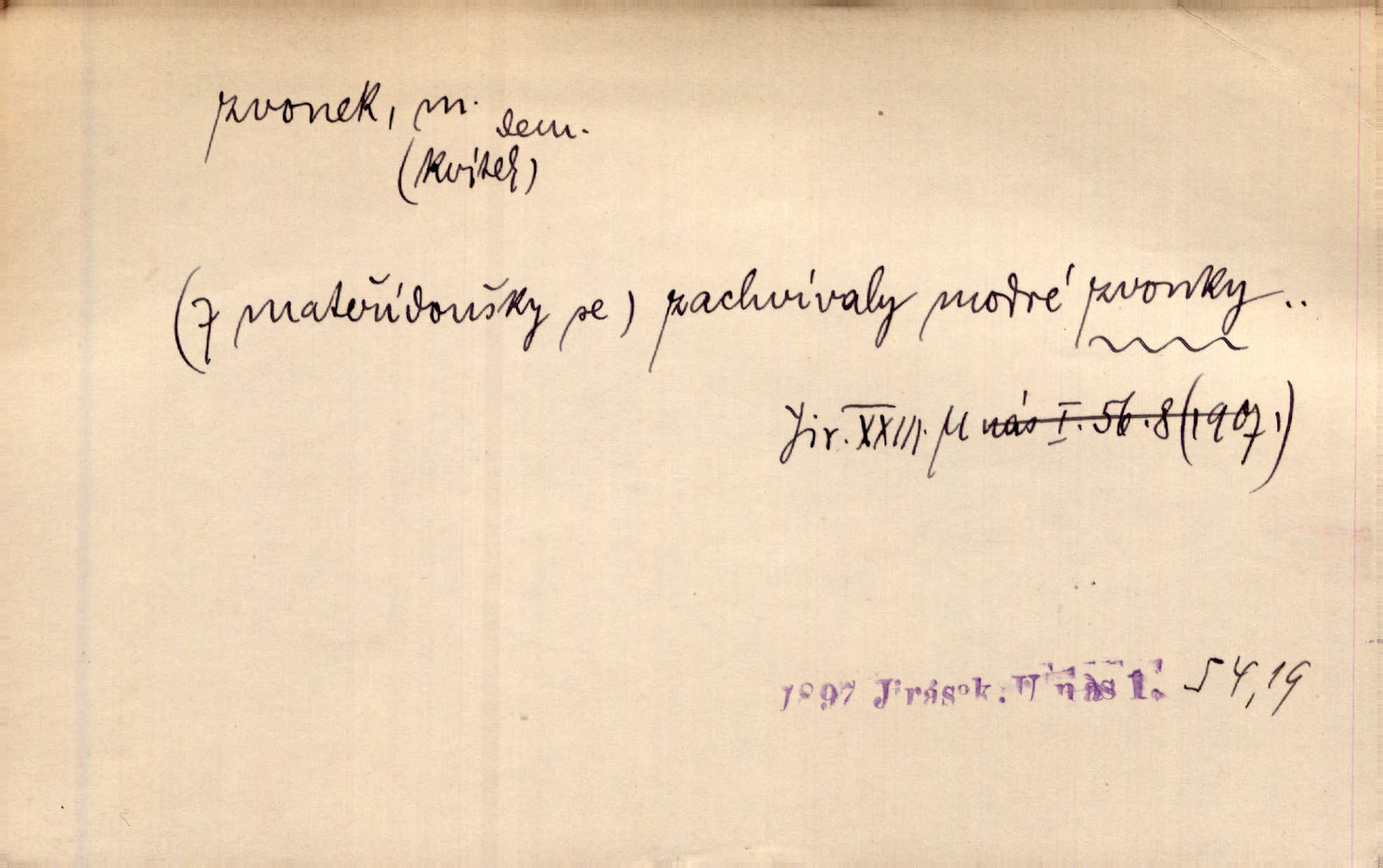 - zvonek, -nku m. zdrob. k zvon; malý zvon. Od Libočan přiletěl hlahol klekání a ve chvilce také na Polánce plačtivě rozklinkal se zvonek. Rais. Za chvilku přicházela tichým vzdechem vlnící se stříbrojasná píseň loretánských zvonků pod staré stromy. Zey. Kněžna pak vzala stříbrný zvonek se stolu a zazvonila. Něm. Jakž si dám pozor, abych zvonkem nezacinknul [při mši] ani jedenkráte více, než je potřebí. Ner. Kolem domků čekal sady, trávníky a lučiny, na nichž prohání se a čistými zvonky vyzvání brav i skot. Herb. U dveří zvonek zavzněl již. Mach. Bylo to chvíli před odjezdem vlaku, mezi cinkáním zvonků a signálů. Dyk. Do nastalé tišiny zařičel najednou zvonek telefonu. Čap. Ch. [Smích] dlouho dušen teď propukl, vesele, jasně, jako stříbrný zvonek. Jir. A hlava [opilého] sem tam jako zvonek se kolíbala. Sab. Hanýžce tlouklo srdíčko radostí jako zvonek, když se na ni zadíval. Baar. Přen. Zvonek jejího hlásku vždy rozechvěný písněmi usnul. R. Svob. V potu tváři sbírat musí [básník] květy slov a rýmů zvonky. Čech. Skřivan sype modré zvonky z blankytu do zelených řádek mladých plodin. Maj. „Ale to jsem ti zas něco vyzvonila, viď?“ „Milá teto, tys takový zvonek, za který ani není třeba tahat, zvoní sám od sebe“ povídavá osoba. Čap. Ch. Časté stonky jisté zvonky zvonění umíráčkem. Přísl. El. tech. elektrický zvonek zvonící zařízení založené na Wagnerově kladívku. Tech. signální (návěstní) zvonek. Pošt. znamení „zvonek“ klapka na dálnopisném stroji, kterou se dává volací znamení. D něco vzhledem připomínajícího zvonek, zvl. květní koruna podobná zvonku. Veliké krůpěje chvěly se v kalíšcích žlutých pryskyřníků, modrých zvonků. Nov. Před nimi kvetly zvonky a mateřídouška. Mah. K tanci lesním ženkám zvoní zvonků květ. Čech. Byl tam mech, jehličí, lesní zvonky. Podl. Bot. rod bylin z čeledi rostlin zvonkovitých, Campanula; zvonek rozkladitý. D olivově zeleně zbarvený zpěvavý pták. Hnízdí tu šoupálek, slavíci, zvonci, stehlíci a konopky. Mah. Na bezu nade mnou zvonek zpívá. F. S. Proch. Přes palouček do křovin přenesl se zvonek a odtud ostrými údery úzkého hrdélka bičuje vzduch. A. Mrš. Zool. rod ptáků z čeledi Fringillidae, Chloris; zvonek obecný.
